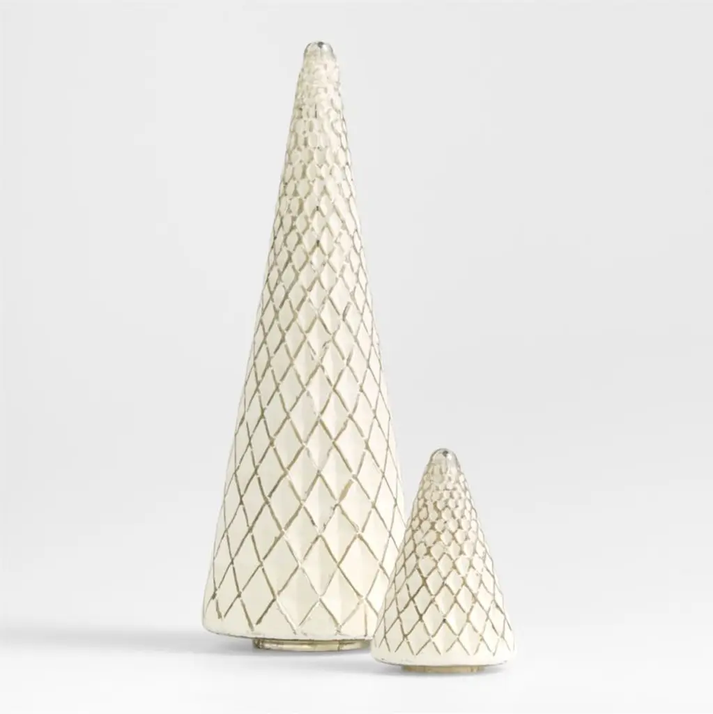 Create a wintry wonderland on your mantel, buffet or dining room table with our glass tree collection. A matte winter-white coating on the interior brings the fluted contrast and molded lattice pattern of the antique silver mercury glass into wintery contrast. We love the subtle way the extra-small tree shines in the glow of candles and string lights.