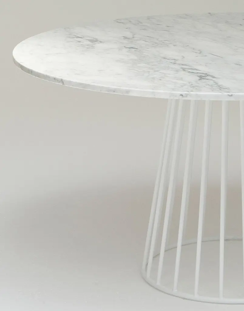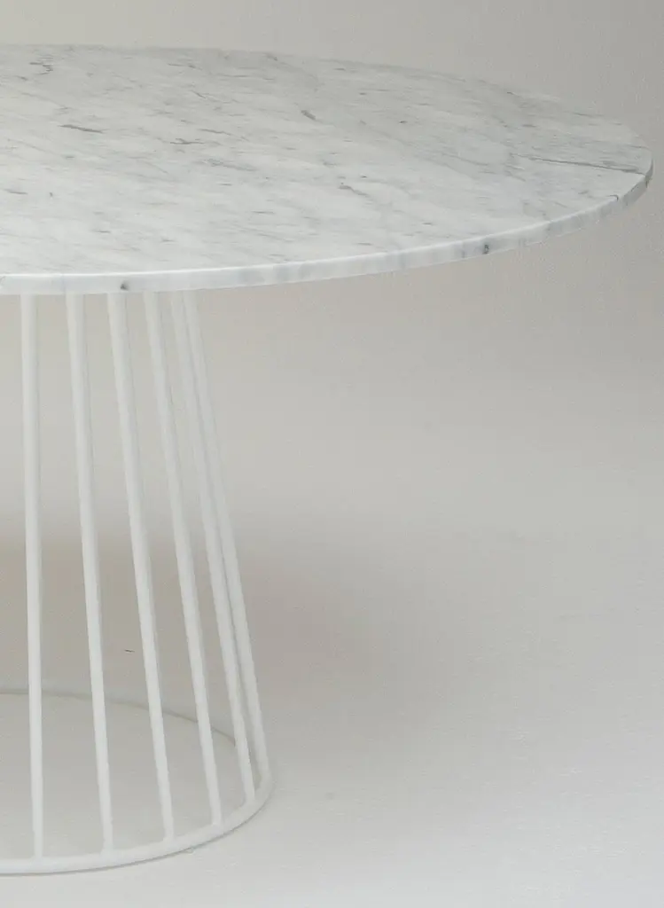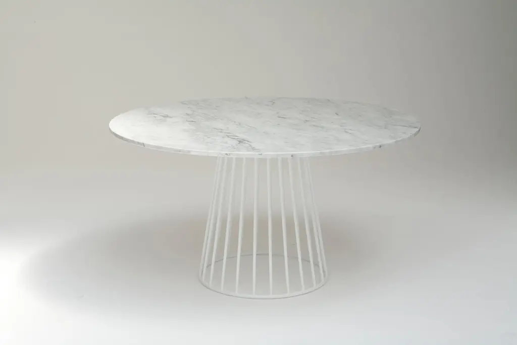 Wired Large Dining Table by Phase DesignDimensions: Ø 152.4 x H 73 cm. Materials: Powder-coated metal and white Carrara marble.Solid steel bar with marble or solid wooden tops. Steel bar available in gloss or flat white and black powder coat, polished chrome, burnt copper, or smoked brass finish. Powder coat finishes also available in custom colors. Marble top available in white carrara or negro marquina, with polished or honed finish. Wood top available in walnut, white oak, or ebonized oak. Prices may vary. Please contact us.Blending sloping angles and taut lengths of bent metal are a modern interpretation of the wiry idea initially conceived by Warren Platner. This dynamic dining table will be the conversation starter at your next dinner party.Autodidact award-winning designer Reza Feiz has always been drawn to the strength in simplicity. Lured to Southern California by its inventive, creative spirit, he quickly discovered his true calling among the vast community of creators and artisans whose skills and ingenuity expertly transform imagination into reality.Inspired by Los Angeles’ iconic landscape and the compelling beauty of the places and spaces he encountered, he envisioned furniture, lighting and tabletop accessories, fabricating them from contemporary materials with the help of a tightly knit coterie of craftspeople.The resulting restrained yet revolutionary pieces have garnered enthusiasm from an international audience.He’s been lauded as “An American designer who influences world design”, a “Style Pioneer” and “One of a group of select young designers who represent the leading edge of discovery in design.” Architectural Digest’s Mayer Rus noted that his “wide-ranging collections make a strong case for the enduring appeal of restrained modern design.” Surface Magazine raved that he “imbues his work with a 21st-century edge. His astute sense of restraint keeps the designs relevant in a constantly evolving industry, without needing to subscribe to trends.”“Reza Feiz imbues his work with a 21st-century edge. His astute sense of restraint keeps the designs relevant in a constantly evolving industry, without needing to subscribe to trends.”