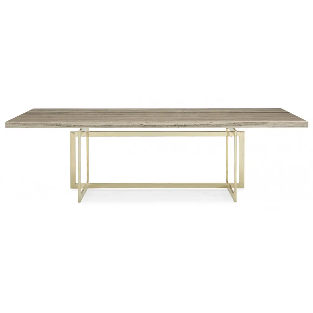 Because not all dining rooms are created equal, there’s the Wish You Were Here table. An extraordinary example of organic luxe, it offers an ultra-impressive 100-inch tabletop of gray sandstone. Earthy tones meld with greiges and soft grays to create a visual that’s sleek and modern while still feeling warm and natural. A bold, open geometric base finished in Whisper of Gold creates a mix of materials and brings in the glamour. With a dining room table this stunning, you’ll hesitate to cover it!
