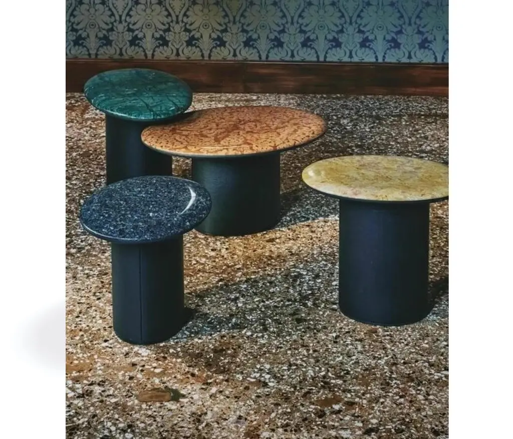 At the time of the Wiener Werkstätte around the 1900s, Josef Hoffmann designed extravagant brooches made in traditional craftsmanship. These colorful time- lessly beautiful jewelry inspired Luca Nichetto to create this extraordinary table collection. The elliptical plates in rare colored marble varieties can be arranged into each other, they thus playfully create very special table- scapes. In addition to the side table group, a variant in dining table height is also available..The colorful brooches of Josef Hoffmann inspired Luca Nichetto to this extraordinary table collection. The elliptical plates can be arranged into variable tablescapes. In addition to the side table group, a variant in dining table height is also available.Base: leather covered color black glides: felted glides.
