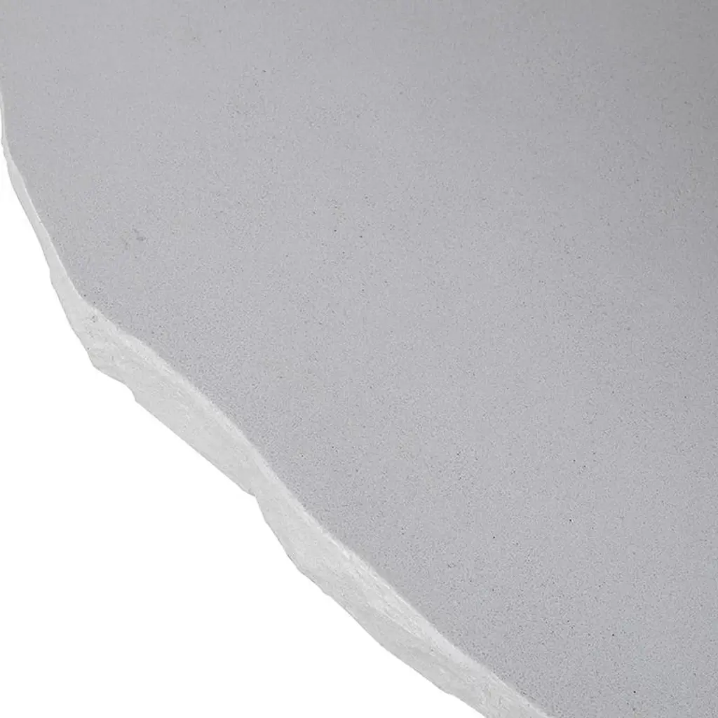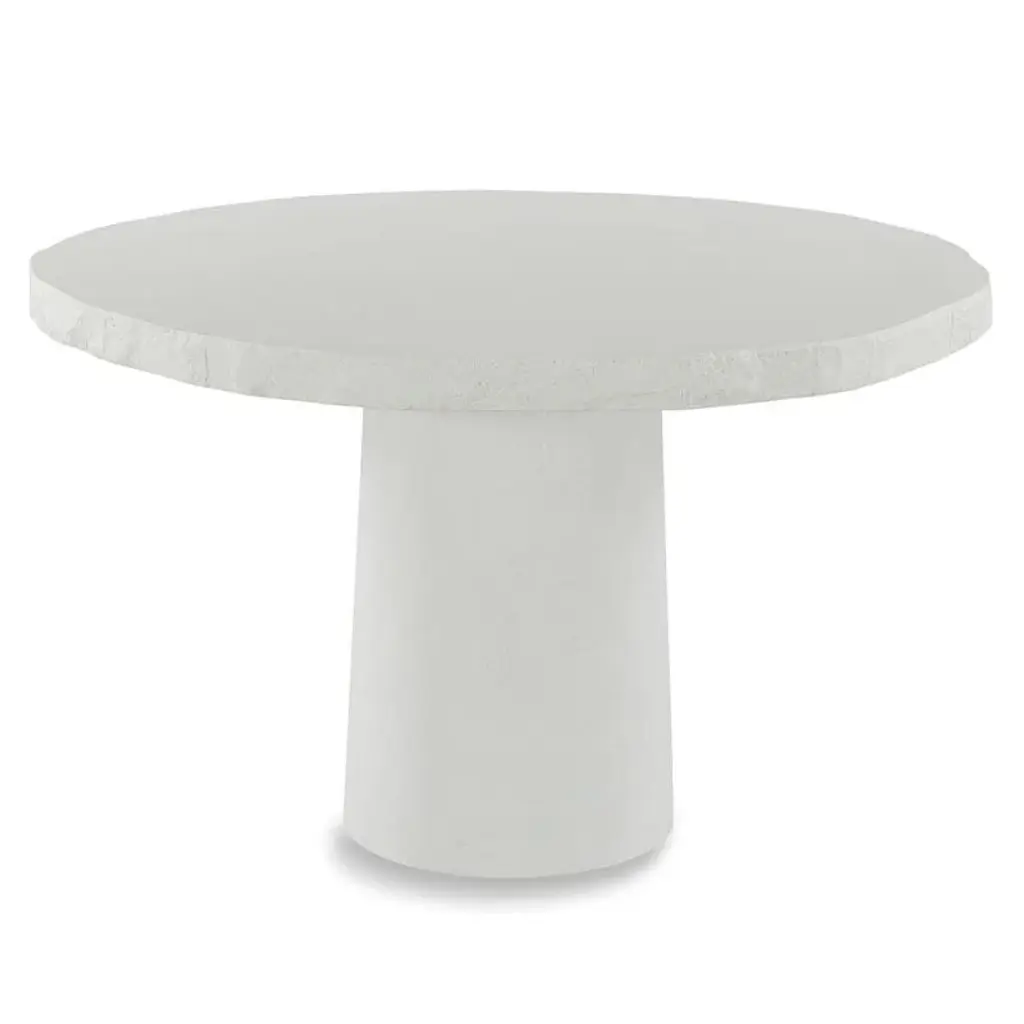 A sturdy table for outdoor dining with a round stone top with a rough hewn edge rests over an ample cast stone pedestal base. Care Instructions: Wipe with a soft clean cloth