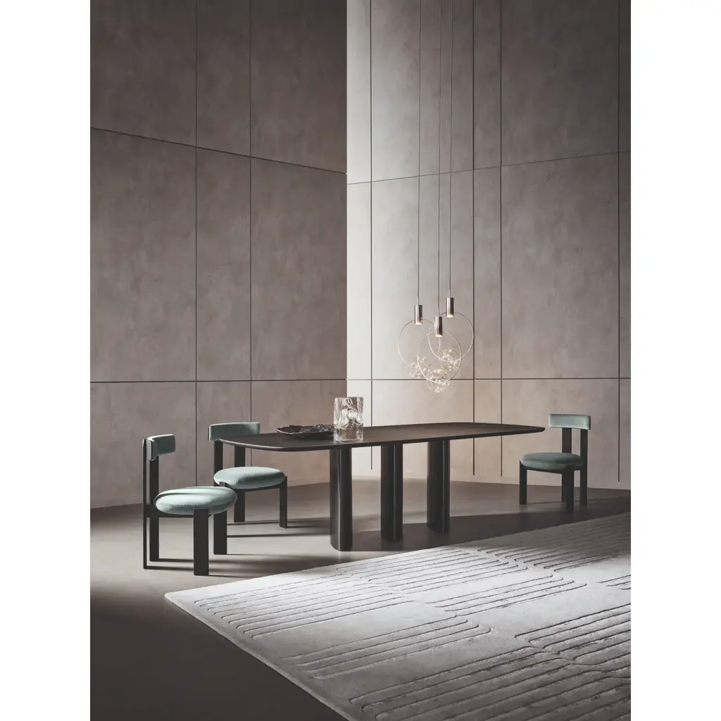 Designed by Alain Gilles, the Louver Table reveals its character little by little, offering a different perspective depending on the angle from which it is observed. With its strong theatrical presence making it the focal point of any environment, the Louver Table interprets the vision of the designer, who wants to evoke an imaginary passage, ideally the entrance to an ancient temple, in which light plays a crucial role in creating suggestive shadows on the floor. The three legs give the table a feeling of dynamism, allowing the light to create fascinating perspective effects which make the legs appear either slender or imposing, delicate curves or generous shapes, depending on the point from which you look at it. The design of the table is enhanced by the different finishes available, both in the single-material and multi-material versions. The single-material version is available in hand-trowelled clay or with a wooden top and base. Alternatively, it is possible to choose from numerous variations: the top is available in ceramic, marble or wood and can be combined with a metal or wooden base (Louver Table Wood), creating a contrast of considerable scenic impact with the solid elements of the base.