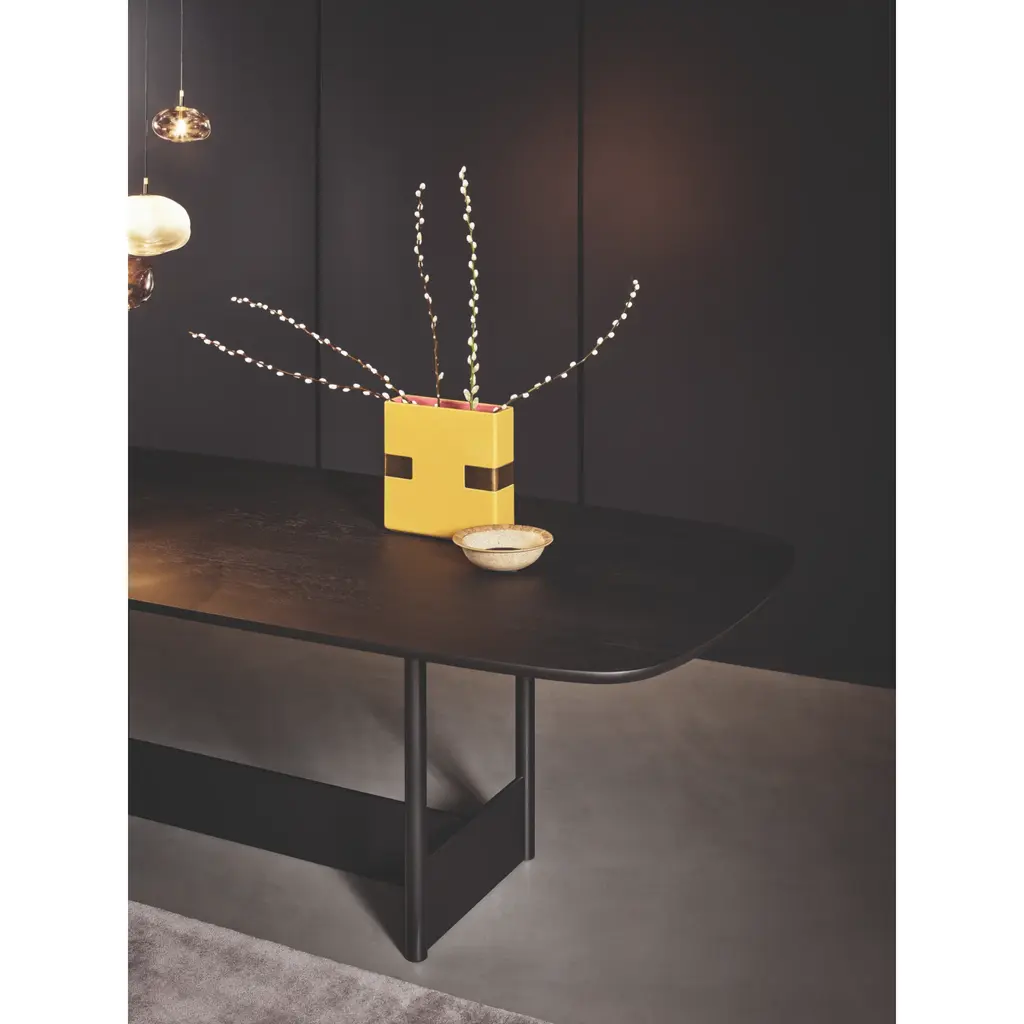 Designed by Alain Gilles, the Canvas Table stands out for its bold personality, sober lines and surprising proportions. The barrel-shaped top features generous curves and a minimal, linear design, which gives an overall sensation of continuity and fluidity. The top blends harmoniously with the base, just like a freshly painted work of art on steel easels. The architecture of the base, rigorous and at the same time unexpected, sees all the metal elements converge and connect to form a solid but never bulky structure. The result is a table with distinctive harmony that transmits a sensation of lightness, through a design that aims to challenge conventions and transform the perception of the visual weight of this piece of furniture.