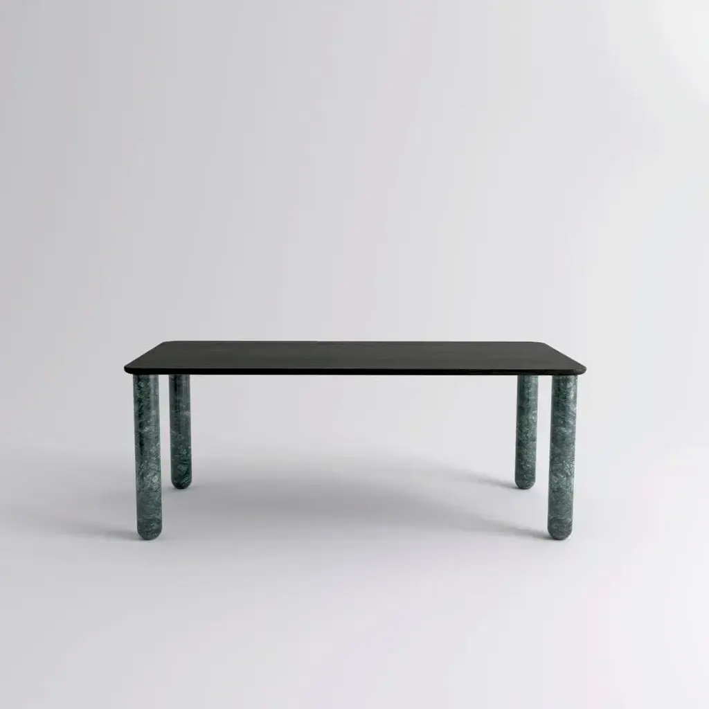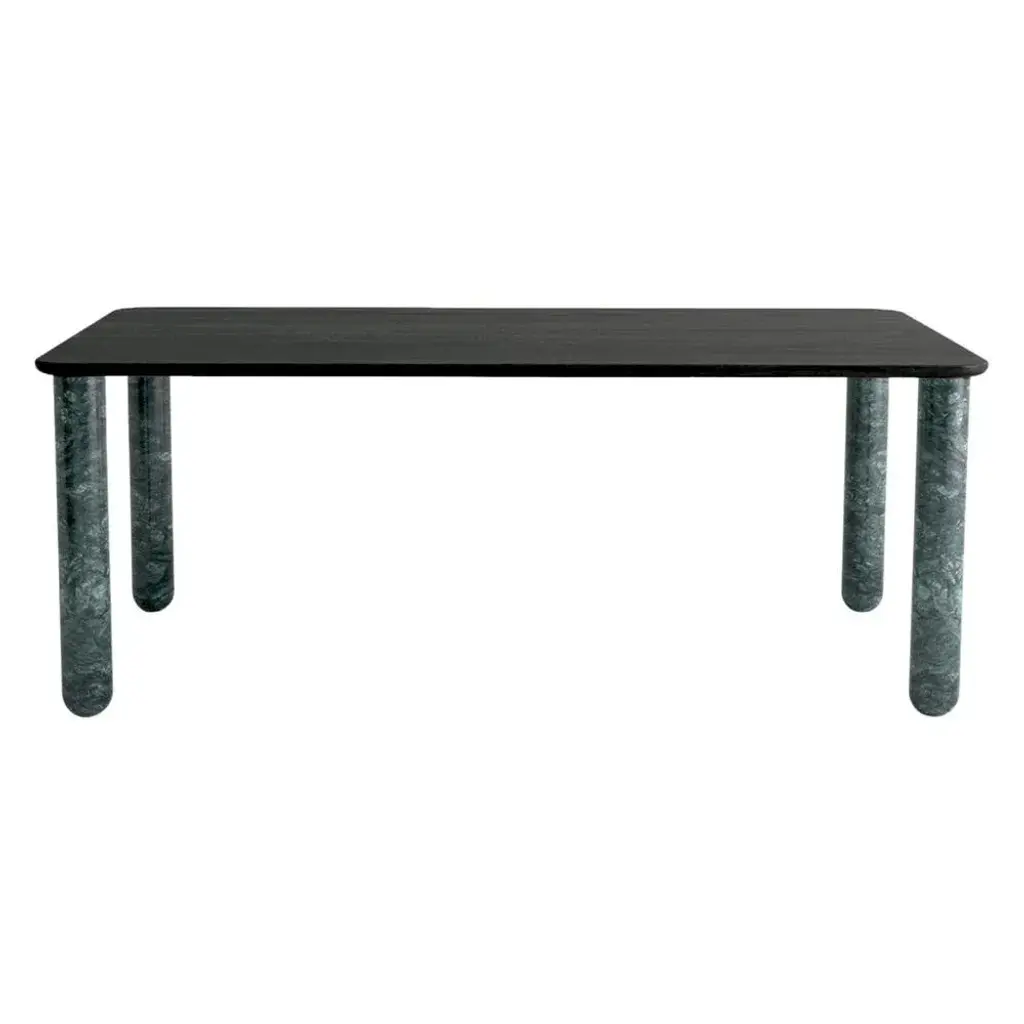XLarge black wood and green marble "Sunday" dining table, Jean-Baptiste Souletie Dimensions: 200 W x 100 D x 74.5 H cm Materials: Indian Green marble legs, black stained wood top. Different finishes and sizes are available. Sunday is a family of dinner tables, coffee tables and consoles with a simple and sculptural design. The mix of heavy marble legs and a thin solid wood top creates an interesting contrast while the rounded edges and generous proportions provide a comforting feeling. Sunday is all about the materials: 3 marbles and 2 woods are available in the collection. Sunday comes in a wide variety of dimensions and 2 different marble legs heights to perfectly fit your interior whether you need a small coffee table, a large one, a console, or even a dinner table that will seat 10 guests on a friendly Sunday lunch.