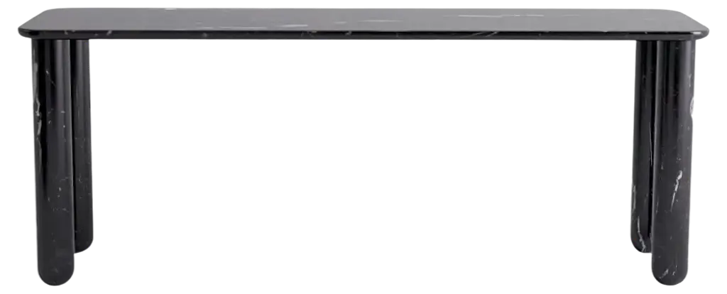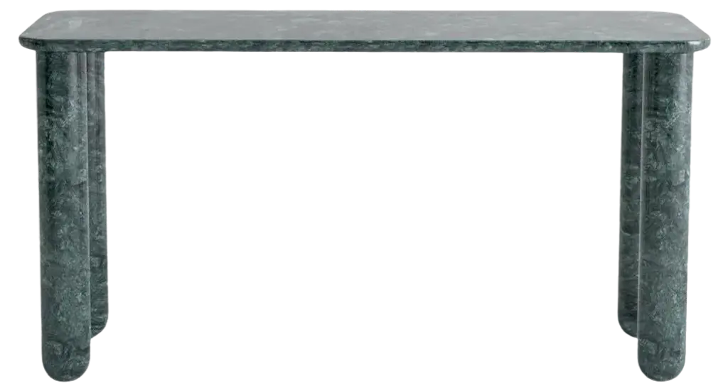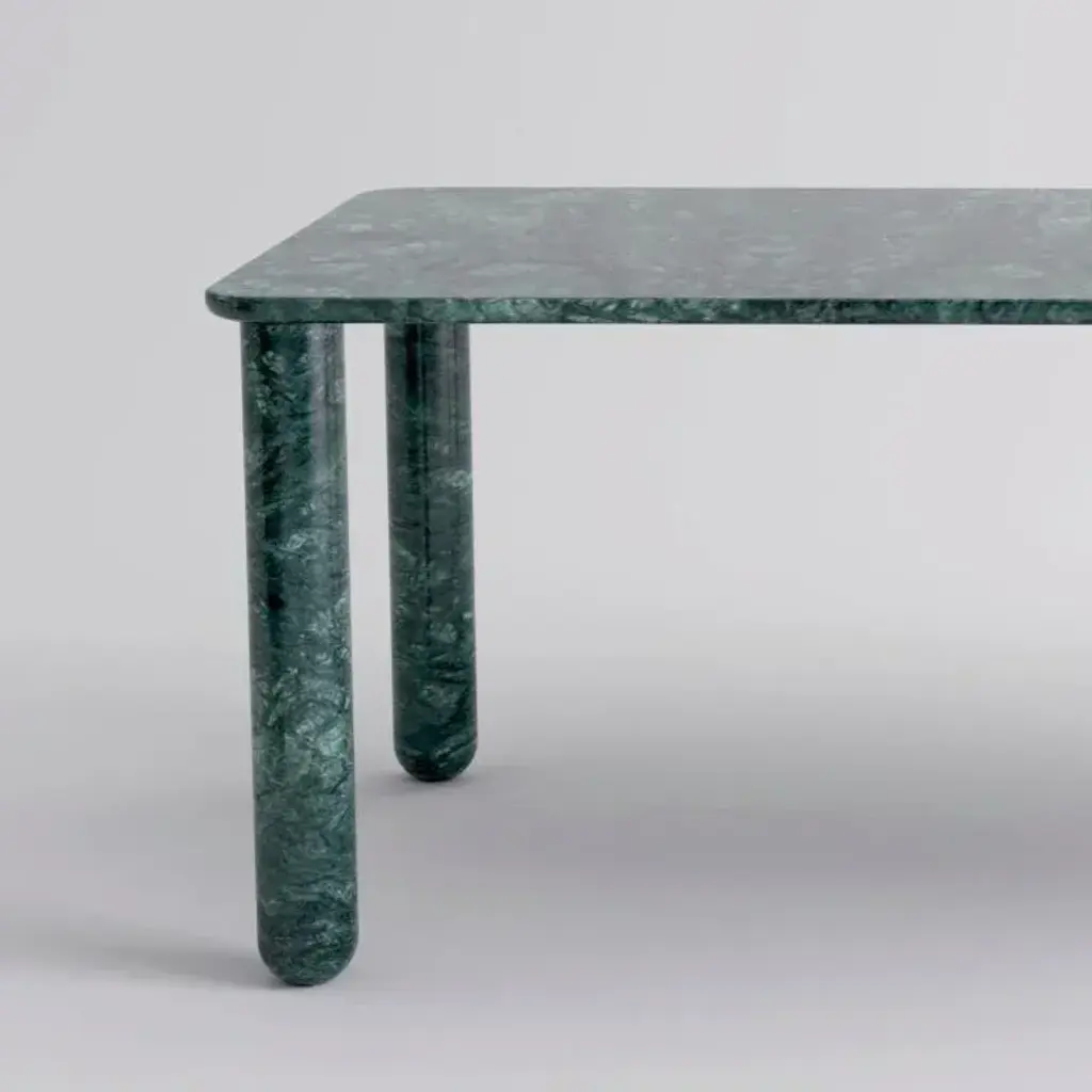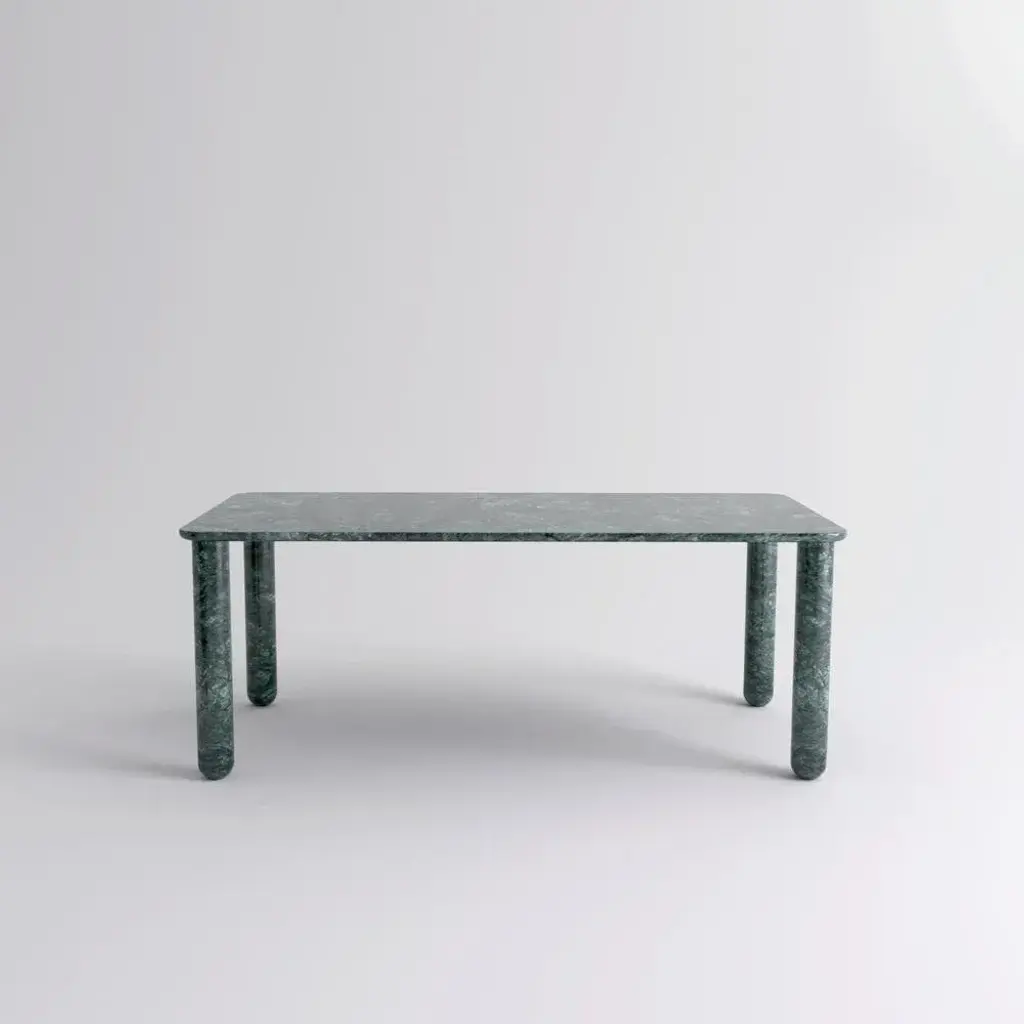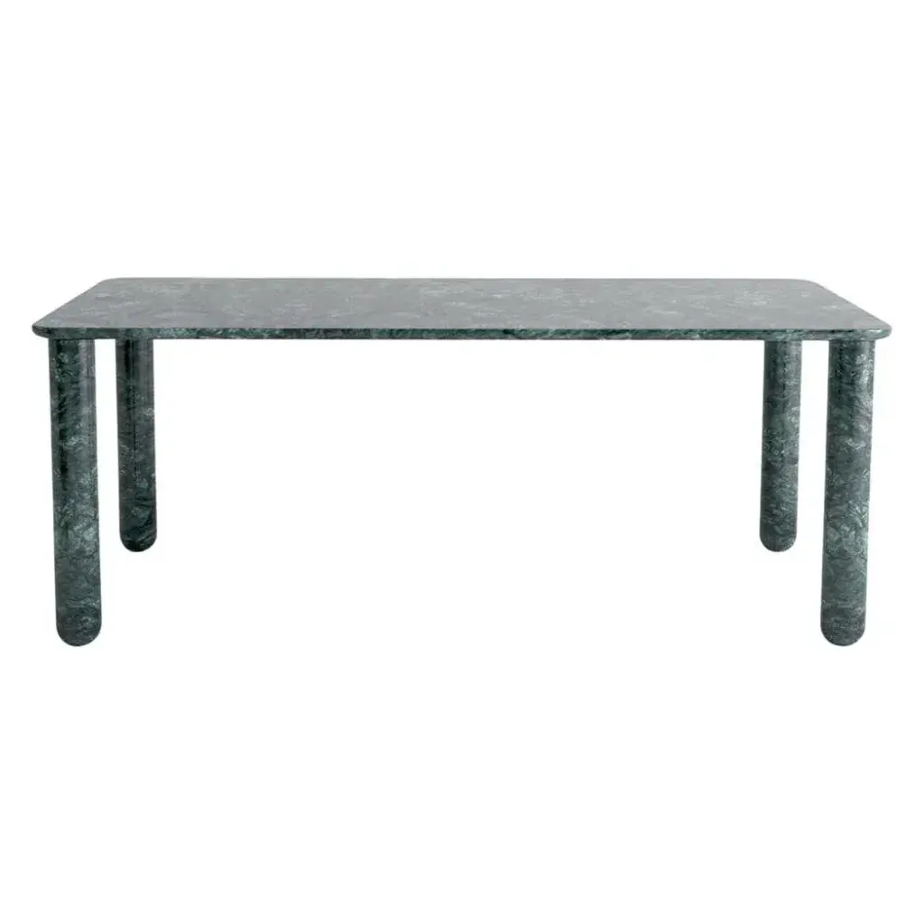 XLarge green marble "Sunday" dining table, Jean-Baptiste Souletie Dimensions: 200 W x 100 D x 74.5 H cm Materials: Indian Green marble. Different finishes and sizes are available. Sunday is a family of dinner tables, coffee tables and consoles with a simple and sculptural design. The mix of heavy marble legs and a thin solid wood top creates an interesting contrast while the rounded edges and generous proportions provide a comforting feeling. Sunday is all about the materials: 3 marbles and 2 woods are available in the collection. Sunday comes in a wide variety of dimensions and 2 different marble legs heights to perfectly fit your interior whether you need a small coffee table, a large one, a console, or even a dinner table that will seat 10 guests on a friendly Sunday lunch.