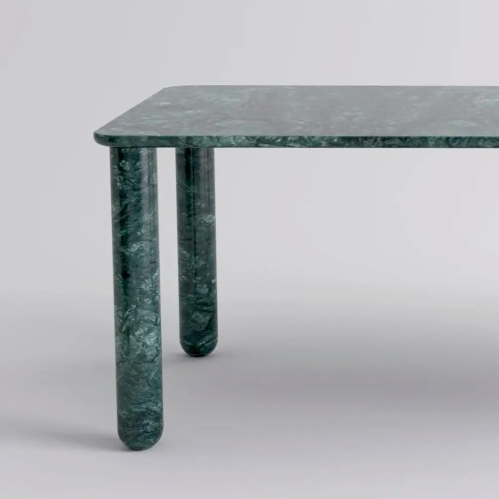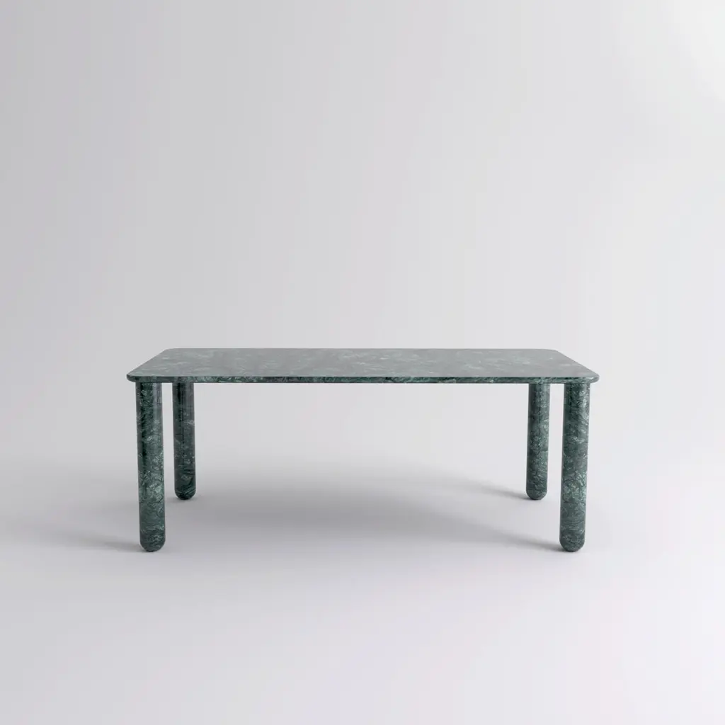 XLarge green marble "Sunday" dining table, Jean-Baptiste SouletieDimensions: 200 W x 100 D x 74.5 H cmMaterials: Indian Green marble.Different finishes and sizes are available.Sunday is a family of dinner tables, coffee tables and consoles with a simple and sculptural design. The mix of heavy marble legs and a thin solid wood top creates an interesting contrast while the rounded edges and generous proportions provide a comforting feeling.Sunday is all about the materials: 3 marbles and 2 woods are available in the collection.Sunday comes in a wide variety of dimensions and 2 different marble legs heights to perfectly fit your interior whether you need a small coffee table, a large one, a console, or even a dinner table that will seat 10 guests on a friendly Sunday lunch.Jean-Baptiste Souletie is the Co-founder of the furniture editor La Chance with Louise Breguet. He studied in India, worked for a merchant bank in London (where he designed their new offices), before working for an investment fund (where he redevised the graphic chart), and in the strategic department of a luxury goods company in Paris. He returned to his first loves, architecture and furniture, when he founded La Chance in 2012.