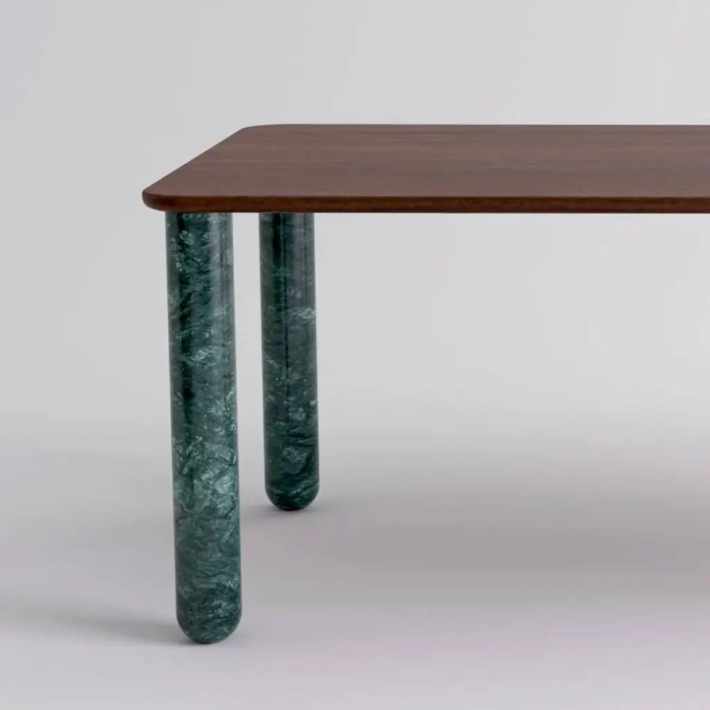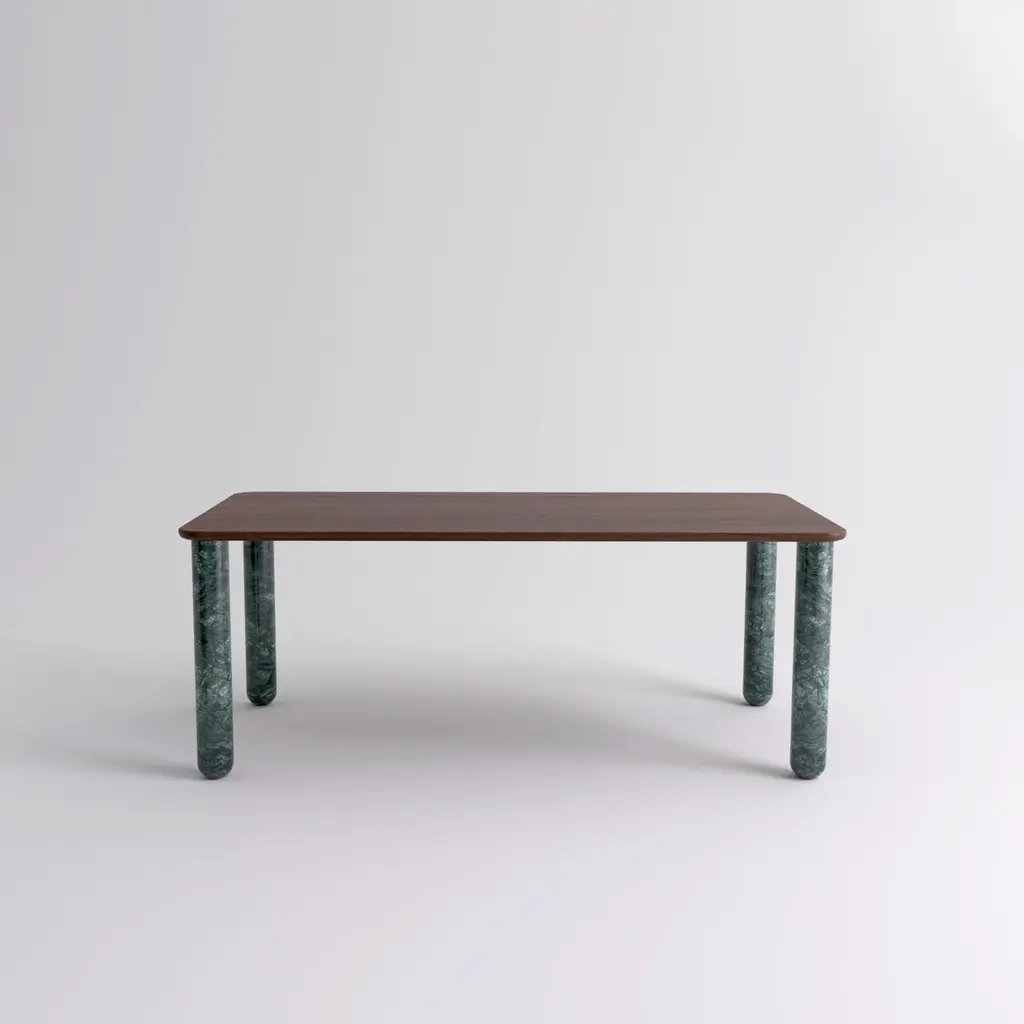 Xlarge walnut and green marble "Sunday" dining table, Jean-Baptiste Souletie.Dimensions: 200 W x 100 D x 74.5 H cm.Materials: Indian green marble legs, walnut wood top.Different finishes and sizes are available.Sunday is a family of dinner tables, coffee tables and consoles with a simple and sculptural design. The mix of heavy marble legs and a thin solid wood top creates an interesting contrast while the rounded edges and generous proportions provide a comforting feeling.Sunday is all about the materials: 3 marbles and 2 woods are available in the collection.Sunday comes in a wide variety of dimensions and 2 different marble legs heights to perfectly fit your interior whether you need a small coffee table, a large one, a console, or even a dinner table that will seat 10 guests on a friendly Sunday lunch.Jean-Baptiste Souletie is the Co-founder of the furniture editor La Chance with Louise Breguet. He studied in India, worked for a merchant bank in London (where he designed their new offices), before working for an investment fund (where he redevised the graphic chart), and in the strategic department of a luxury goods company in Paris. He returned to his first loves, architecture and furniture, when he founded La Chance in 2012.