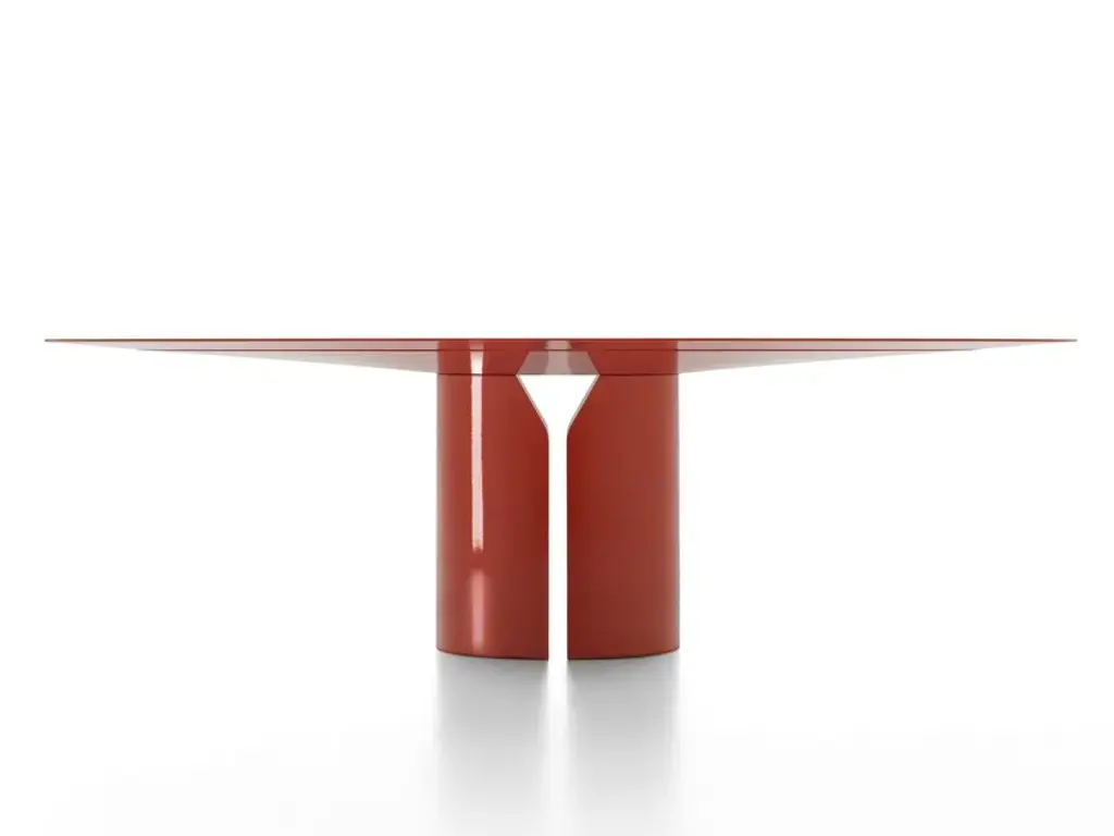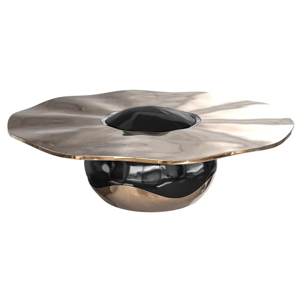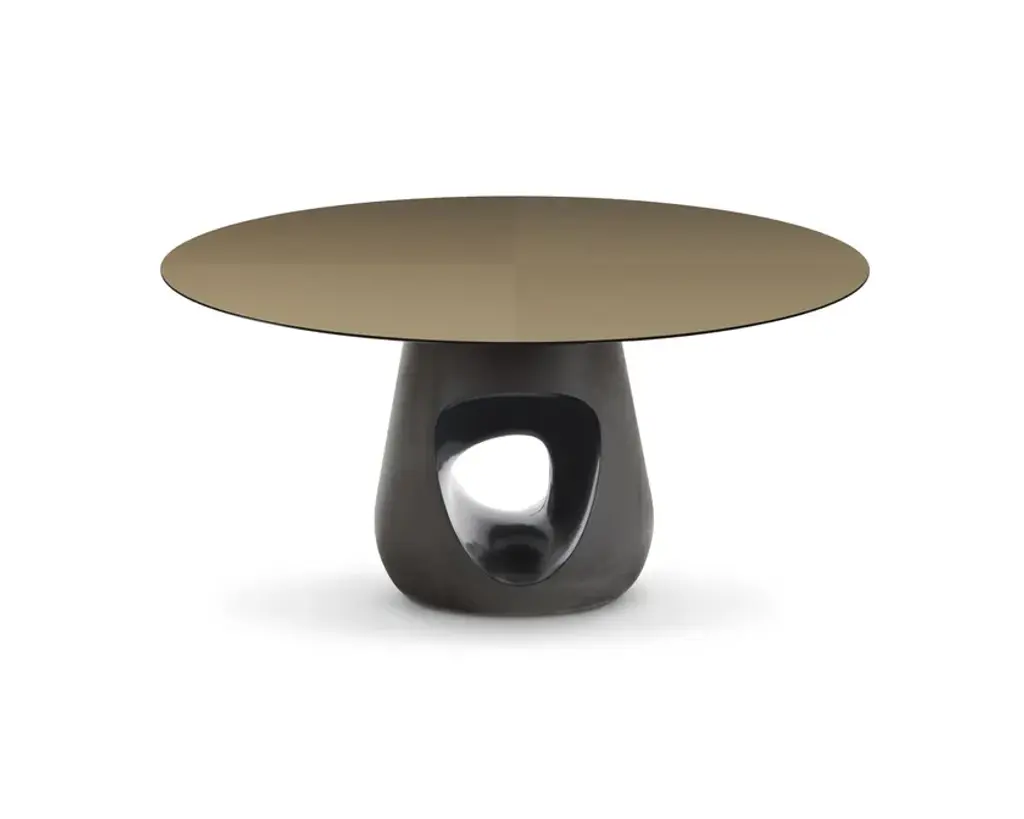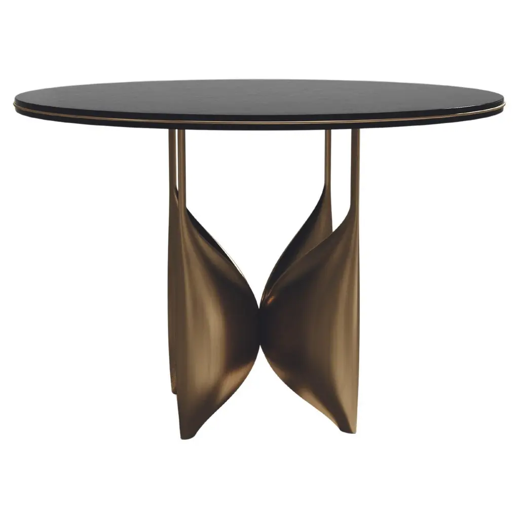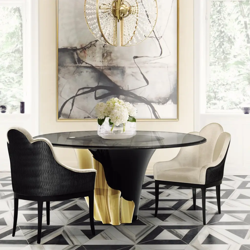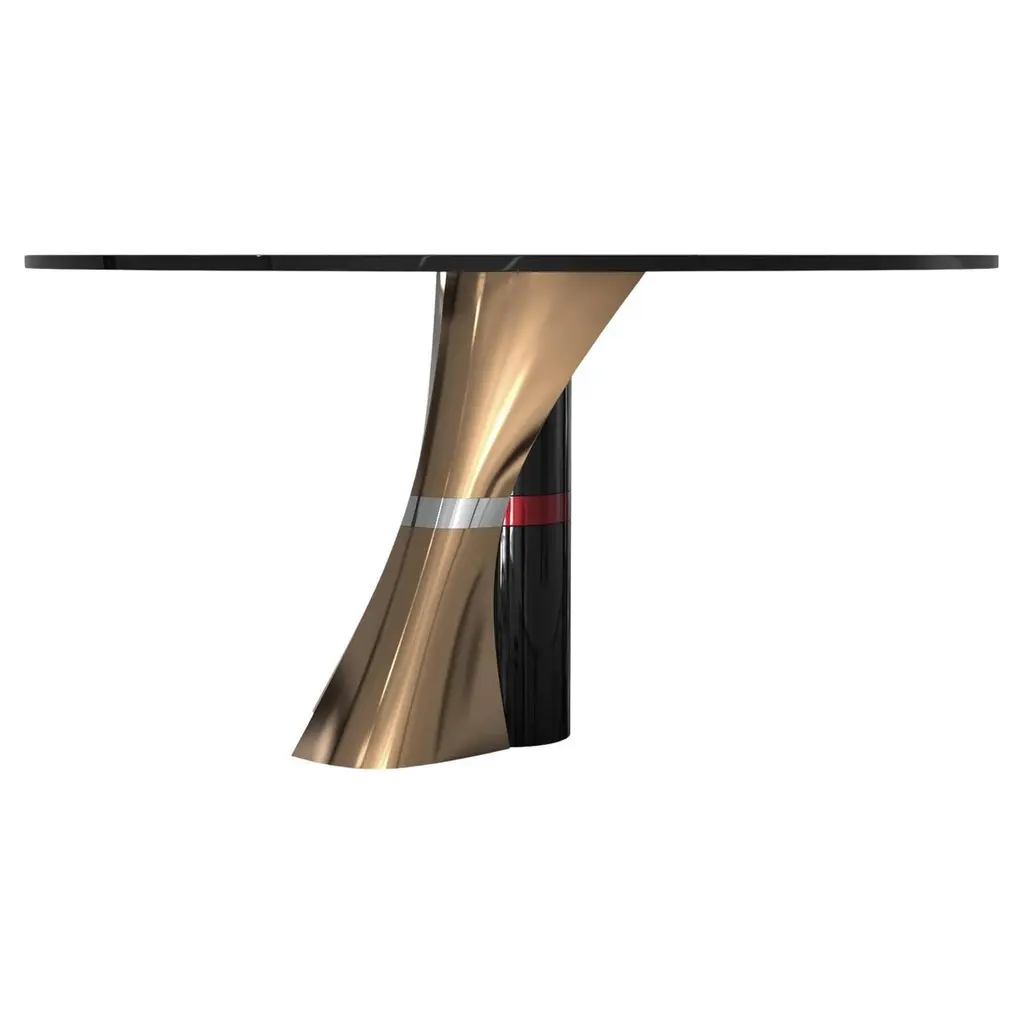 A central piece to any space, the contemporary design of the Yasmine dining table will have everyone doing double takes. The sultry silhouette is fashioned from tailored glass and mounted on a solid wooden base. Classic lacquer and luxurious plated aluminum intermix arching back and forth to reveal each color's respective dominance in the design.