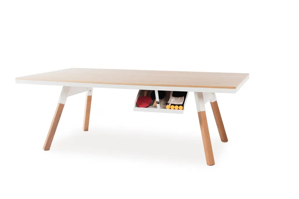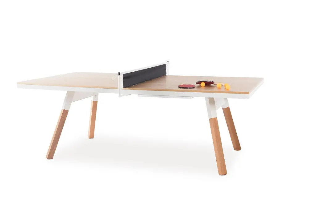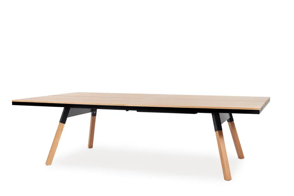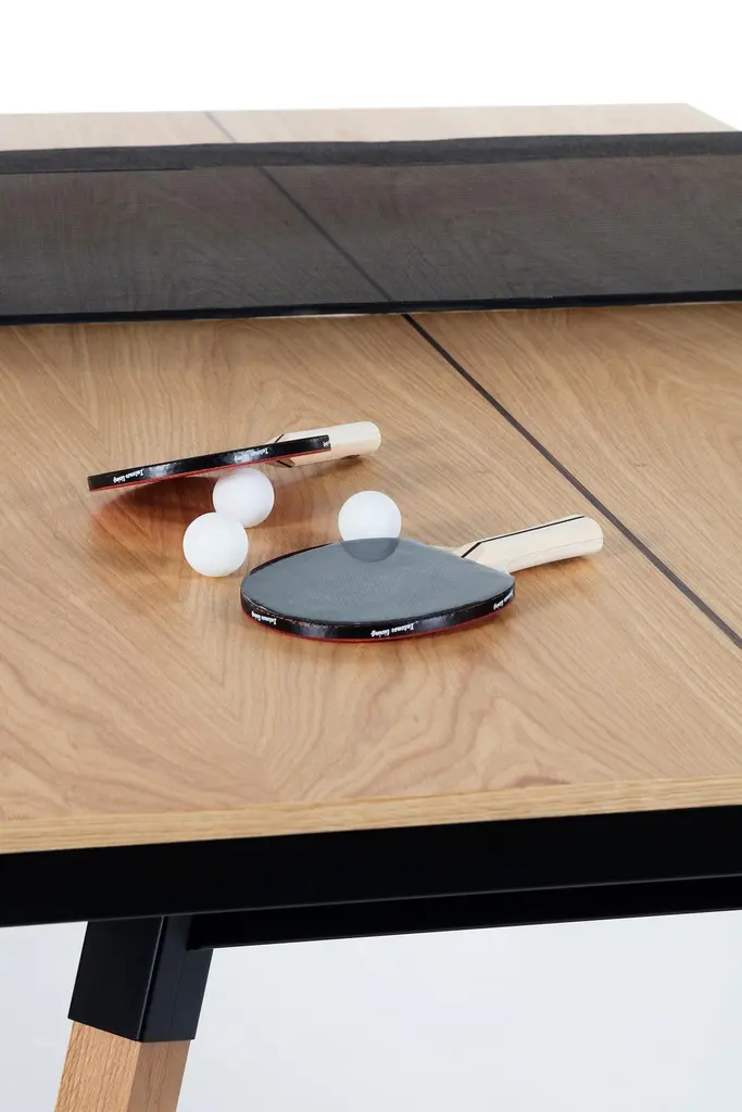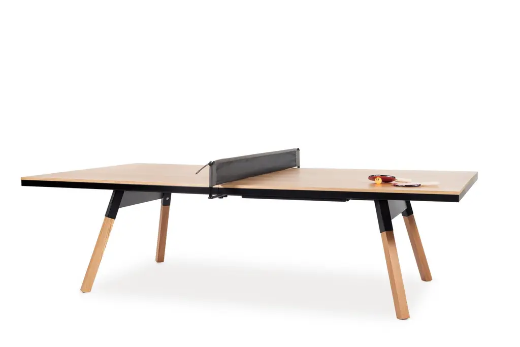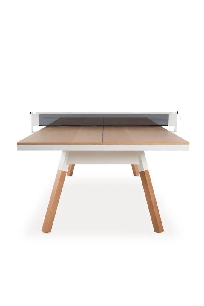 You and Me Indoor Ping Pong Table by Antoni Pallejà Office.You and Me is a ping pong table. It is slightly smaller measures than the tournament ones, with a surface and a design that provide total playability. And, it is also a dining table, an office desk, a conference table.MaterialsStructure: Steel with cataphoretic coating process and micro textured powder coated polyester paint.Top: Walnut or oak wood.Legs: Walnut or oak wood. Net: Coated polyester fabric.IncludesNetPaddles set (2 units) Balls set (6 units.For Residential Offices HospitalityIntense useCustomization optionsIt comes disassembledWood is a natural resource, wood tones may vary from the image.Designed & Manufactured in SpainEstimated Delivery time: 9-11 Weeks