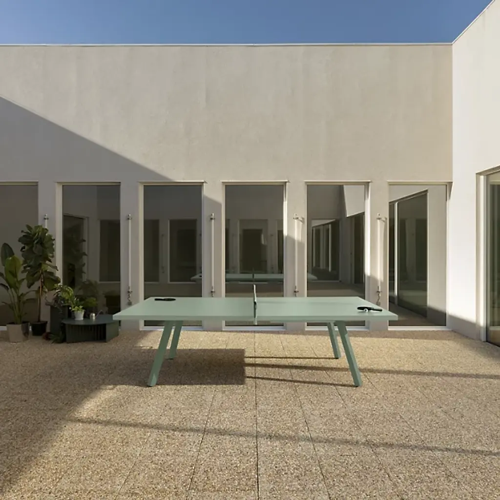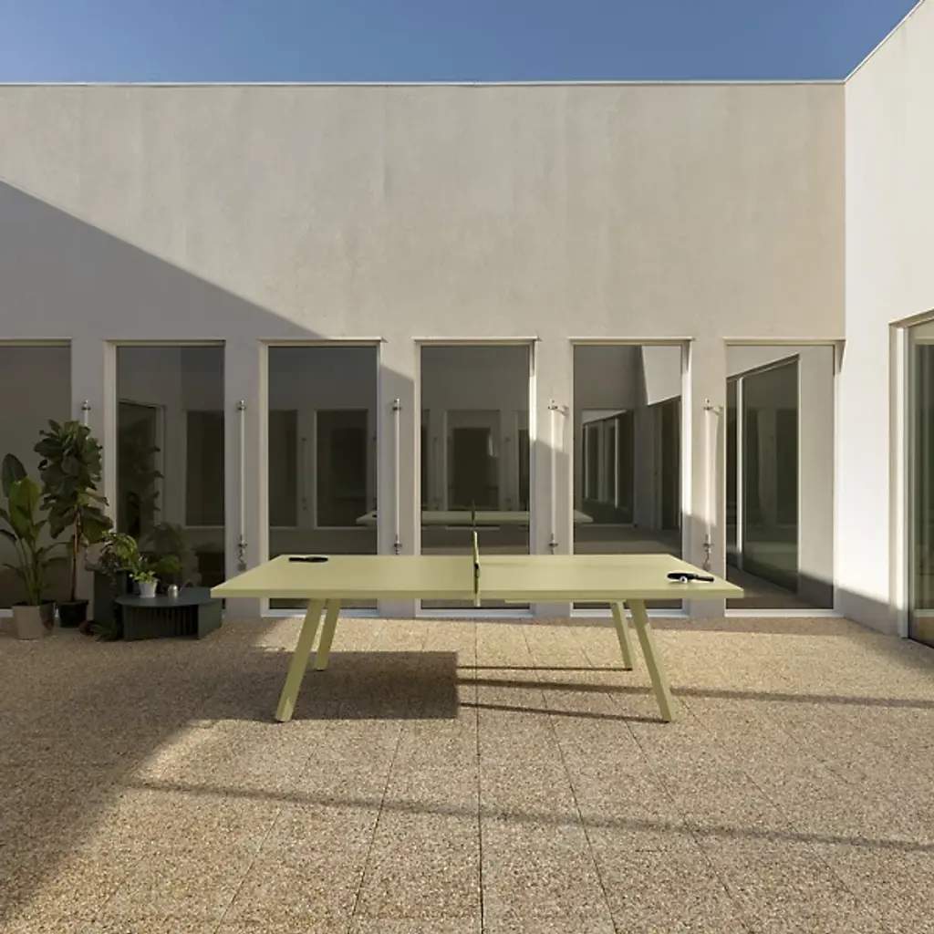 Make time for everything with the elegant, inspired lines of the You and Me Outdoor Monochrome Ping Pong Table from RS Barcelona. A design by Antoni Palleja Office made in Spain, made from a steel frame with painted aluminum table able to weather outdoor conditions if covered up after. It works as a location for work, gathering, and dining, as well as for entertainment, with a deployable net of coated polyester running across the middle. At once playful and practical, a concealed storage drawer in the table keeps the net, balls, and paddle out of sight when not in use, allowing the table to dress up for more refined service.