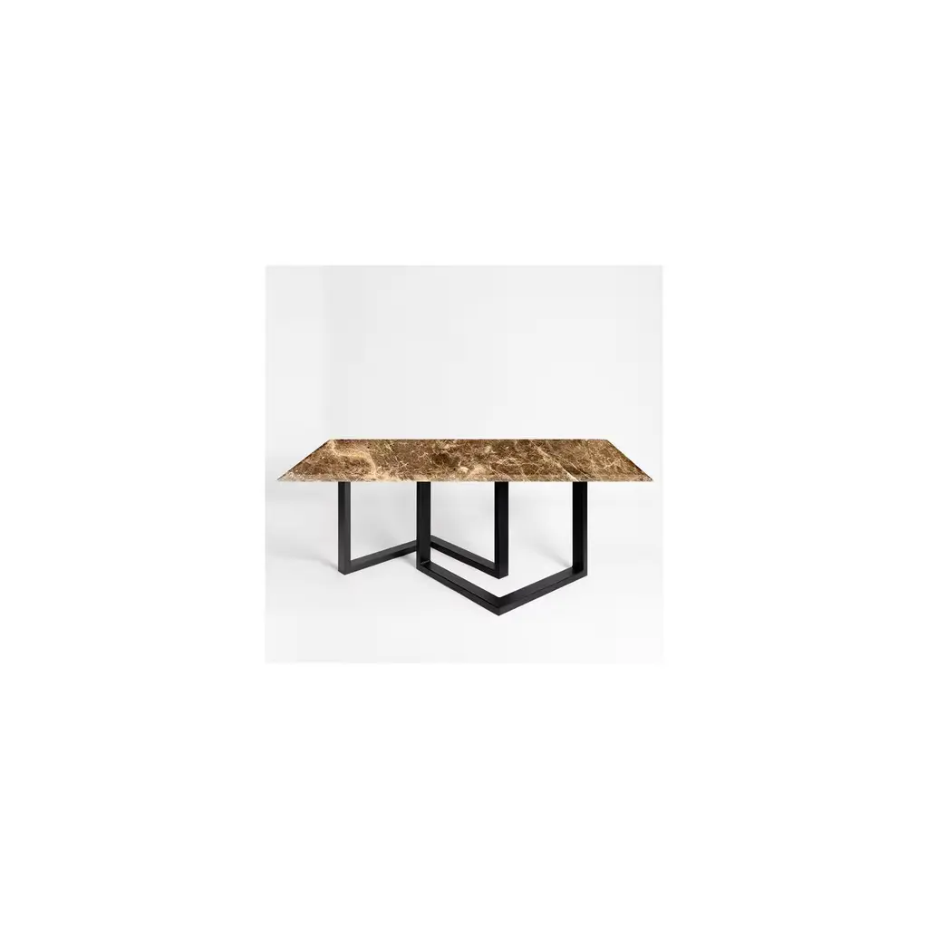 The unparalleled charm of this geometric-inspired design will uniquely enhance the aesthetic of a contemporary interior. A refined dining table of clean and essential lines, it features an exceptional Marron Emperador marble top resting on a black-lacquered iron base of strong geometrical value, also available in gray or gold. The top is customizable in marble type, please ask the Concierge for options.