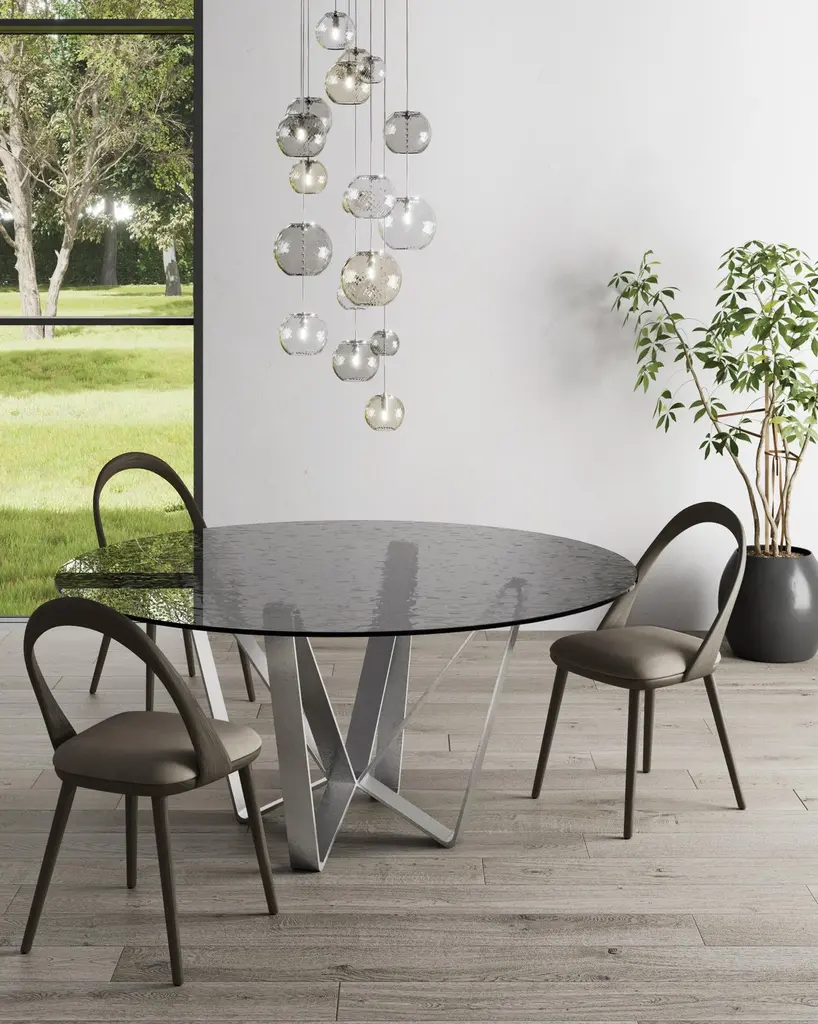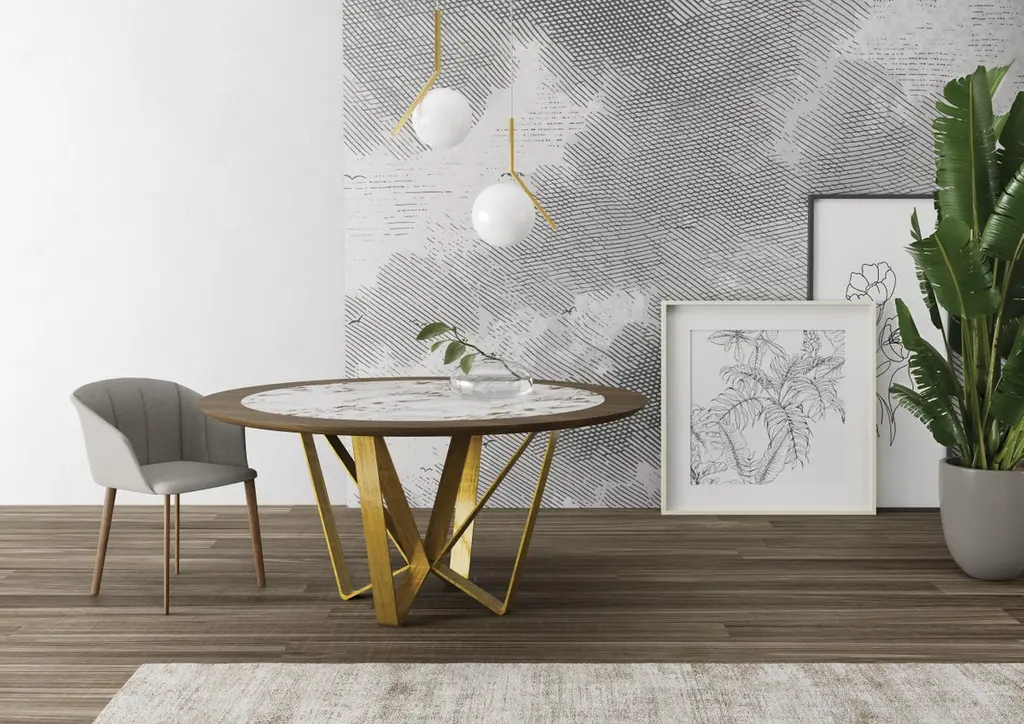 Zefiro Dining Table by Chinellato DesignDimensions: D 160 x H 73 cmMaterials:Top: Canaletto walnut top with glossy Capraia ceramic.Base: Patinated gold leaf-finished walnut.Round dining table available in two sizes, offered with three combinations of base and Top finishes. The base, crafted from worked and welded steel, is available in Chabin Silver, Patinated Walnut Gold, and Patinated Walnut Silver finishes. The Top is available in Hammered Smoked Tempered Glass and two solutions featuring a double combination of materials, where the outer frame is made of genuine veneered MDF wood, paired with a central part with a ceramic slab. Available combinations include Canaletto Walnut with Glossy Capraia Ceramic or Thermally Treated Oak with Glossy Sahara Ceramic.Lightness and a suspended sensation are the defining features of Zephyr, the round dining table with a base crafted from steel to create a continuum between its elements. Light supports, barely touched, so that it is the void that triumphs over the solid and transparency that dominates the entire composition. The divine soul of the wind embodied by Zephyr is expressed through the skillful use of finishes: patinated gold, patinated silver, and Chabin silver with which you can customize the base.Chinellato has been operating in furnishing since 1969. In that year Paola Chinellato embarked on the path of frame finishing using the leaf decoration technique, typical of the Venetian artisan tradition. Over the years, Paola and her son Massimo have developed interior finishing solutions. Their craftsmanship skills thus became a family tradition.Since 2005 Chinellato has focused on the study of new finishing techniques on different materials with innovations that allow their use for new design requirements. In this path the finishing of the furniture object becomes a fundamental moment in the creation of design value.