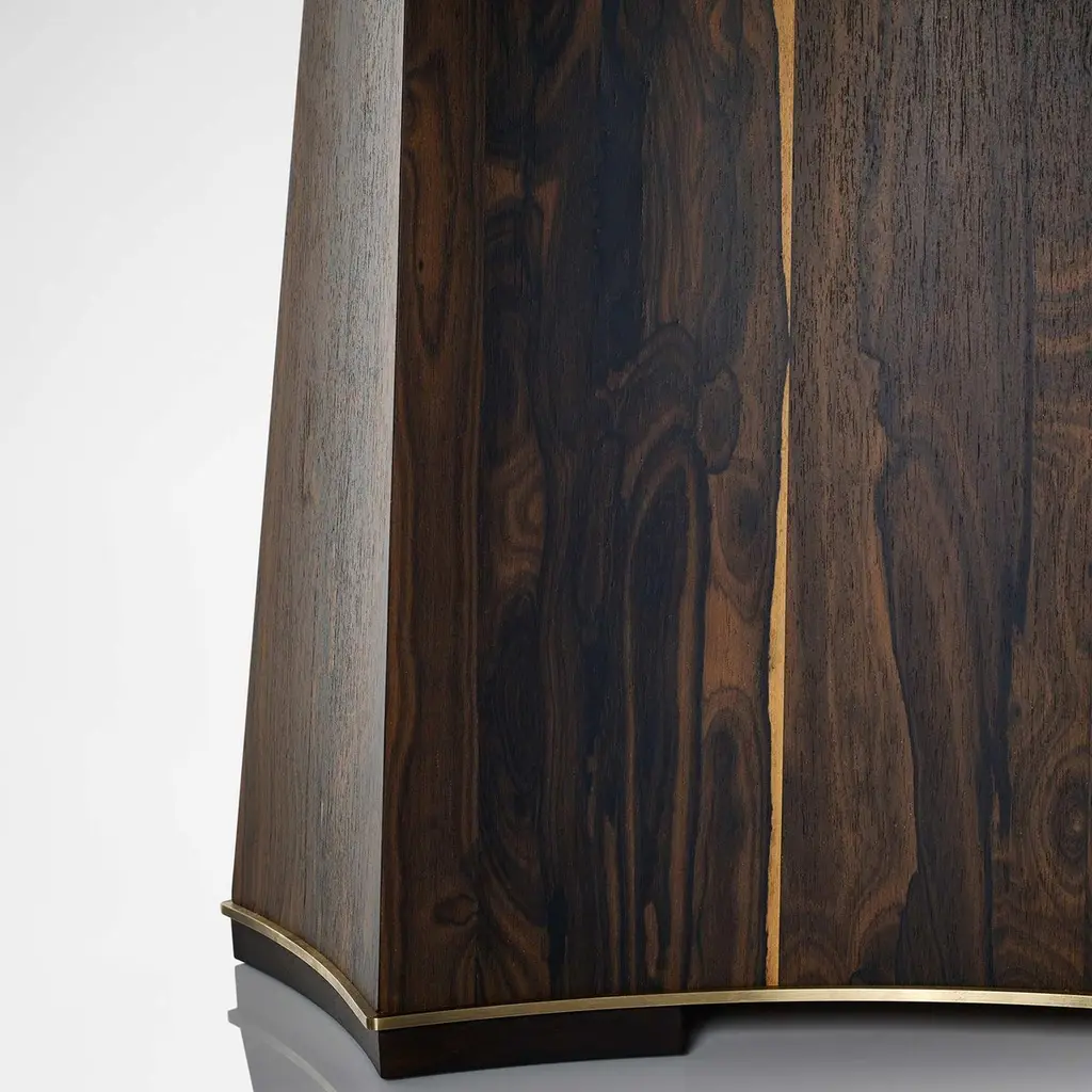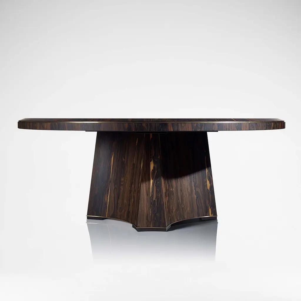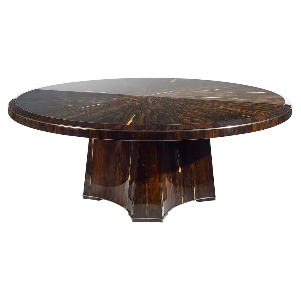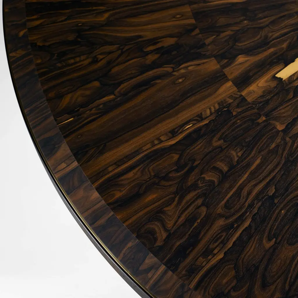 The Ziricote dining table draws inspiration from the swirling gas clouds on Jupiter. The striking veneer mimics the unique and marbled grain. The parquetry pattern created exclusively for this range uses timber sourced from Europe, carefully hand-selected from one tree for its precise grain and coloration. Each individual piece has been selected and placed to display the sap detailing. The Ziricote table is a result of exceptional craftsmanship and long hours of delicate construction.