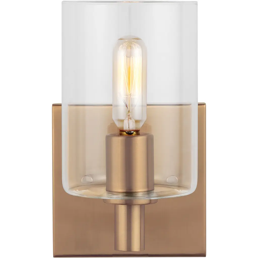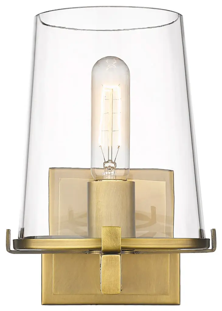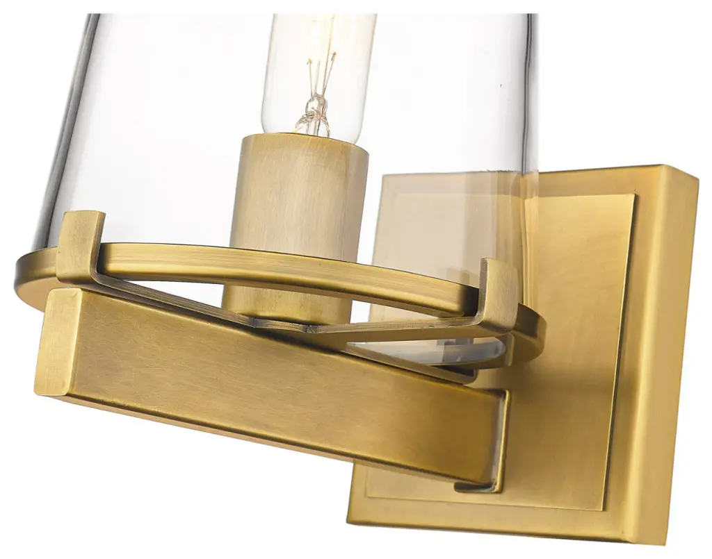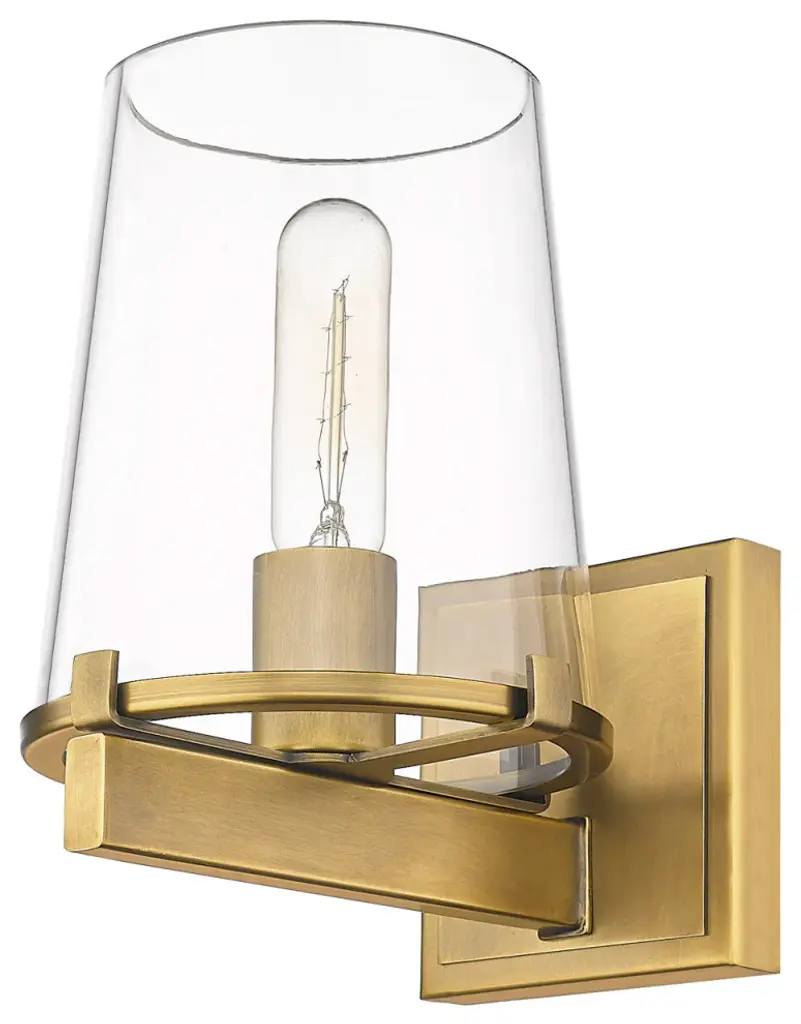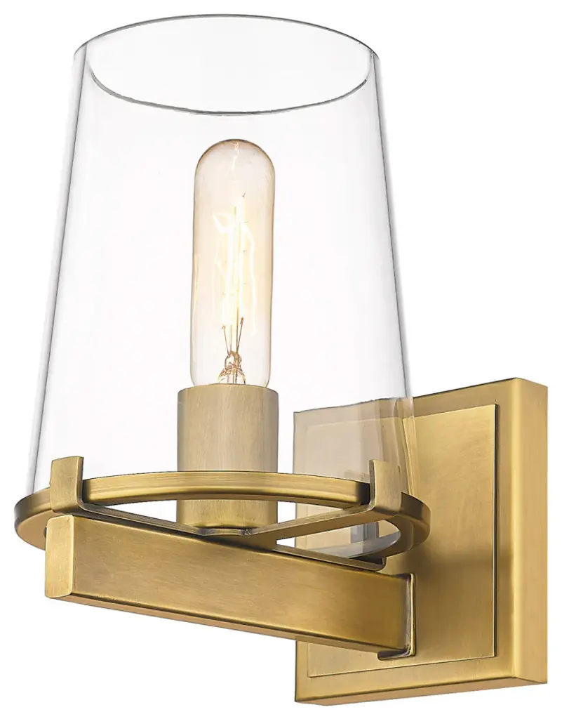 The generous proportions of the Callista Collection gives this hand-crafted steel series a solid design presence. Choose the Polished Nickel finish for a contemporary or transitional look or go bold with a Matte Black finish that commands attention. The Artisan tapered clear glass shades sit upon X rings that balance the look and allow for plenty of warm, ambient light. Available in Round and Linear configurations to complement most modern living spaces. For example, Beaus rectangular chandelier is perfect for long, large dining tables, and securely suspended from two support rods.Brighten up a bathroom or powder room with this elegant, rubbed brass vanity light. A single, tapered, clear glass shade radiates a brilliant glow. A bold, geometric silhouette adds modern character to its effortlessly chic design.Style : Transitional, industrial, Coastal, Mid CenturyBulbs Included : NoENERGY STAR : NoUL CLASSIFICATION : CUL/cETLuUL APPLICATION : DampActual Length/ext : 8"Frame Finish : Rubbed BrassFrame Material : SteelShade Finish/Color : ClearShade Material : GlassBulb Wattage : 60Number of Bulbs : 1Bulb Base : MediumDimmable (Yes/No) : YesActual Width : 6.5"Actual Height : 9"Backplate Dimensions : 4.75"L x 4.75"WActual Weight : 3 lbs