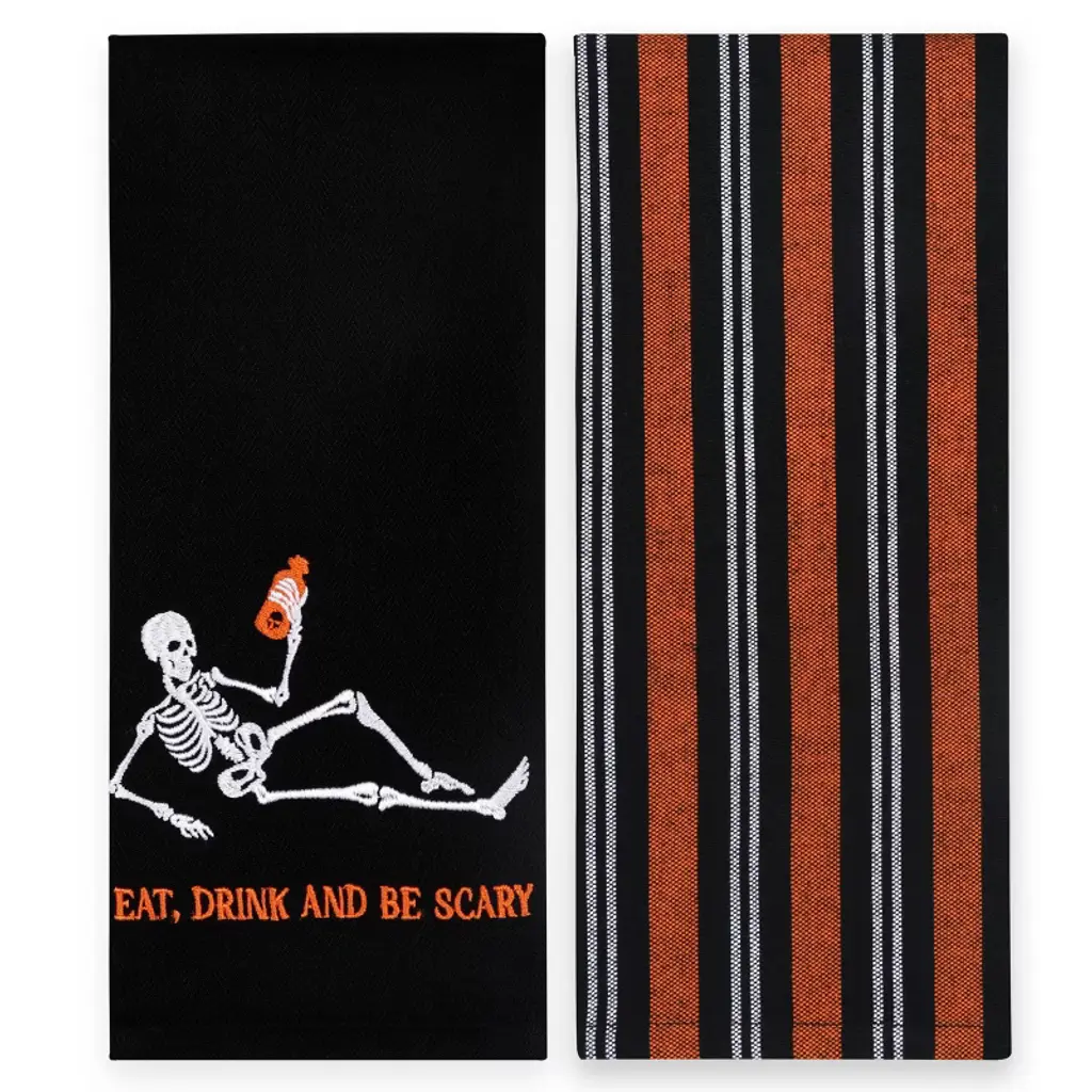 Add a touch of charm to your kitchen with this 2pk Dishtowels Skeleton - Bullseye's Playground™. Featuring a delightful combination of multi-stripe and solid patterns, these towels come in vibrant orange and black hues. Crafted from cotton with a herringbone woven texture, they offer both style and functionality. Each towel measures 15 inches in width and 25 inches in length, making them perfect for drying dishes or hands.