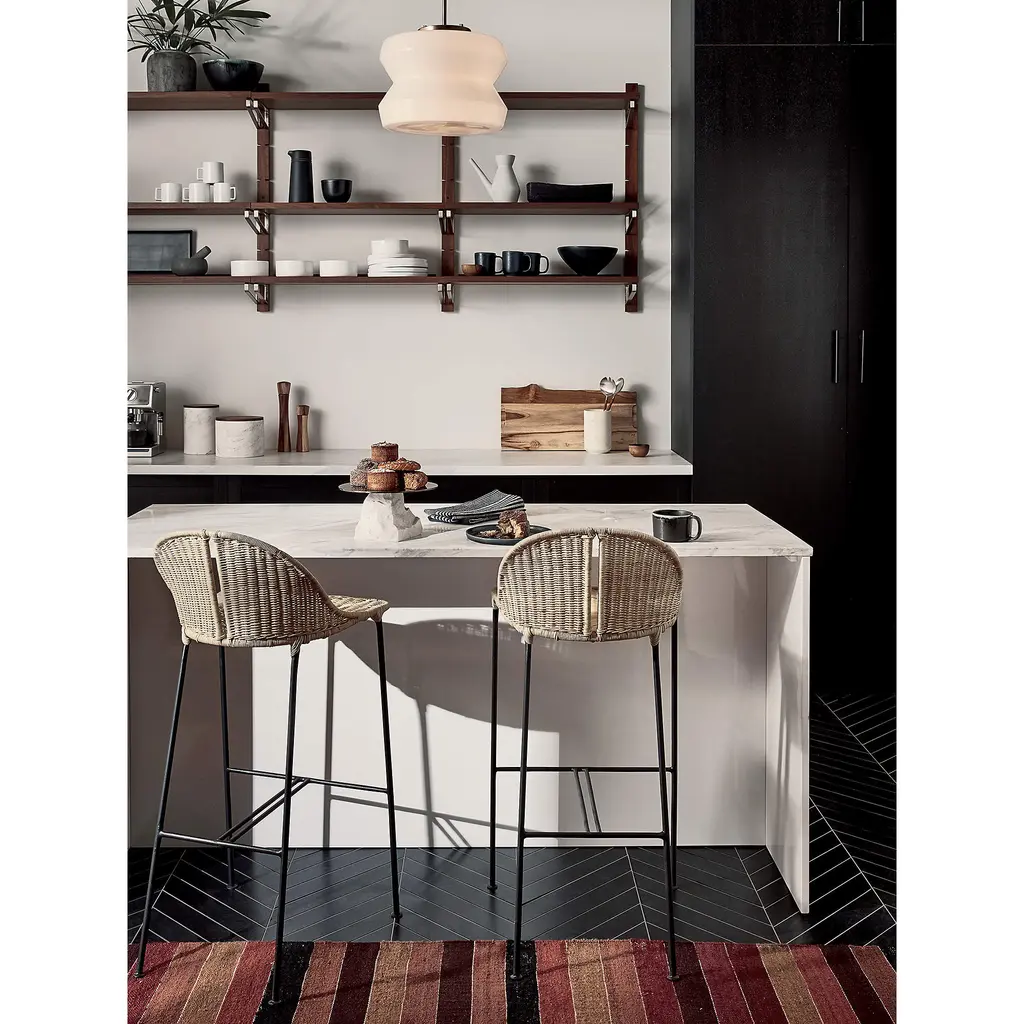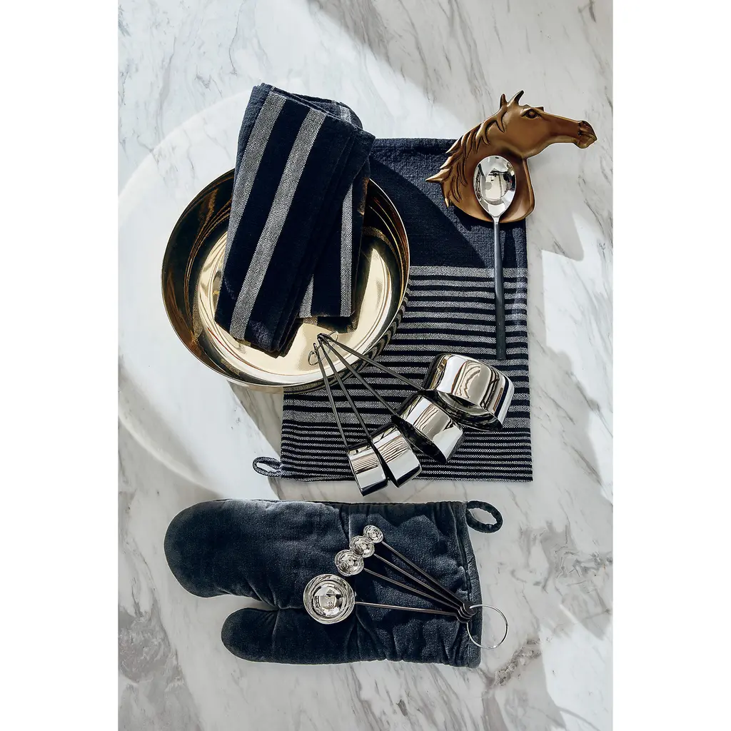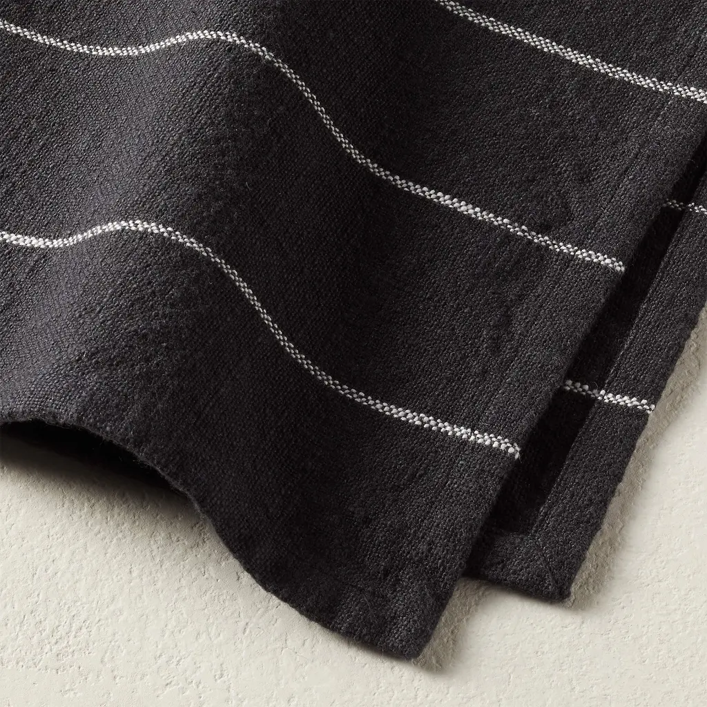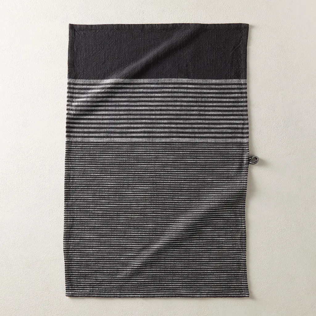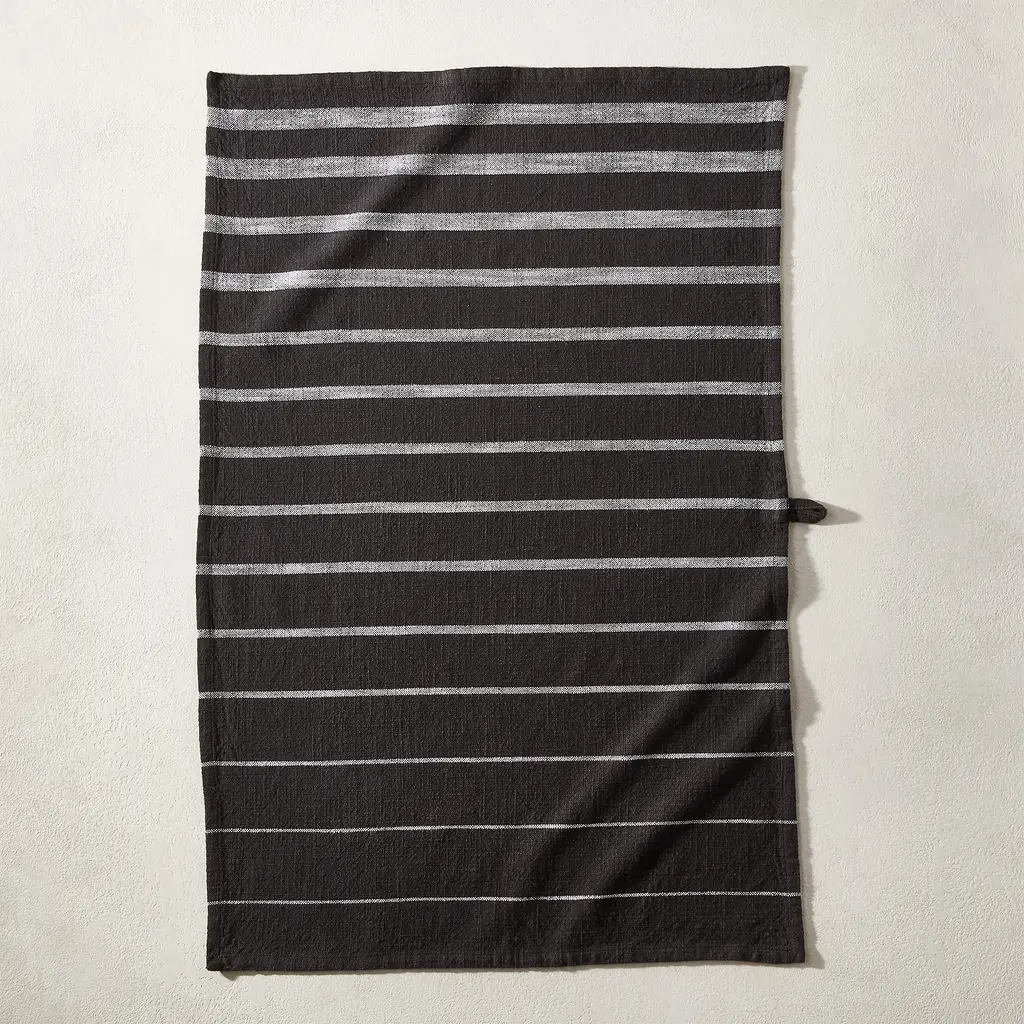 Two black organic cotton towels with varying white stripes keep the kitchen tidy and modern. Each with a single cotton loop to hang it up when the work is done. CB2 exclusive.