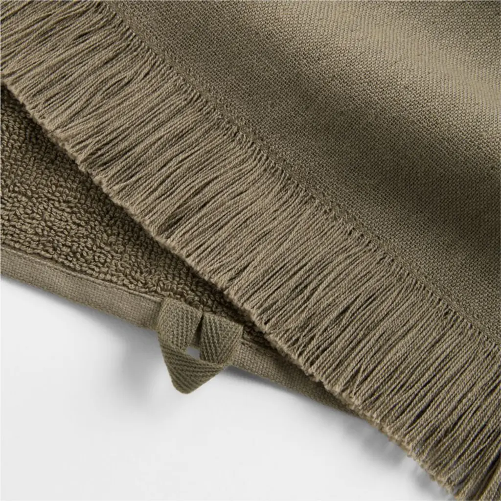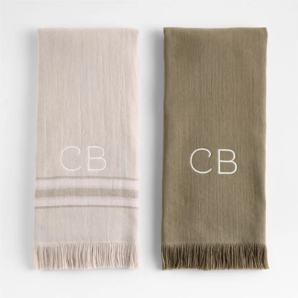 A new take on terry cloth, our organic cotton Craft dish towels reverse from solid and striped flatweave to ultra-absorbant loops. The smooth side dries delicate glassware to a lint-free finish, while the terry cloth side is ideal for drying pots and pans. Pairing a solid sage green towel with a naturally hued version striped in green and white, these fringed towels look elegant hanging on a hook or oven handle and coordinate with our Craft table linens.