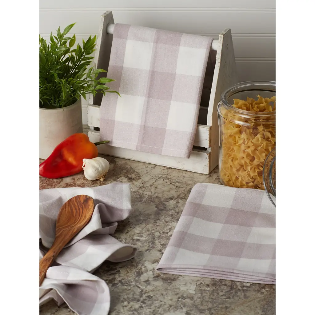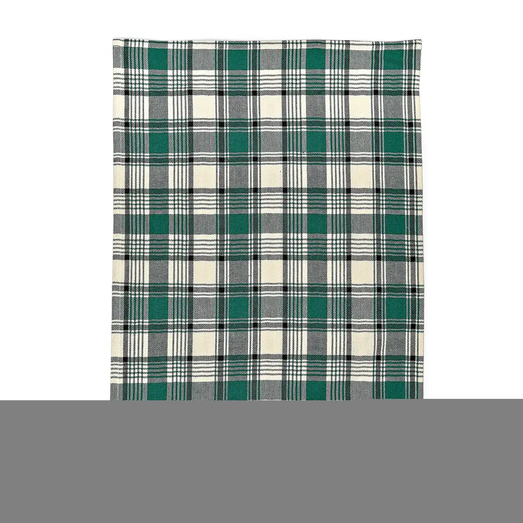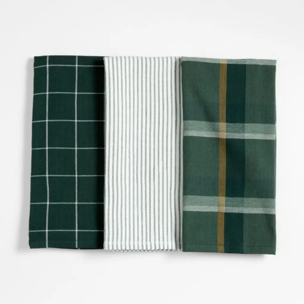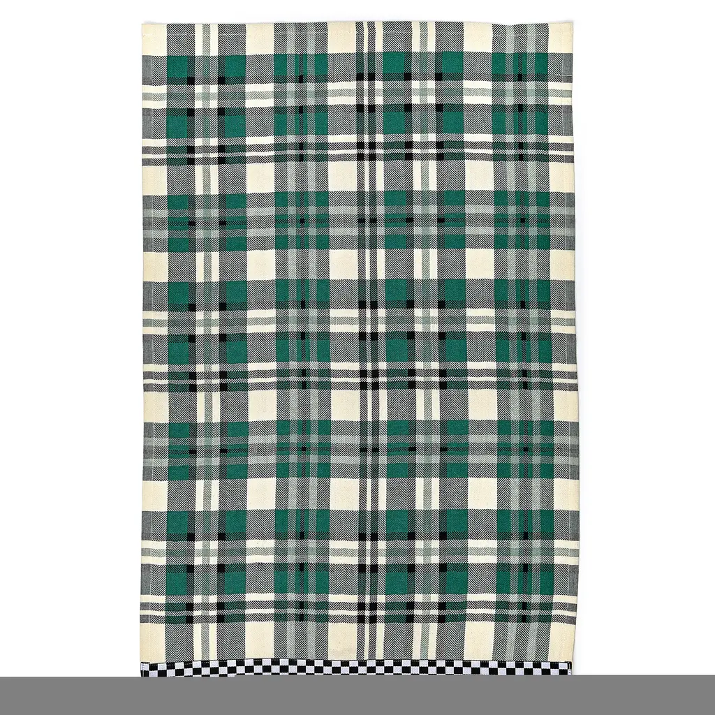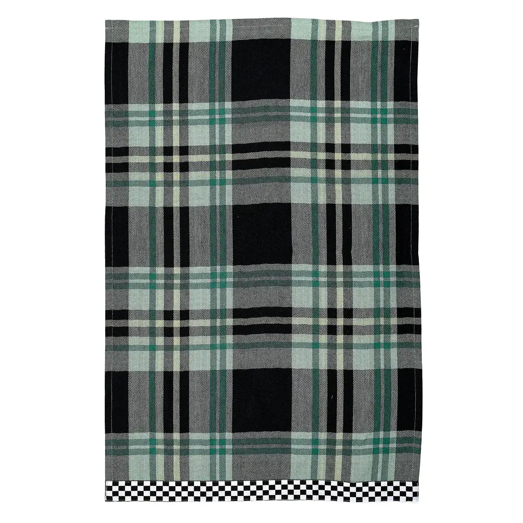Elegant and versatile, this set of three Evergreen Woven Dish Towels features unique tartan patterns of black, grey, white, and green, trimmed with black and white checks.