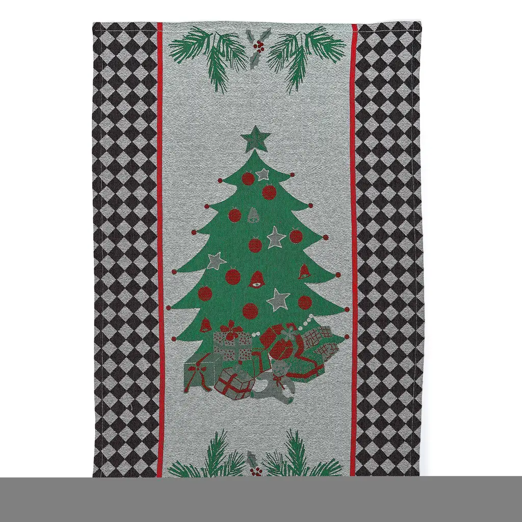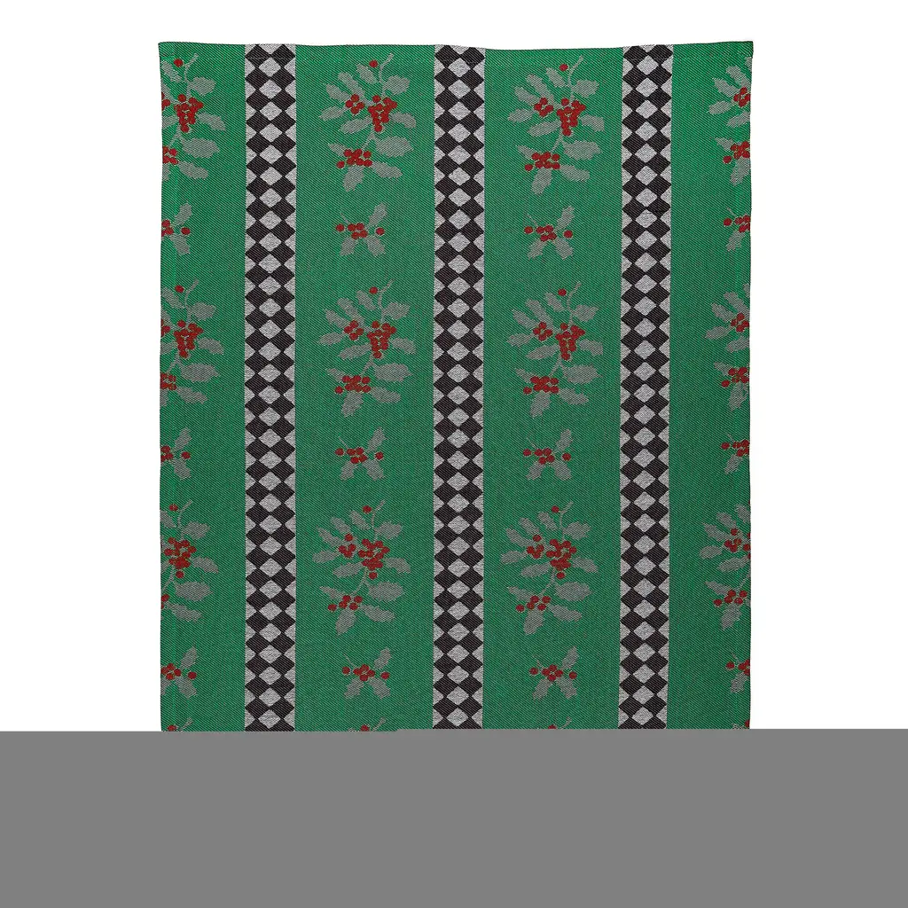 Fun and functional, this woven jacquard Holly and Holiday Tree Jacquard Dish Towel Set features holiday greenery and festive motifs, accented with diamond checks.