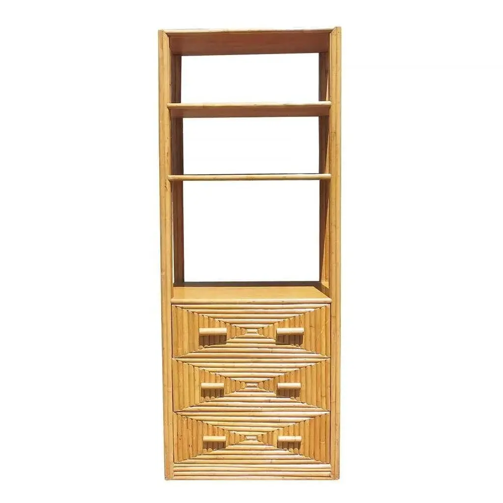 This beautifully restored stick rattan display cabinet with mahogany shelving and side panels. This large 7' tall cabinet features three fixed shelves and a bottom cabinet with three drawers for storage. It is perfect for use as a focal point in a living room, lobby, or hallway. It could also be used as a TV stand, all meticulously refinished to highlight the natural rattan’s warmth and durability. It is perfect for creating a stylish and cozy tropical-inspired living space, blending style and vintage charm with modern comfort. There are 2 etageres available, sale is for 1 etagere Rattan is more than just furniture—it's a statement of style, uniqueness, and timeless elegance. Frequently featured in home design magazines and advertisements worldwide, rattan's appeal lies in its ability to effortlessly blend classic charm with contemporary aesthetics. We take pride in offering the finest rattan available, showcasing expert craftsmanship through meticulously restored pieces built to last. Every item in our collection is revitalized with precision—wrappings repaired, connections reinforced, and a durable protective finish applied. Paired with fresh, perfectly fitted cushions, our rattan furniture delivers unparalleled comfort and beauty for your home or workspace. We have almost 100 years of expertise and know how to properly refinish and fully strengthen your rattan furniture Our high-resolution photos capture the flawless condition and timeless style of each piece, highlighting rattan's enduring quality. With furniture that has stood the test of time—lasting 60 to 100 years—and now expertly restored to endure another 75, our collection represents both heritage and innovation. Stylish, unique, and versatile, rattan furniture remains a timeless choice, perfect for any setting. We fully guarantee your complete satisfaction! Dimensions: 73" height x 32" width x 16" depth United States, 1950