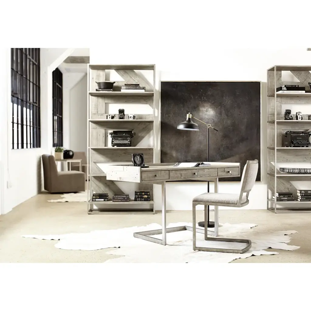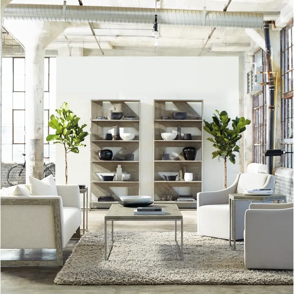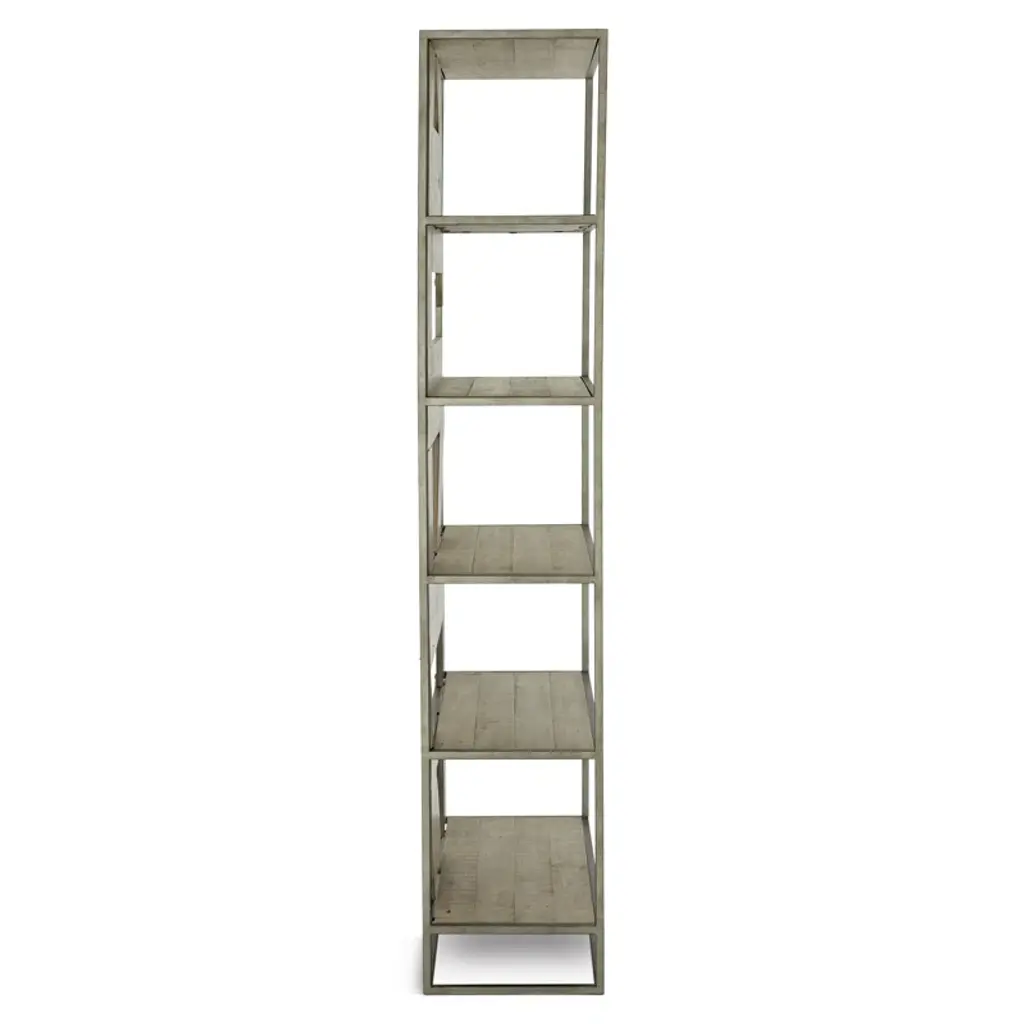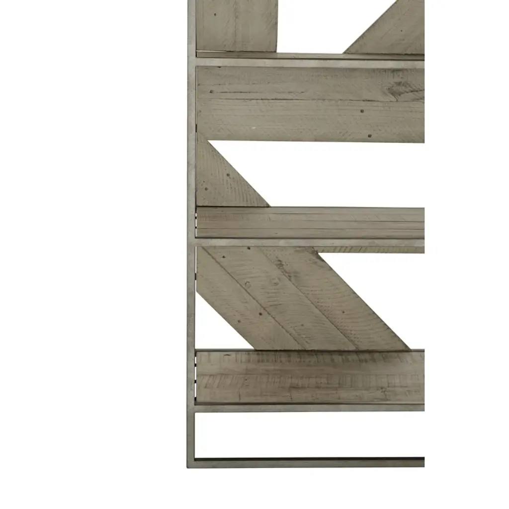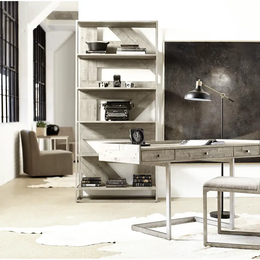 The Highland Park collection, part of Bernhardt's eclectic loft brand, blends the best features of the farmhouse and mid-century design, with a one-of-a-kind appeal and laid-back vibe. The Alvar Etagere, combining a tubular steel frame with rustic planked wood shelving, lends a shabby elegant look to your living room or bedroom. Its open shelving is perfect for showcasing heirloom pieces or can simply be used for storage. The wood back in an open geometric pattern gives this bookcase a unique touch. This piece is designed by Bernhardt Furniture, a luxury heritage brand that is renowned for iconic furniture design.