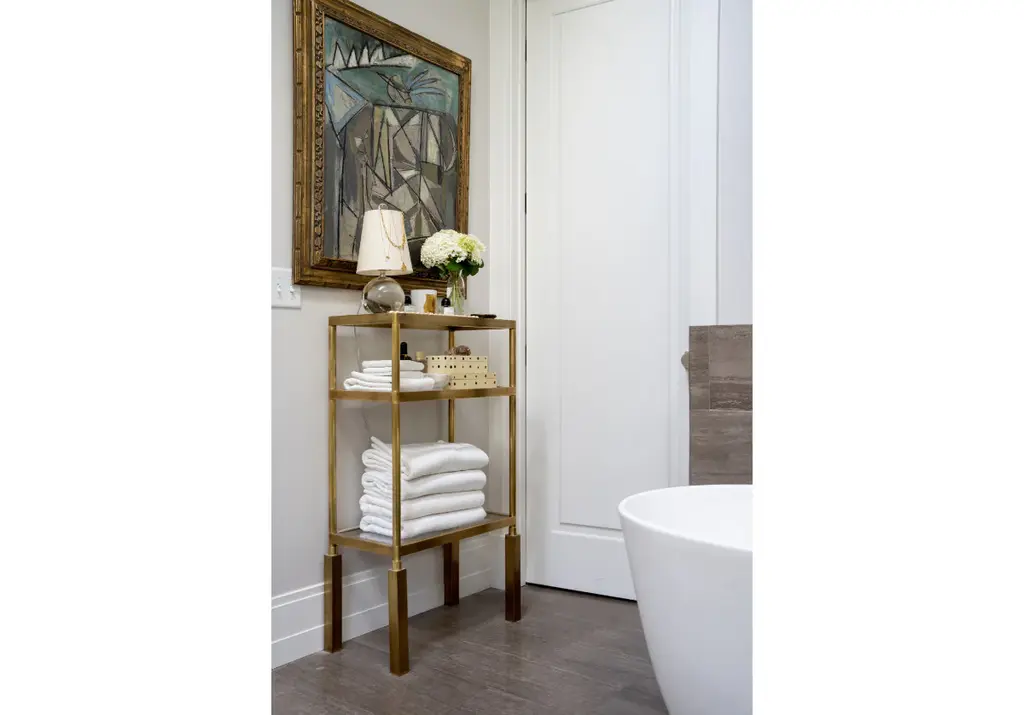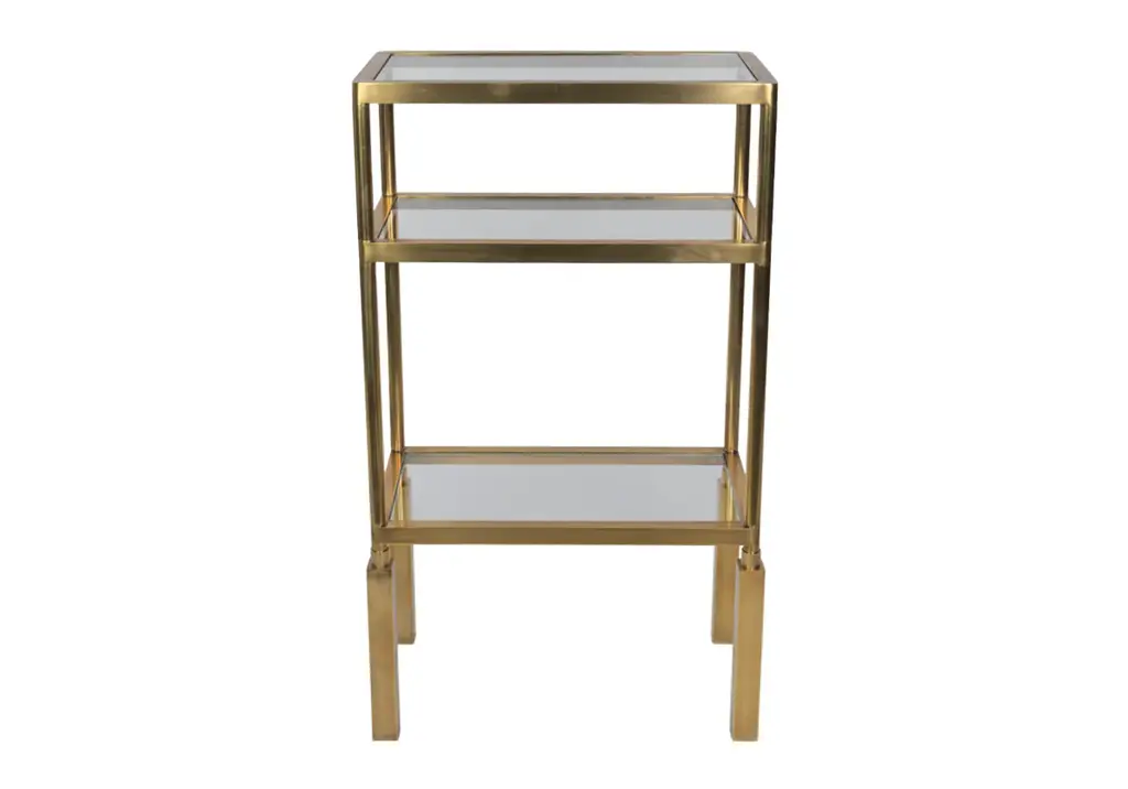 Chic and sophisticated, the Beatrice is designed to elevate small spaces and complement any decor. Crafted from real brass with three clear glass shelves, its ideal in any space. Style in a powder bath for extra storage of towels, candles, and beauty products. Display in a closet with favorite perfumes, purses, and shoes. It can easily make a statement as a bar cart in the living or dining room, paired with barware, coasters, and cups.