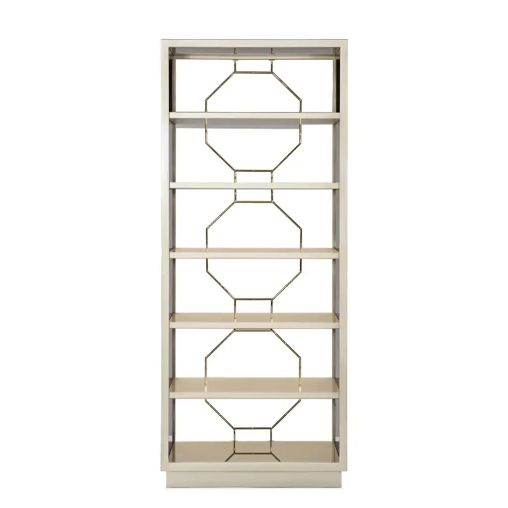 Dramatic linear architectural form constructed of tubular steel with directional hand graining. This bookcase has a tubular steel frame that features six inset glass shelves, all tempered with bevels, providing ample display.