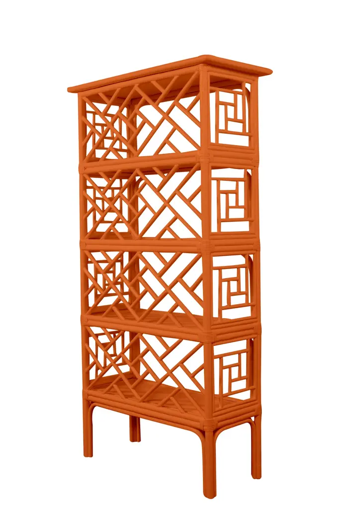 In a classic chinoiserie style, this étagère features a Rattan frame. Each joint is hand-wrapped with rawhide bindings to add strength and an element of detail. The four wooden shelfs offer plenty of storage for accessories, books or photos. Each David Francis etagere is hand-finished and made to order, please allow time for delivery.