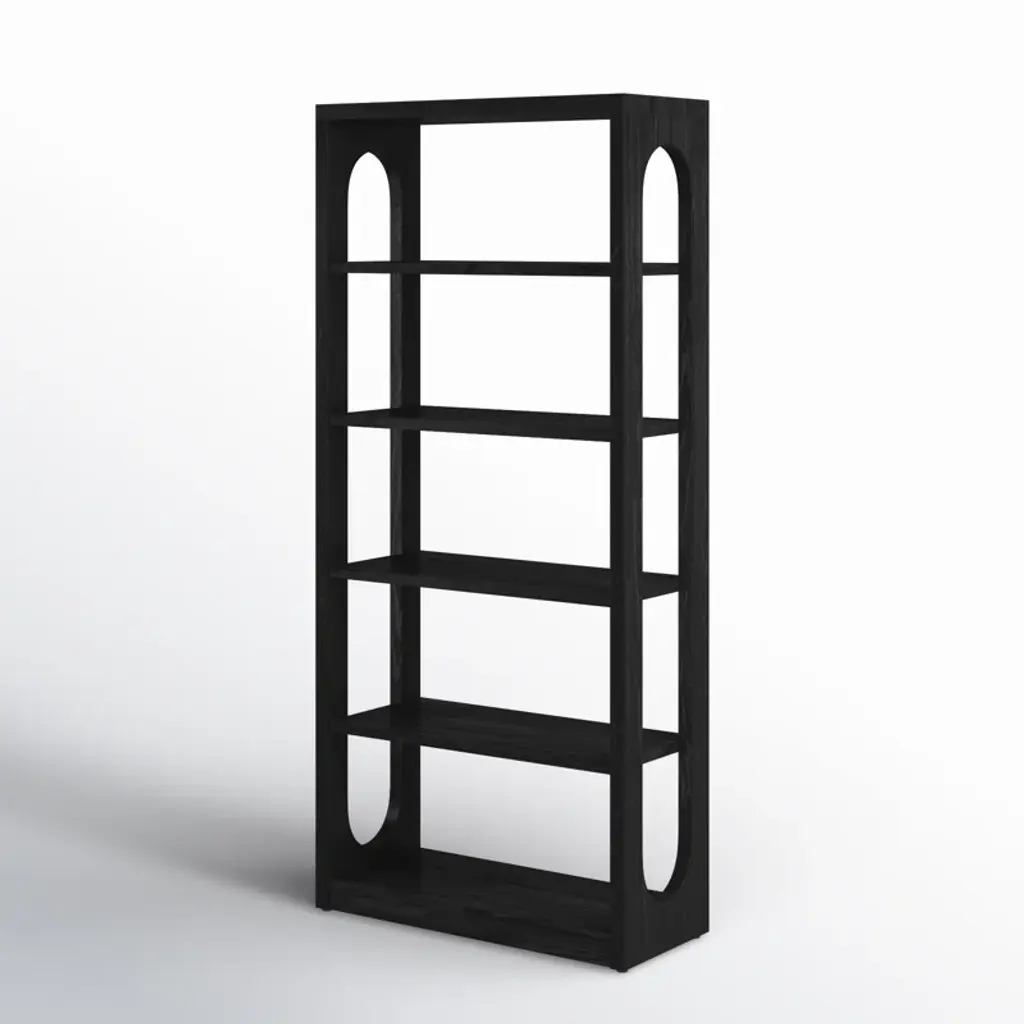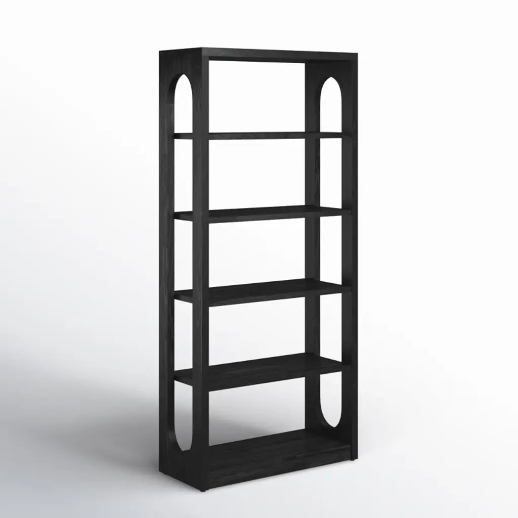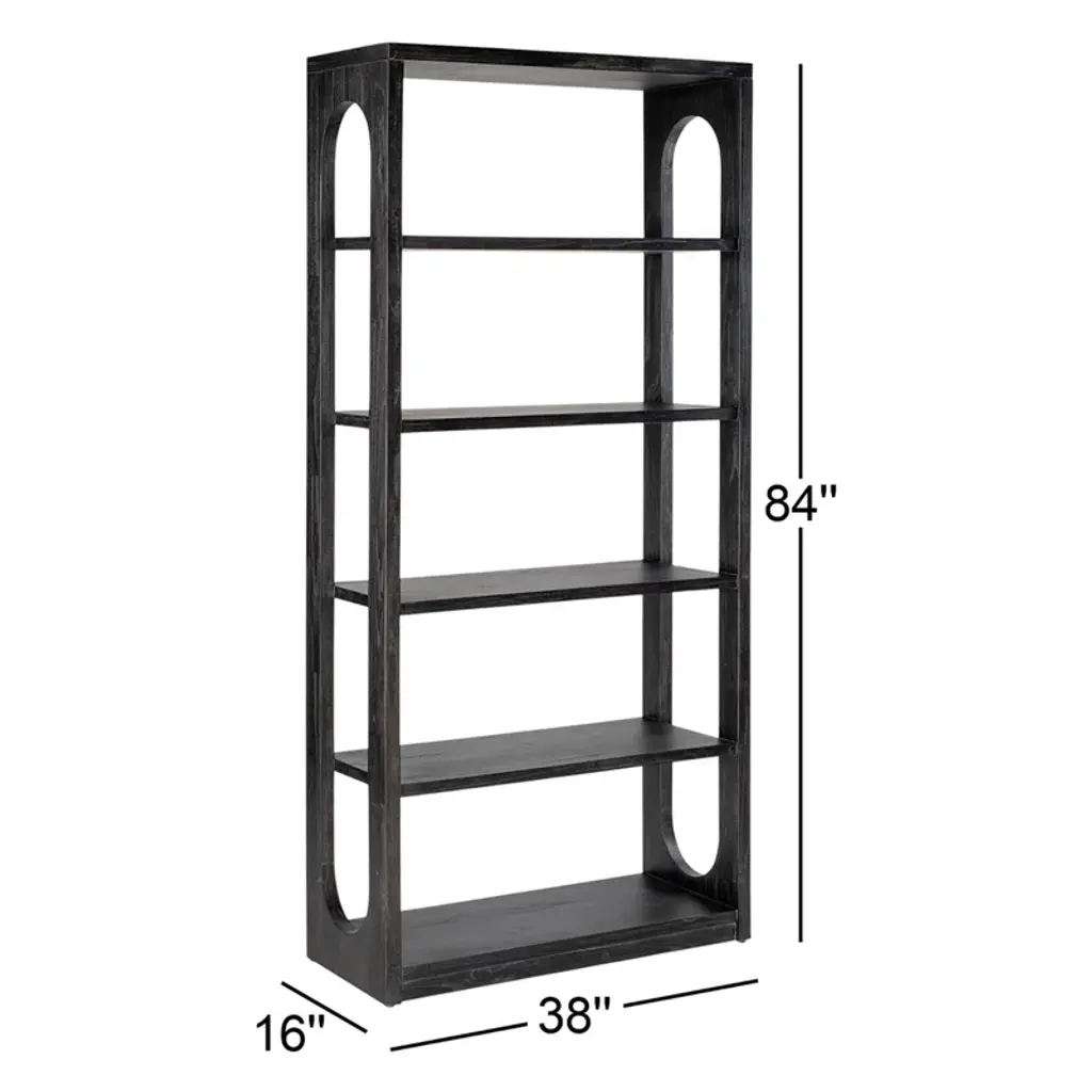 A casual finish over a rounded organic silhouette creates a striking design in the Commerce and Market etagere. Crafted of mindi veneers, the etagere has 4 fixed shelves and features a black wood finish with wood grain showing through for a tactile appeal.