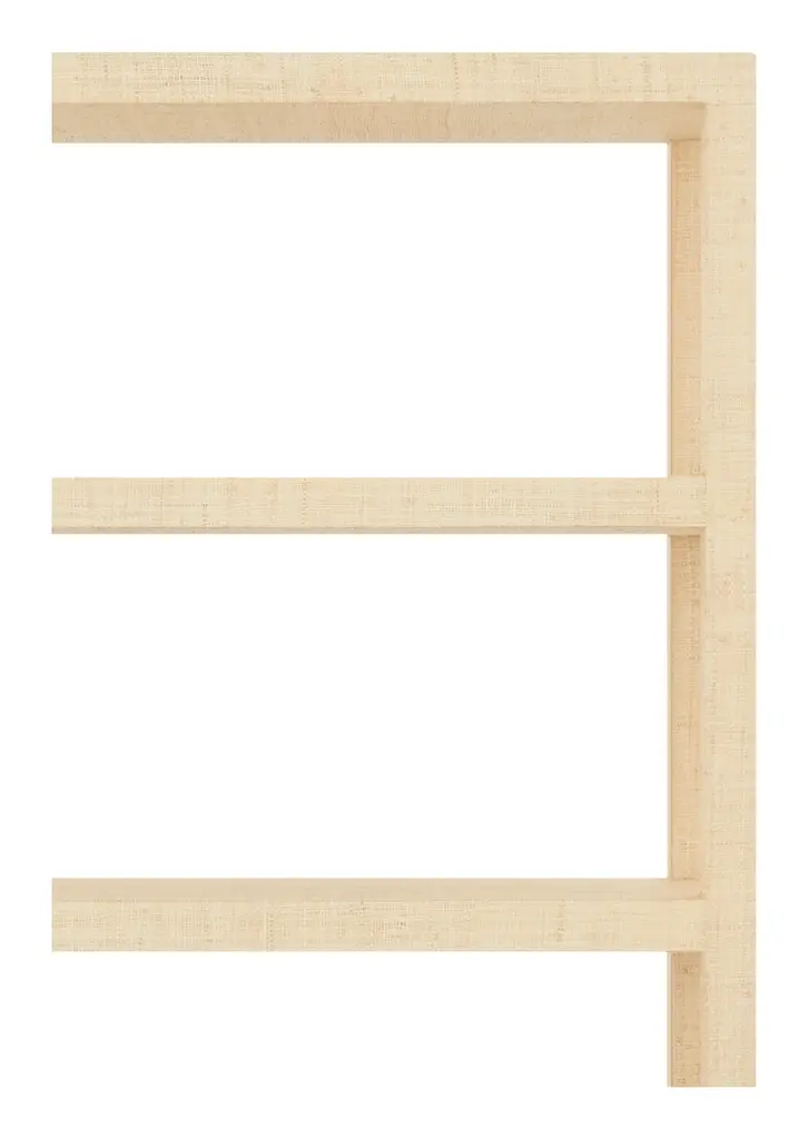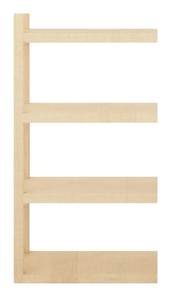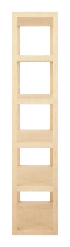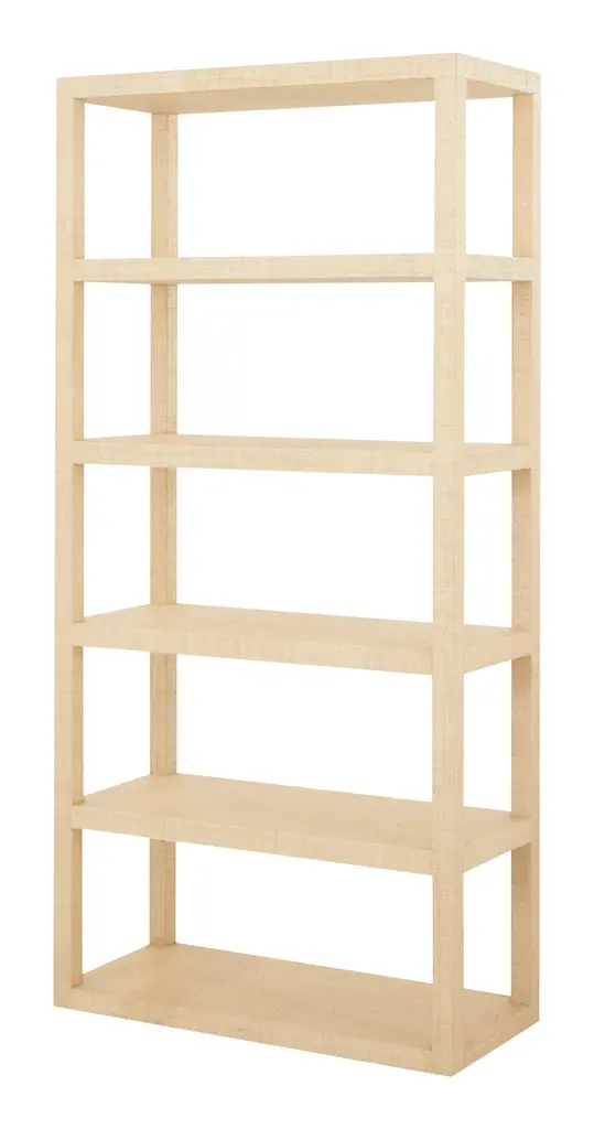 Texture always makes things a little more interesting — which is exactly why we love our Chloe Etagere in just about any space. Open, airy and oh-so-chic, this five-shelf bookcase is crafted from solid wood into a simple, clean-lined silhouette and completely clad in cream-colored raffia for a unexpectedly tactile feel. All of this is covered with a clear top coat, which helps to protect its unique finish from scratches and stains. An effortless addition to any home, Chloe is especially perfect for displaying framed photos, objets d’art and stacks of coffee table books in the living room or study. •raffia •solid wood base •clear stain-resistant top coat Dimensions•36"W x 16"D x 76"H•shelves: 12.75"H