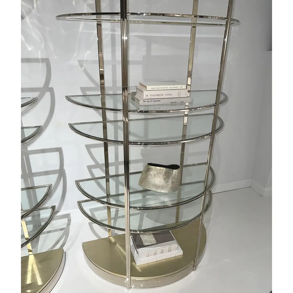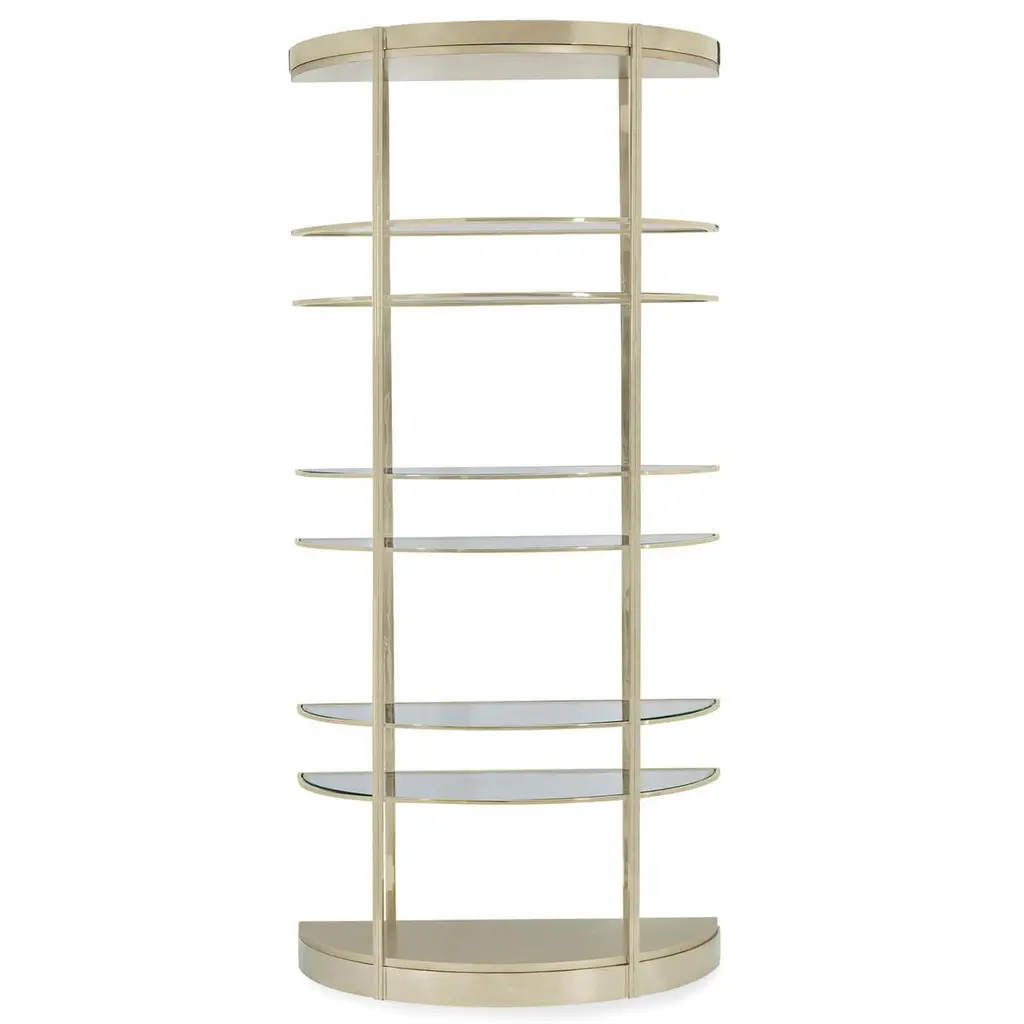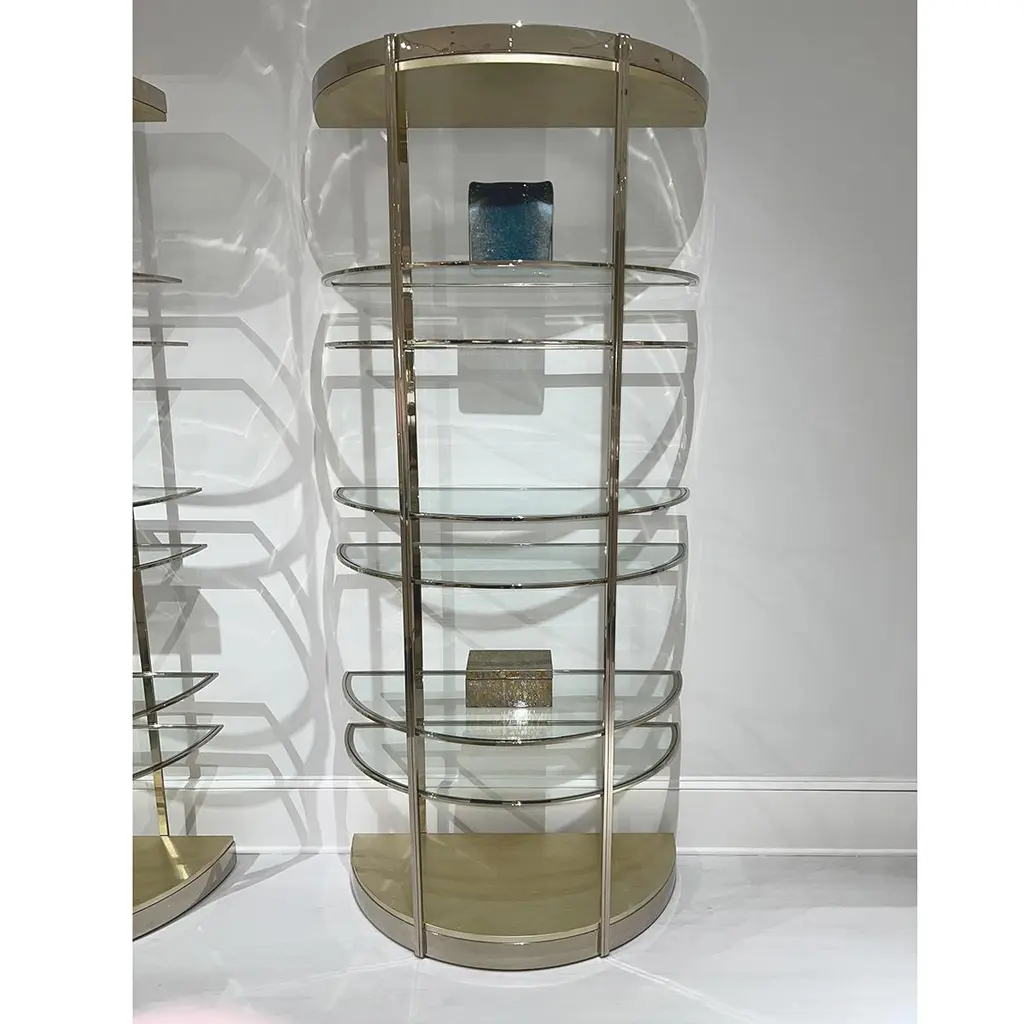 A contemporary-style half-moon etagere with a light and airy design. The tall frame has been given a high polished gold finish and surrounds each of the six semi-circular glass shelves. Dimensions39" W x 18.5" D x 85.5" H Small shelf opening height: 6"Large shelf opening height: 14.875".