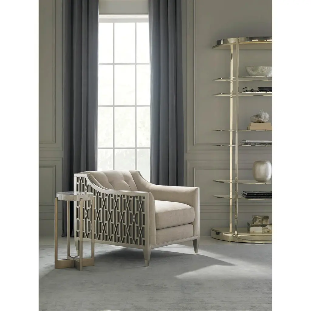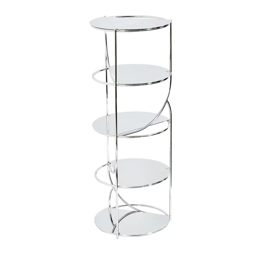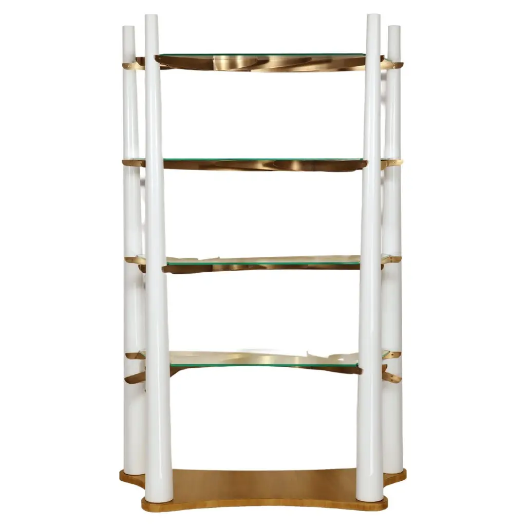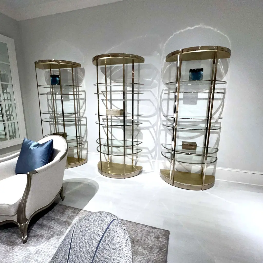 A contemporary-style half-moon etagere with a light and airy design. The tall frame has been given a high polished gold finish and surrounds each of the six semi-circular glass shelves. Dimensions39" W x 18.5" D x 85.5" H Small shelf opening height: 6"Large shelf opening height: 14.875".
