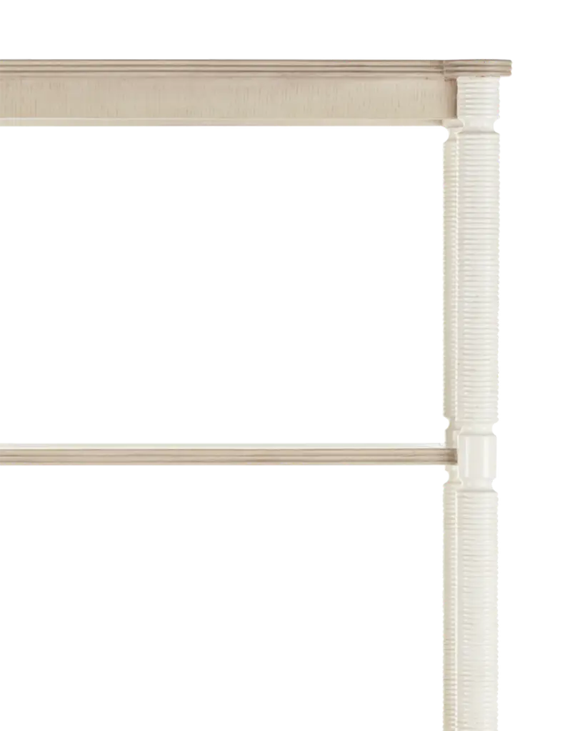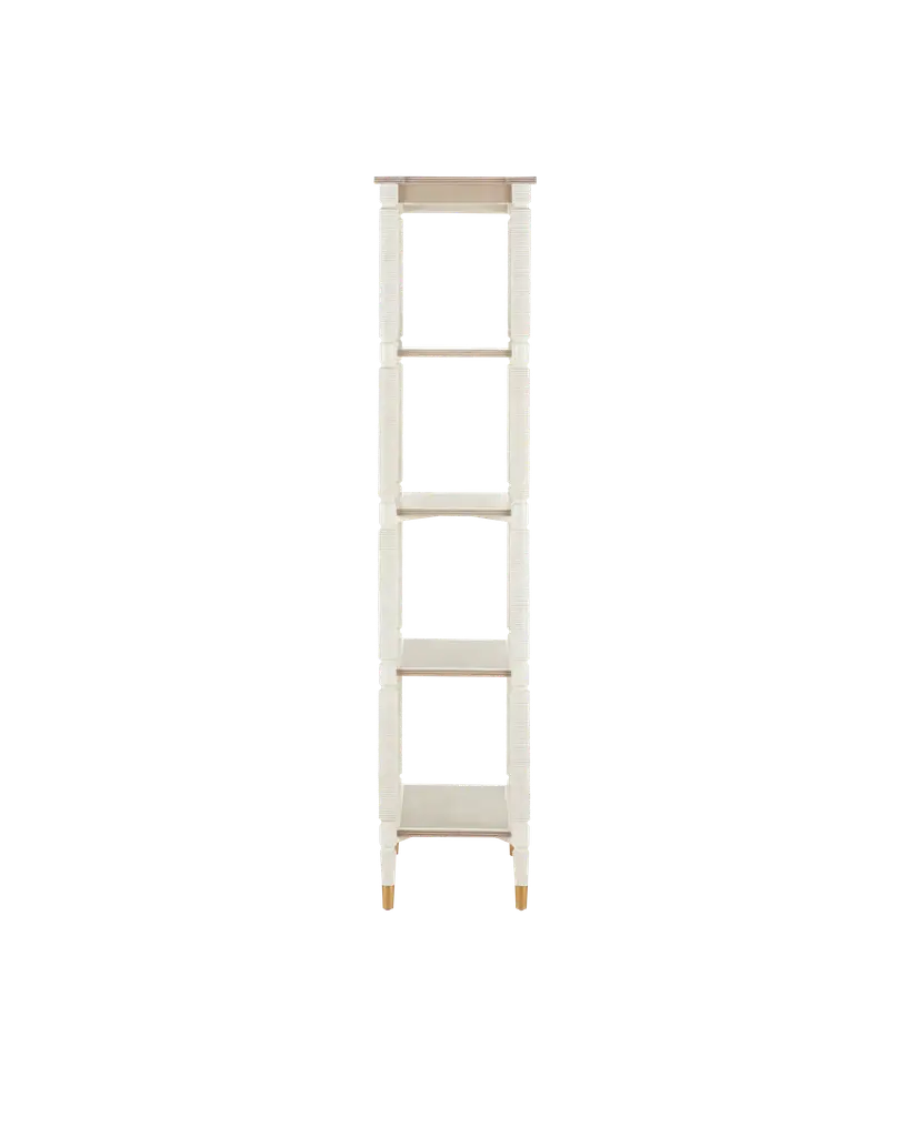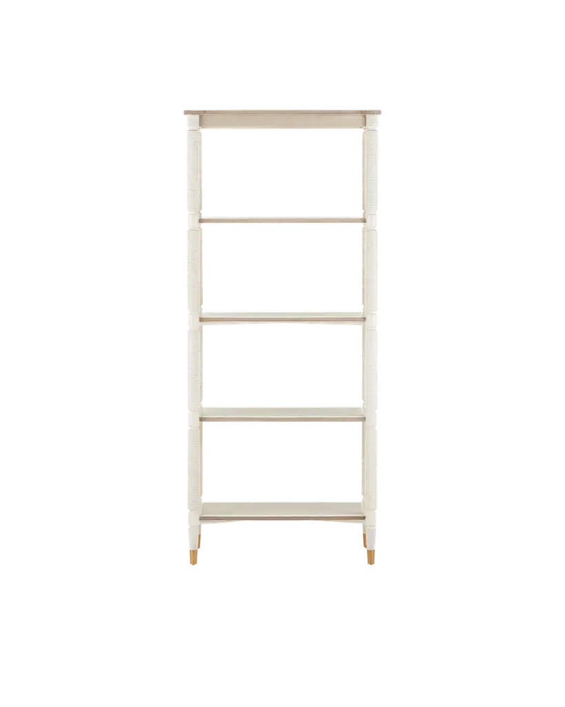 Made of mahogany and oak in a mix of off white and fog finishes, the Aster White Etagere was inspired by an antique from the Winterthur Museum. The gray and white etagere has three shelves and is fitted with brass ferrules that are warm accents in a brass finish. Wipe clean with a soft, dry cloth or static duster. Always avoid the use of harsh chemicals or abrasive cleaners as they may cause damage to the item's finish. Due to the use of natural materials, handmade craftsmanship, or hand finishing, expect some color variances. Hand crafted pieces may have slight size differences.