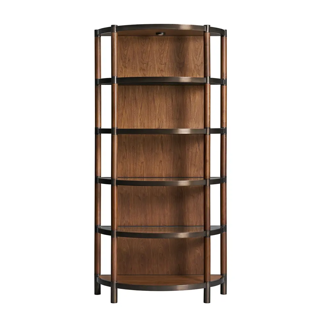 The warm Walnut wood of this Duvall Etagere pairs with the dark bronze accents to create an open but substantial bookcase. Of the five shelves, four are glass and the bottom shelf is Walnut, with an integrated lighting feature at the very top shining light all the way to the bottom. Ships In 4-5 Weeks Bronze accents Five shelves Walnut construction This image is for illustrative purposes only. The colors shown are accurate within the constraints of lighting, photography, and the color accuracy of your screen.