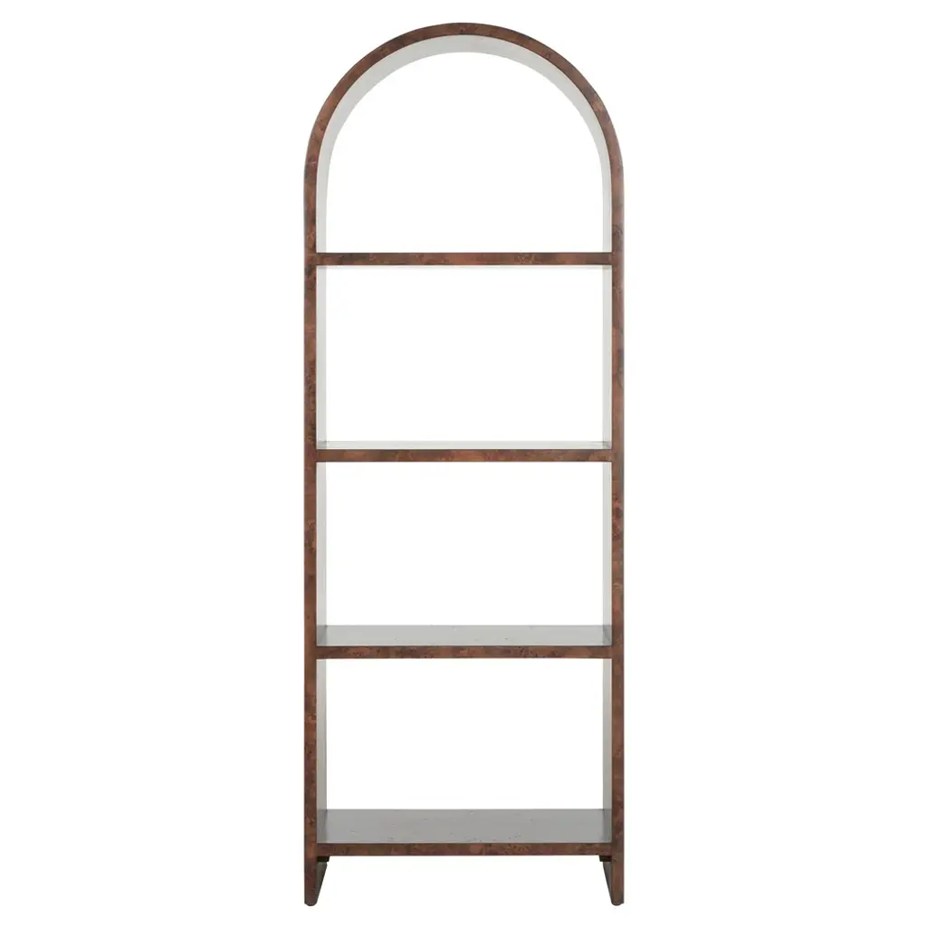 The warm Walnut wood of this Duvall Etagere pairs with the dark bronze accents to create an open but substantial bookcase. Of the five shelves, four are glass and the bottom shelf is Walnut, with an integrated lighting feature at the very top shining light all the way to the bottom. Ships In 4-5 Weeks Bronze accents Five shelves Walnut construction This image is for illustrative purposes only. The colors shown are accurate within the constraints of lighting, photography, and the color accuracy of your screen.