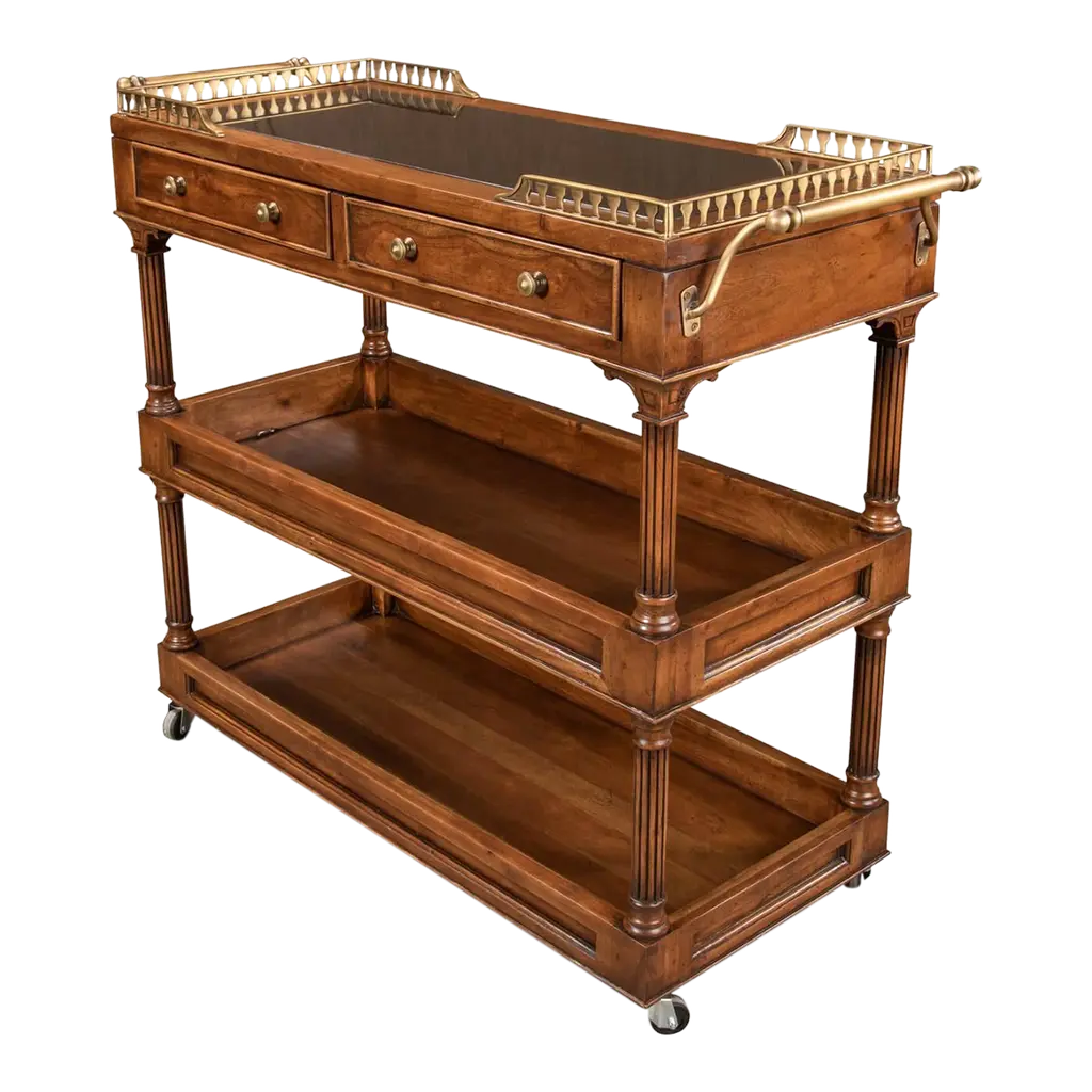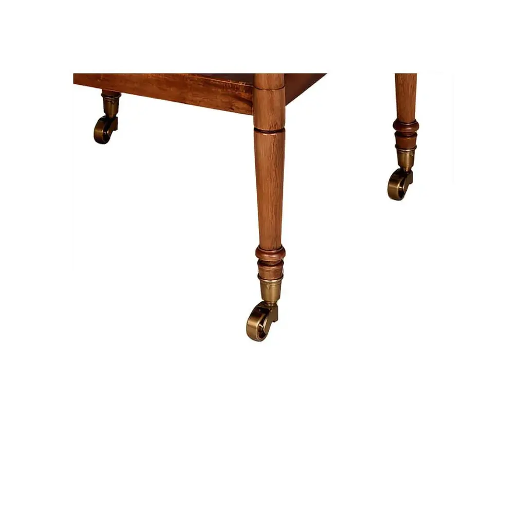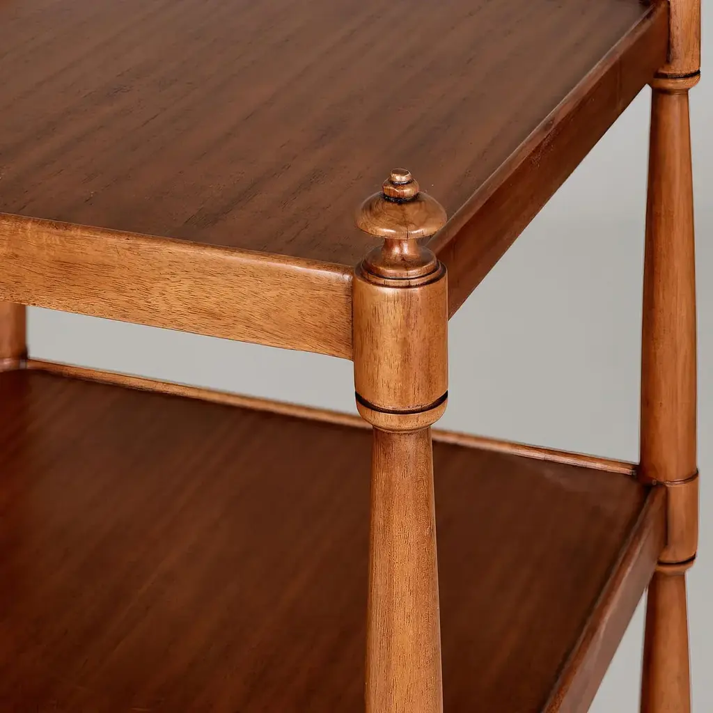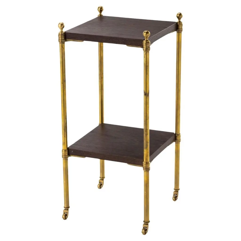 A timeless piece designed to add a touch of sophistication to any room, its meticulously composed of three tiers to provide both functionality and visual appeal. The acacia wood finished with a mid-oak stain exudes warmth and character, while the handmade brass castors showcase the craftsmanship and attention to detail that went into creating this exquisite piece. Dimensions: 15.25" W x 15.25" D x 29.25" H