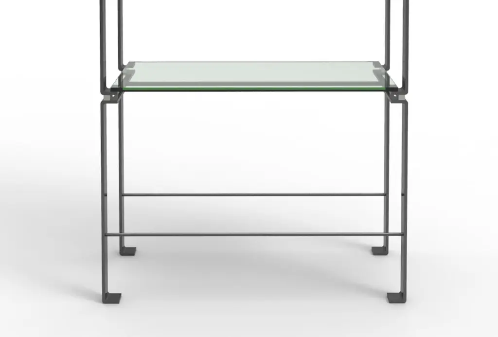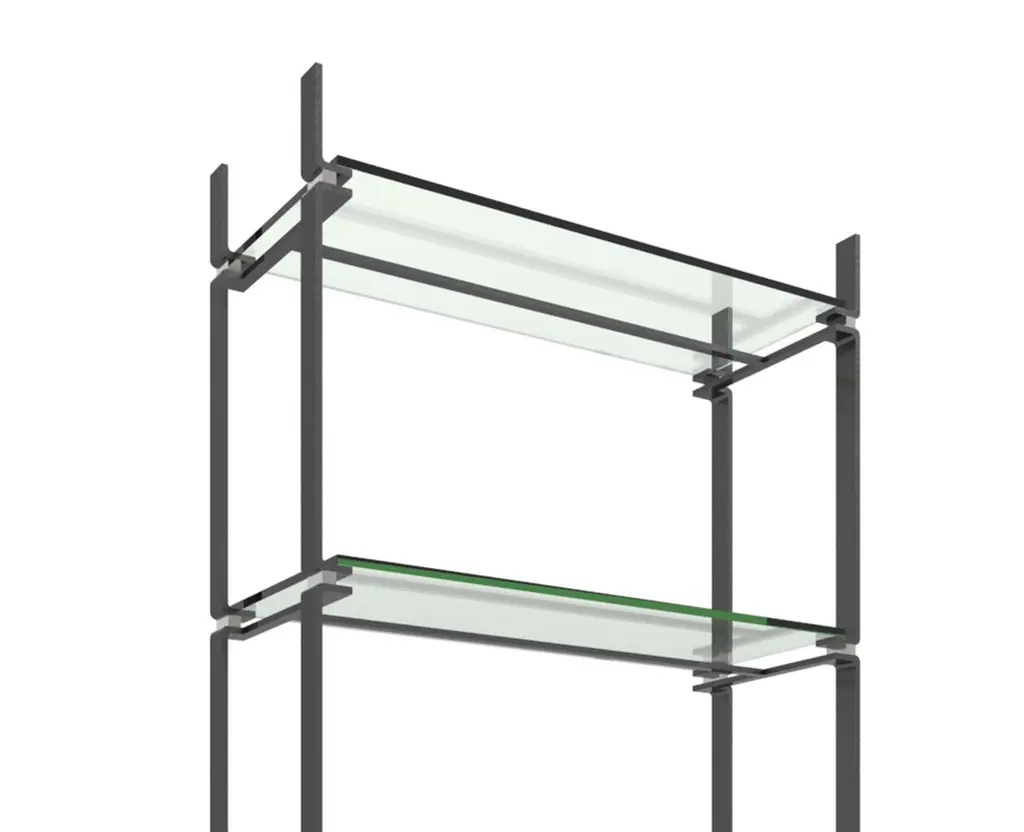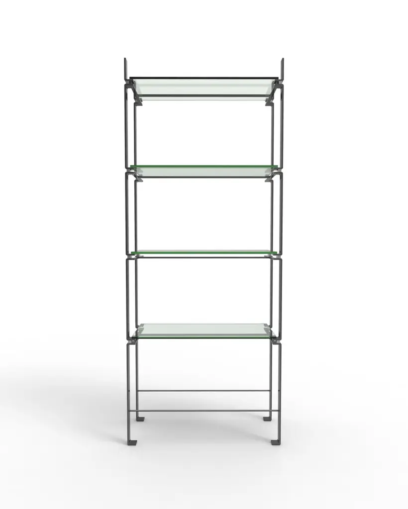 Etagere shelves by Gentner DesignDimensions: D 35.5 x W 91 x H 238 cmMaterials: stainless steel, glassAvailable in other sizes.Visually delicate, the contrasting materials of polished stainless steel and glass give the pieces its character. Uniquely detailed in structure, the piece appears as though it can go on infinitely. Available in infinite widths.Gentner DesignRooted in a language of sculpture, character defining details, and world renowned craftsmanship, the work is found at the crossroads of design and art.Established in 2011, the namesake furniture label is a rare combination of aesthetic dexterity and mastery of craft resulting in furniture and objects that are expressive, formal, and transcend materiality.The collection is based in metal and incorporates only natural materials such as leather, wood, and glass in unique ways, challenging our assumptions.Christopher GentnerChristopher Gentner, with a BFA in metalsmithing from the Cleveland Institute of Art and apprenticeships under sculptors and jewelers, together with dedication to craft, quickly developed his reputation nationally as a foremost authority of metal fabrication and furniture.One of his crowning achievements was the re-creation and fabrication of the Frank Lloyd Wright Robie House gates.These unique experiences are the foundation of his design philosophy which he employs in his own line of furniture, lighting, and objects.