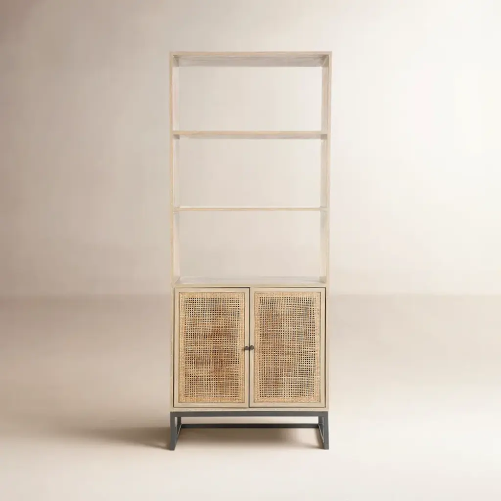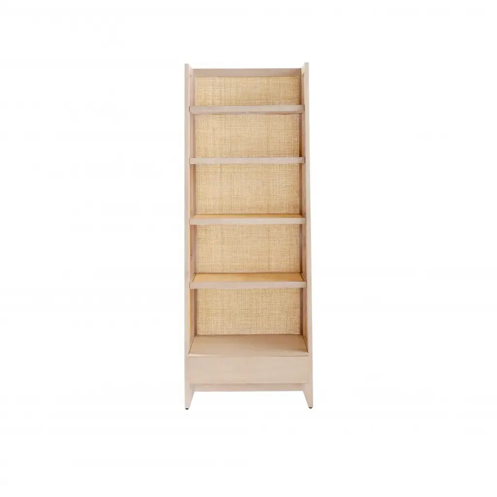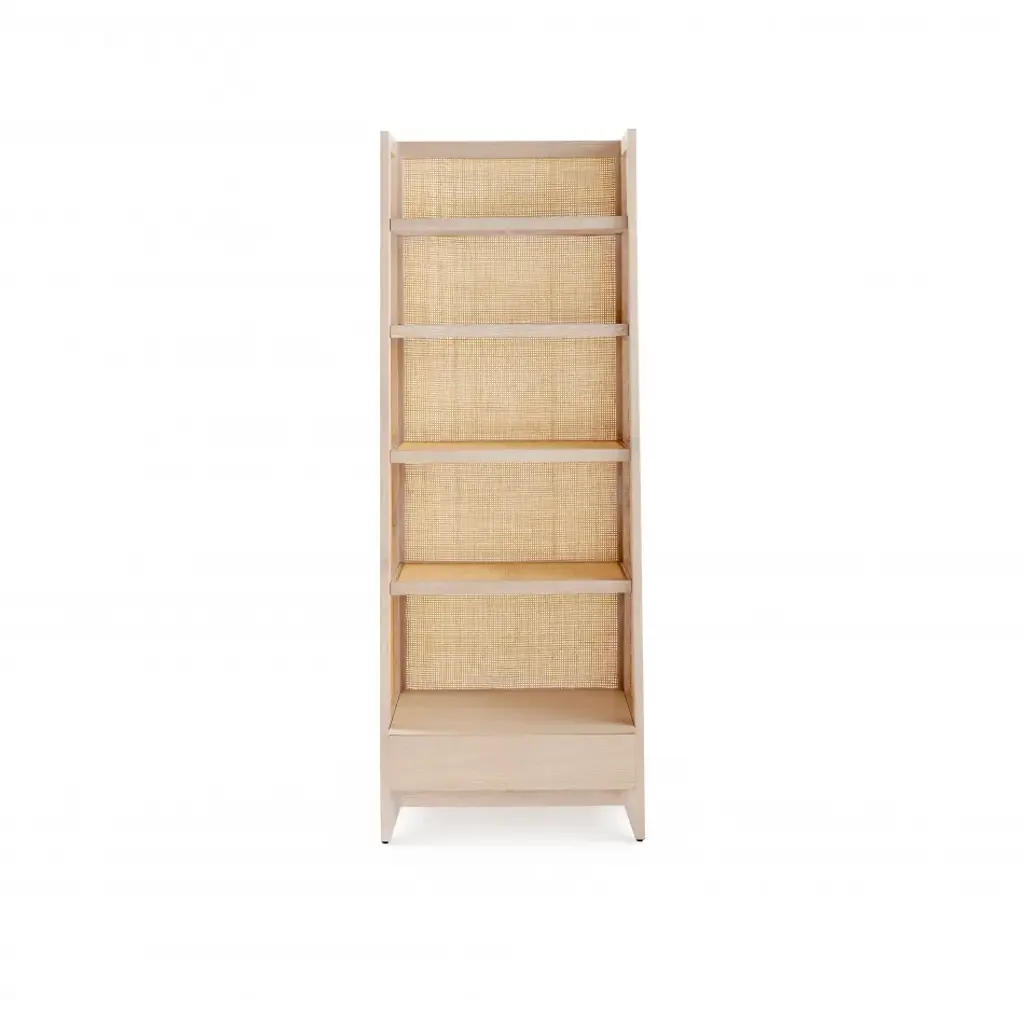 The Evan Collection is a modern minimalist's dream come true. Combining inspiration from Scandinavian and Japanese design, this collection is simple, clean, and uses an elegant combination of natural materials. Each piece is comprised of straight grain Bleached Cerused Oak and Bleached Cane Panels. The etagere has four fixed shelves, and one bottom drawer with a veneered interior and soft closing glides. The sides of the unit are slightly angled and tapered. Designed with a lip under the drawer rather than a metal pull, there's no extraneous hardware to conflict with the natural, simple, and elegant appeal of the piece. This etagere makes an excellent bookcase for your living room or office.