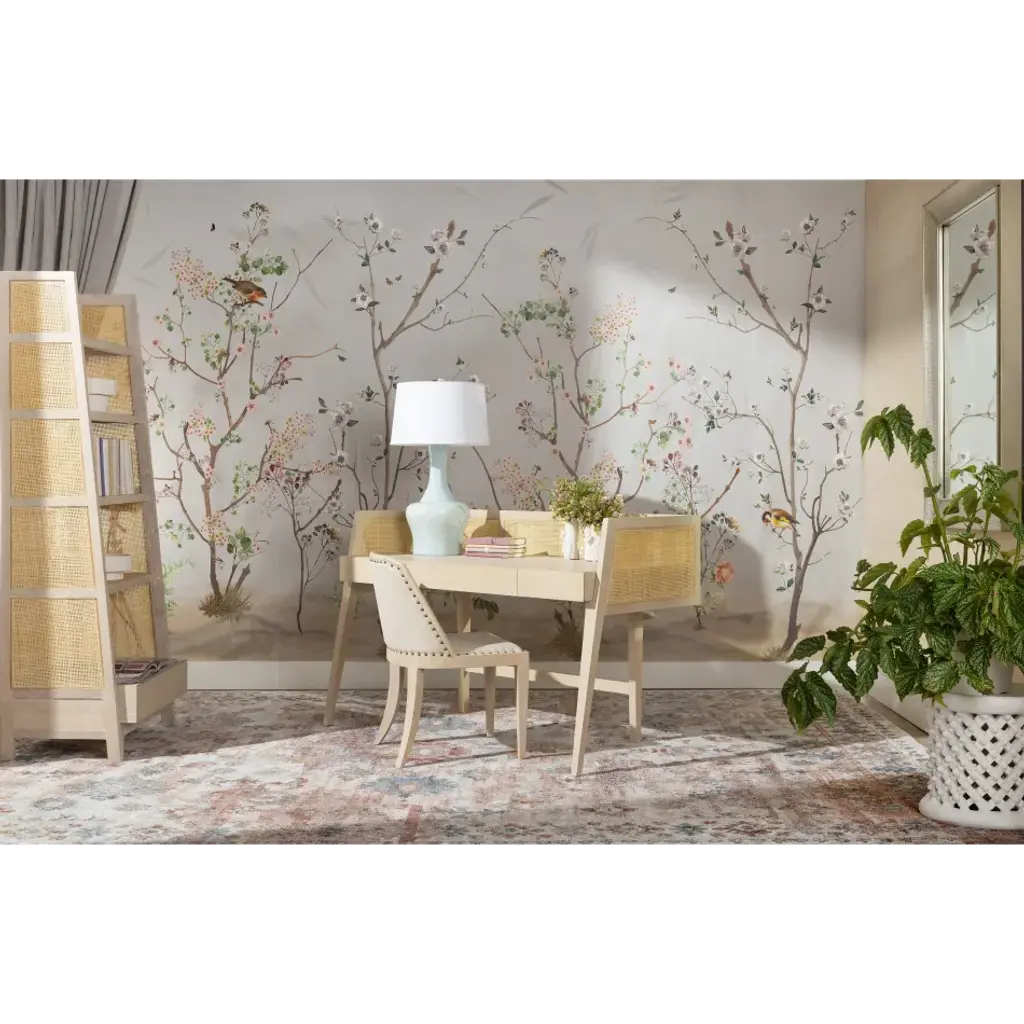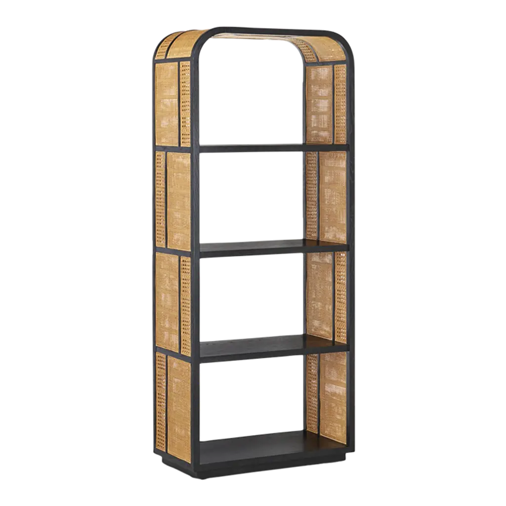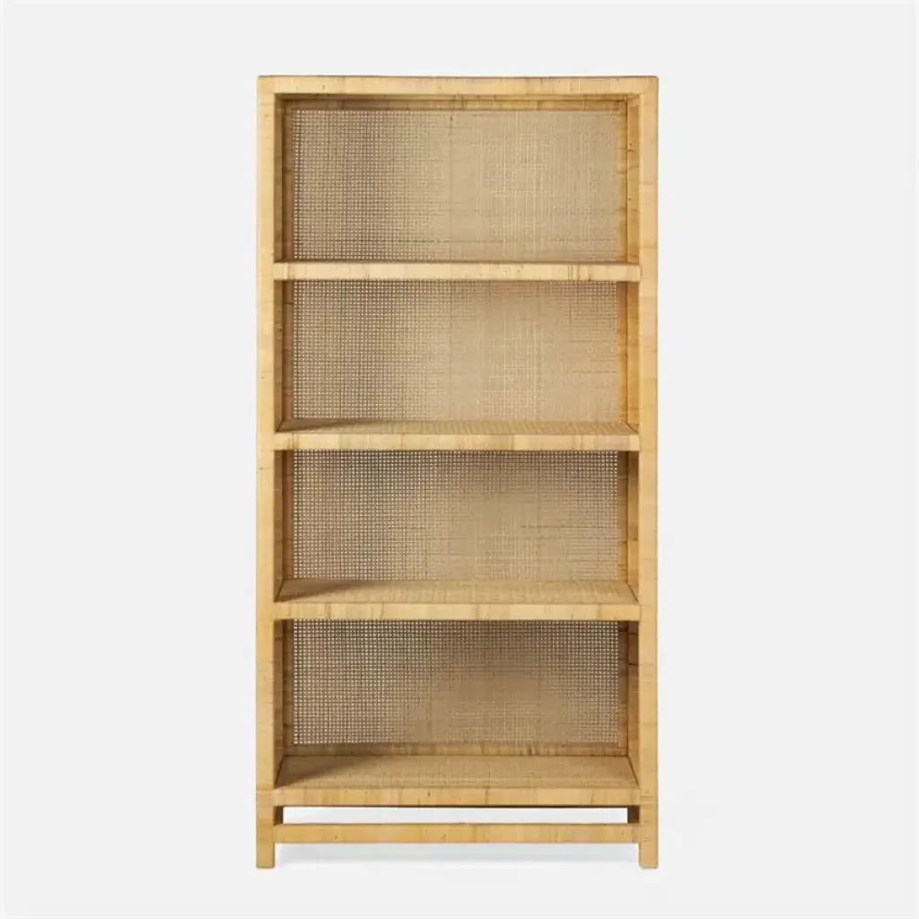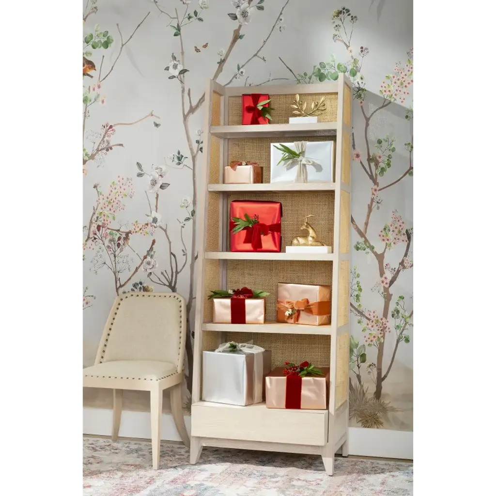 The Evan Collection is a modern minimalist's dream come true. Combining inspiration from Scandinavian and Japanese design, this collection is simple, clean, and uses an elegant combination of natural materials. Each piece is comprised of straight grain Bleached Cerused Oak and Bleached Cane Panels. The etagere has four fixed shelves, and one bottom drawer with a veneered interior and soft closing glides. The sides of the unit are slightly angled and tapered. Designed with a lip under the drawer rather than a metal pull, there's no extraneous hardware to conflict with the natural, simple, and elegant appeal of the piece. This etagere makes an excellent bookcase for your living room or office.