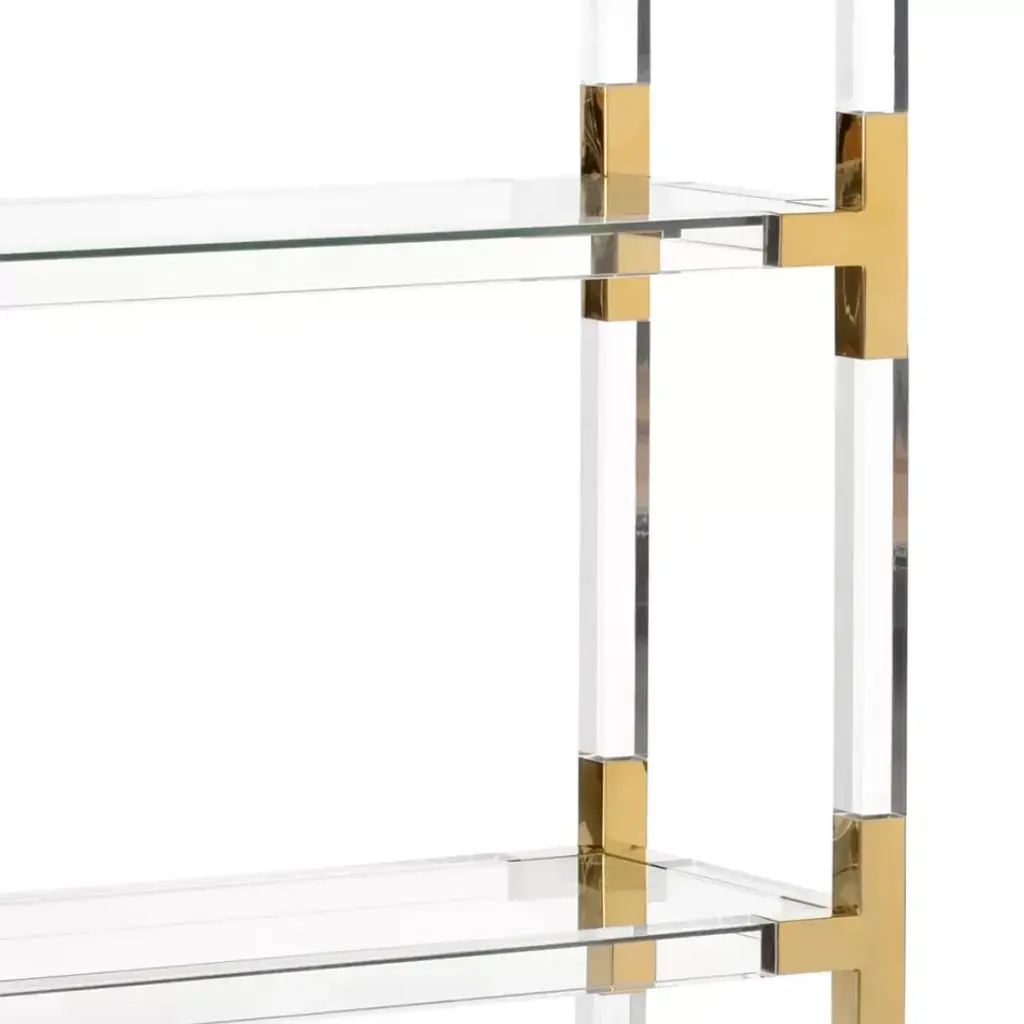Five Shelf Acrylic Etagere With Gold Metal Supports And Glass Shelves.