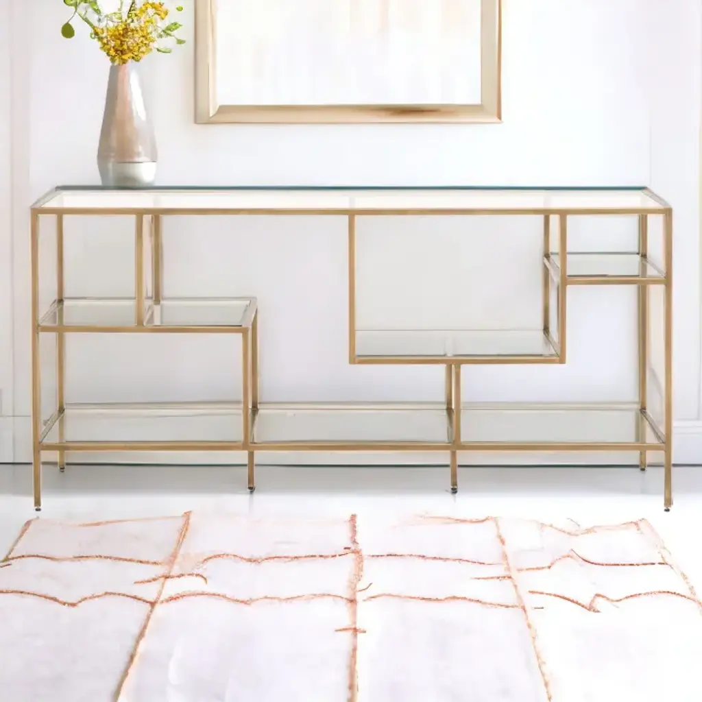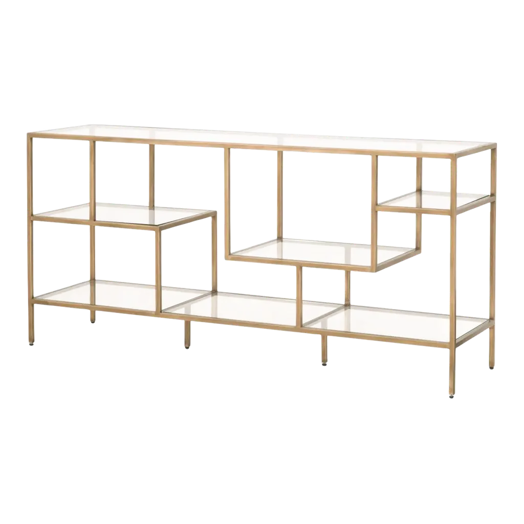 With the perfect fusion of style and functionality, this golden bookcase is sure to enhance any room or office. This transitional piece measures 59" wide, 16" deep, and 28.5" high and makes a stunning statement with its unique geometric design. The bookcase's frame is crafted from metal with a beautiful brass finish, which perfectly complements the clear tempered glass shelves. The metal shelving system provides a stable and durable structure, perfect for displaying your favorite books, decorative items, and other office or living essentials. Enhance your living room, bedroom, or office space with this versatile and elegant piece, designed to elevate your home decor and provide practical storage solutions. Golden Low Bookcase Features & Benefits: Metal Shelving System Tempered Glass Shelves Unique Geometric Design Tip Kit Included Materials: Metal, Tempered Glass Base Dimensions: W:59" D:16" H:28.5" Weight:66lbs