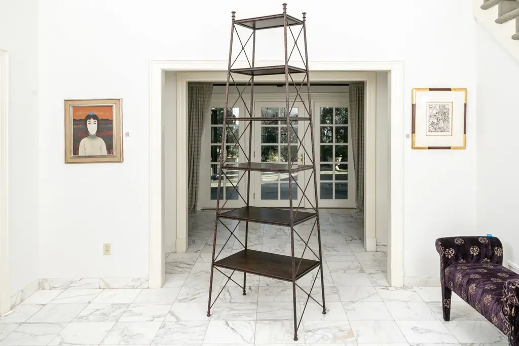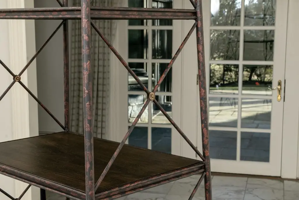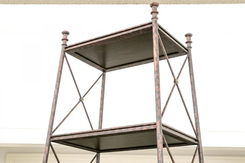 Grand Vintage Faux Tortoise Wrought Iron Obelisk Shaped Six Tier Bookcase Industrial Style Etagere
