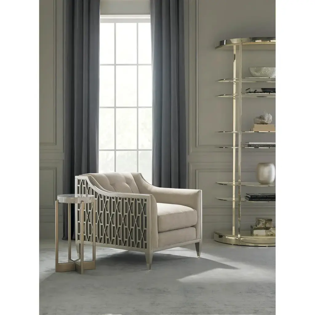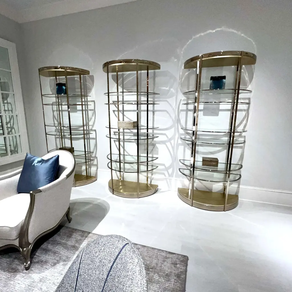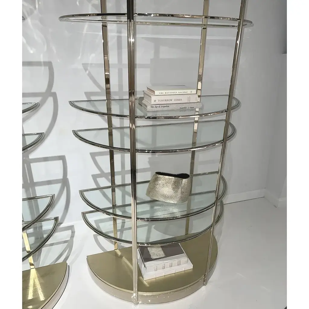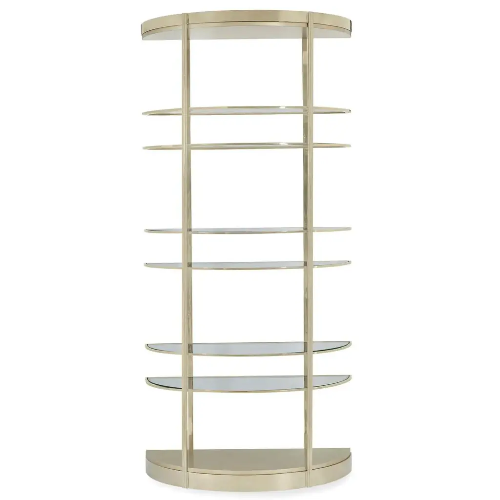 An etagere with a light and airy design. The tall frame has been given a high polished gold finish and surrounds each of the six semi-circular glass shelves. DIMENSIONS 39" W x 18.5" D x 85.5" H Small shelf opening height: 6" Large shelf opening height: 14.875"