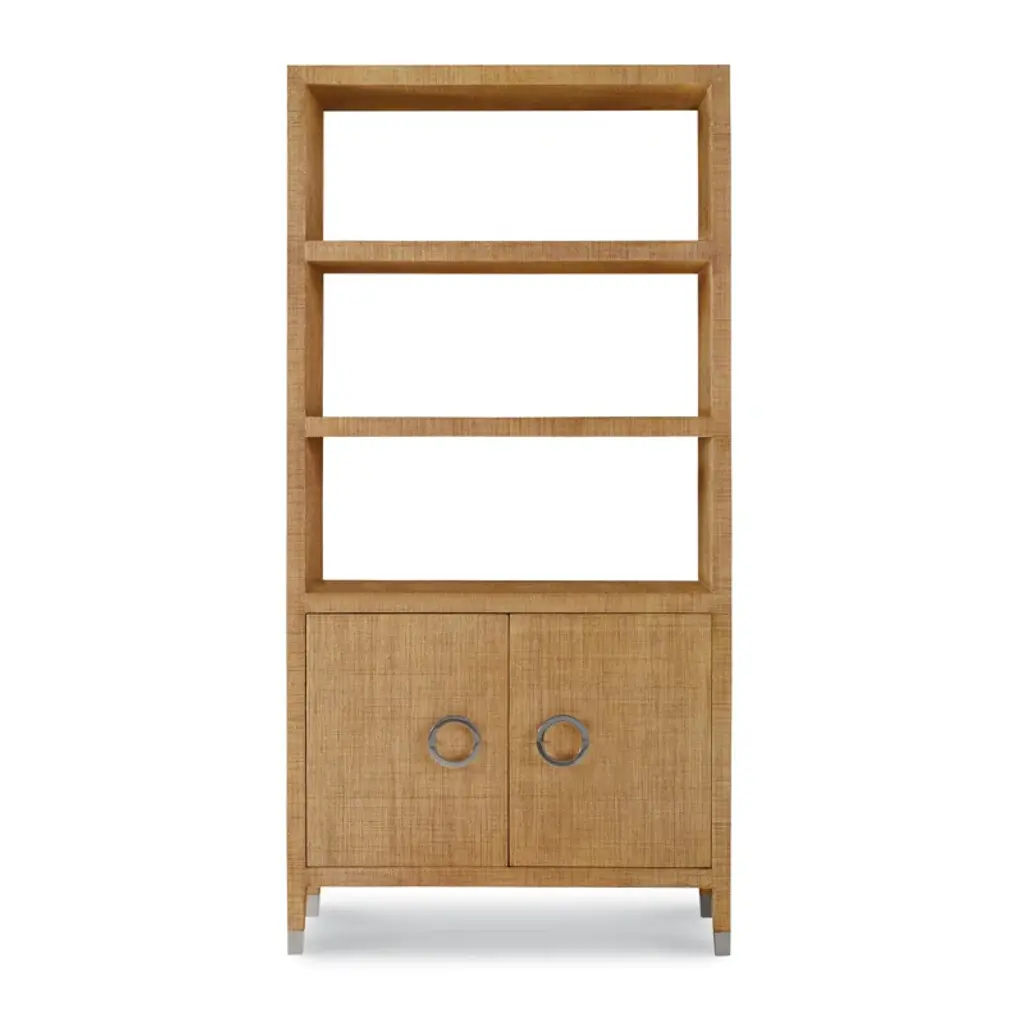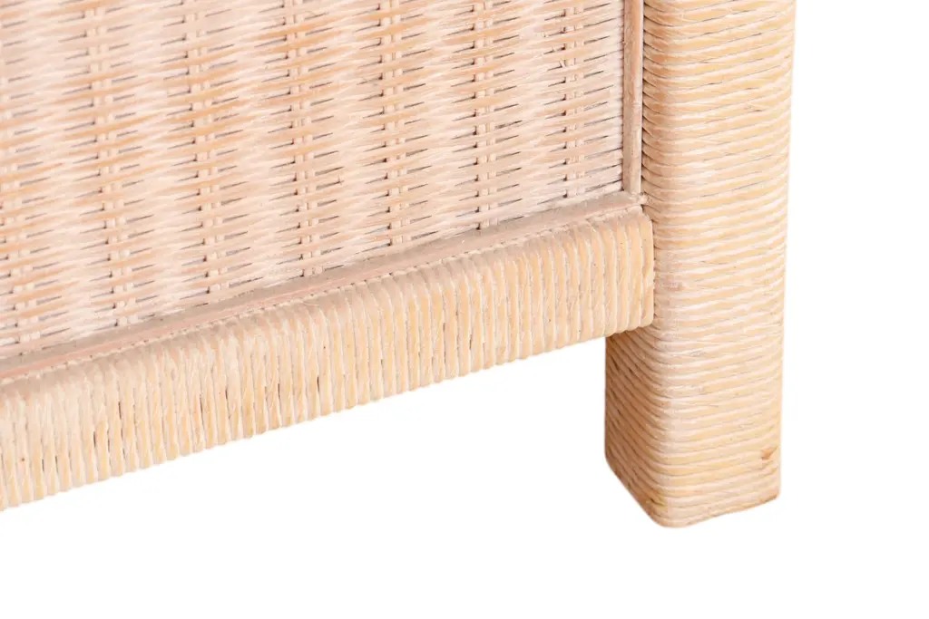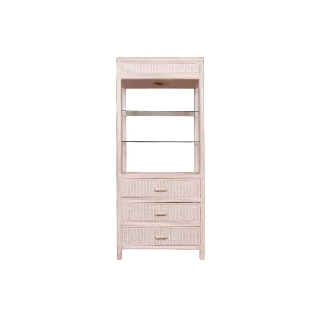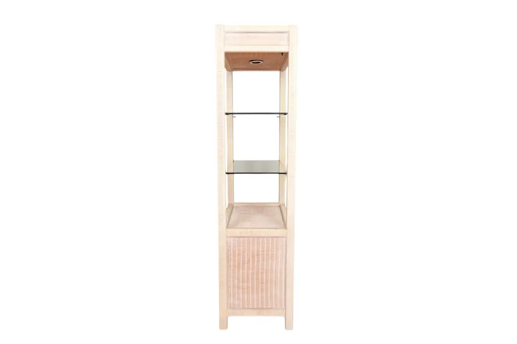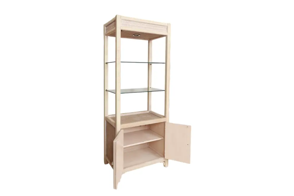 A rattan and glass cabinet designed by Henry Link for Lexington Furniture Company. Lit with a single light above two glass shelves, that rest in a white-washed rattan wrapped open frame. At the base is a cabinet that houses a single shelf, cabinet doors open with woven rattan knob handles.