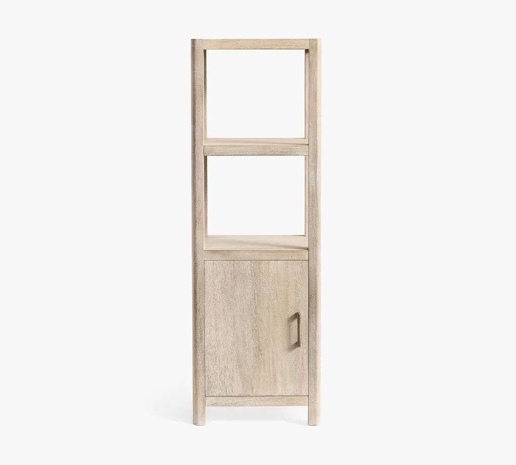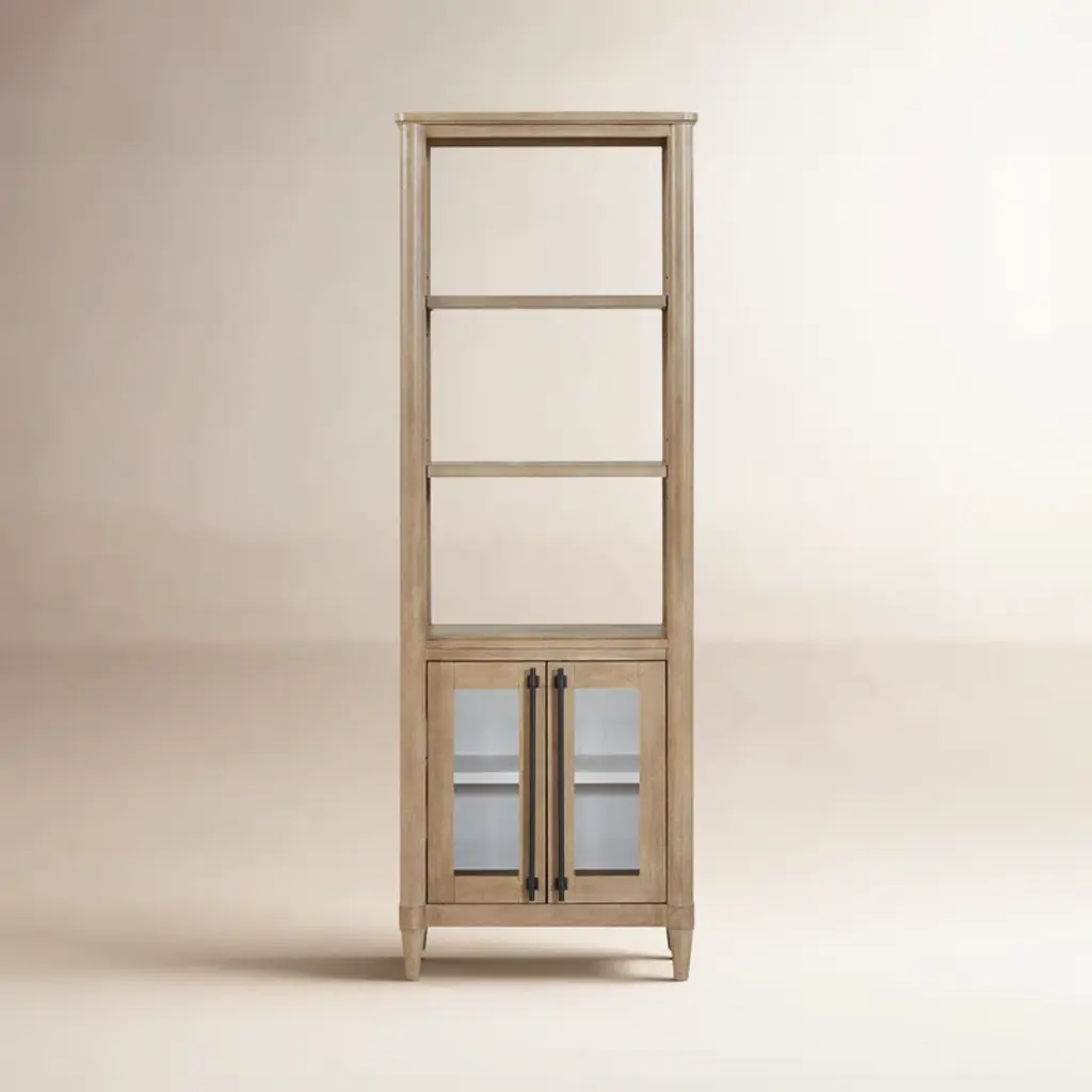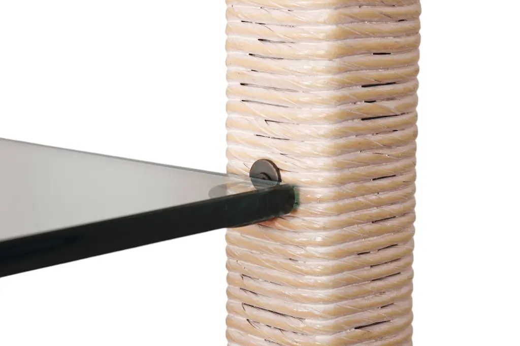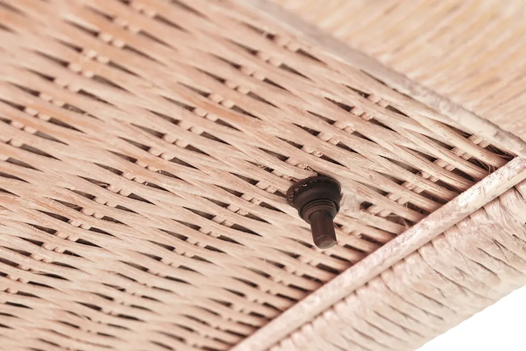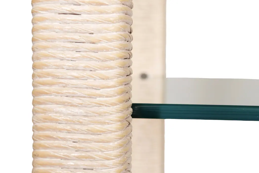 A rattan and glass cabinet designed by Henry Link for Lexington Furniture Company. Lit with a single light above two glass shelves, that rest in a white-washed rattan wrapped open frame. At the base is a cabinet that houses a single shelf, cabinet doors open with woven rattan knob handles.