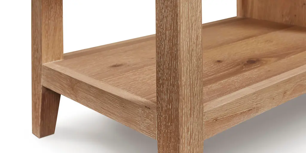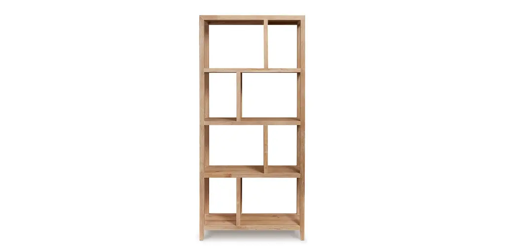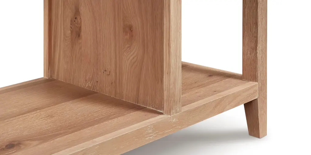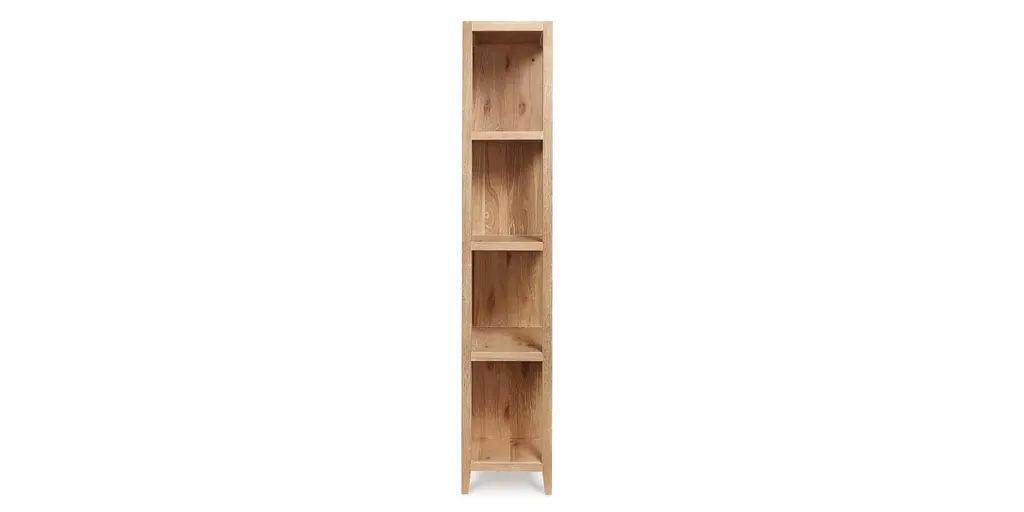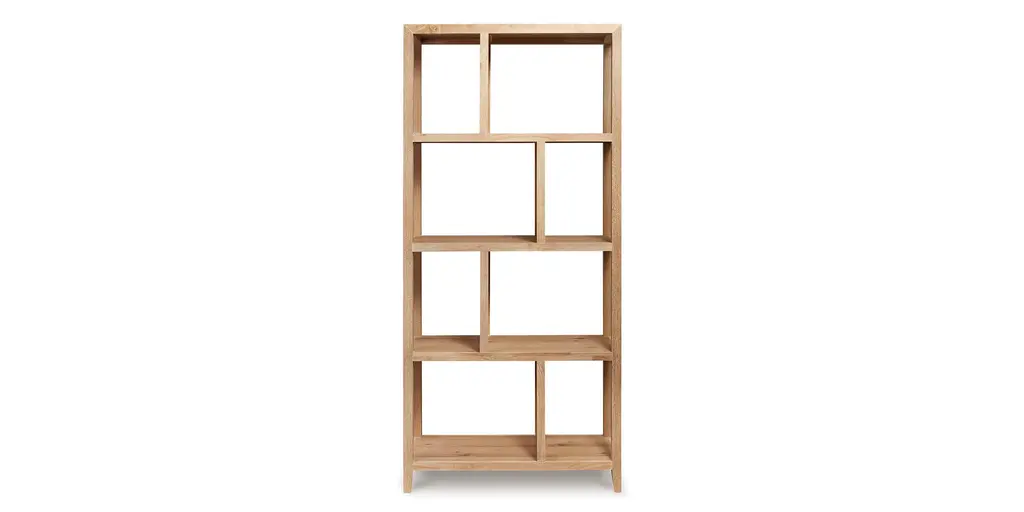 Modern and sleek, the Highland Etagere adds style to any space in your home. Made of white and oak solids and veneers, the blonde oak finish highlights the natural wood grain and for a gently distressed look. The four shelves are symmetrically designed with alternating spaces of 12 inches and 22 inches wide and 18 inches high. At 16 inches in depth, the Highland Etagere offers maximum storage with a compact footprint in your space.