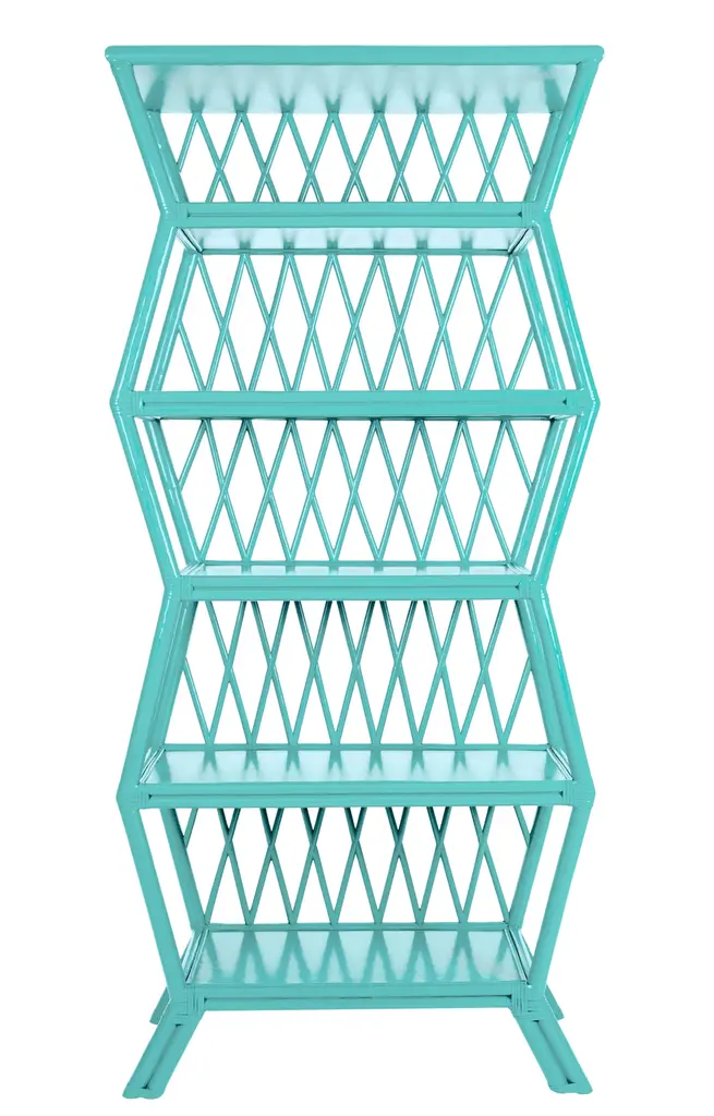 In a whimsical geometric style, this étagère features a rattan frame, rawhide bindings and five wood shelves. Each David Francis table is hand-finished and made to order, please allow time for delivery.