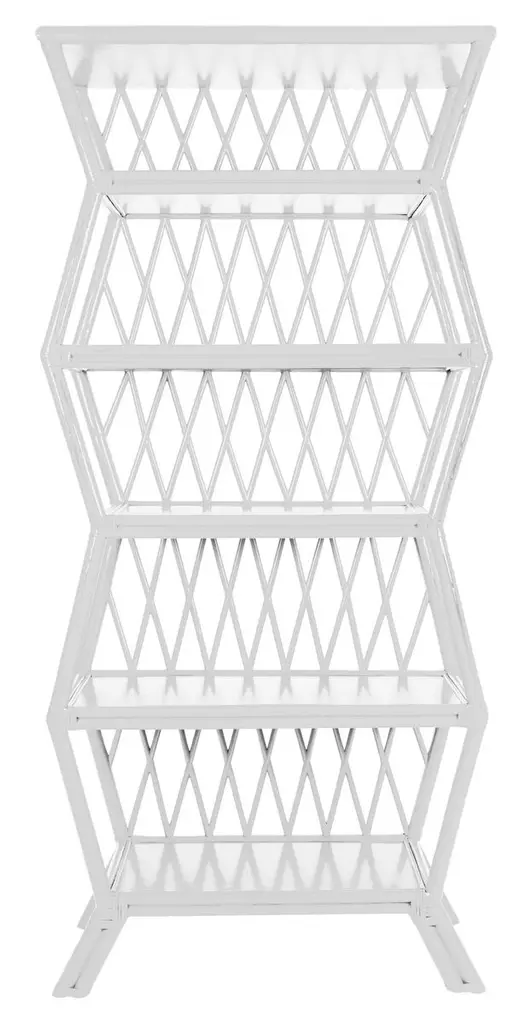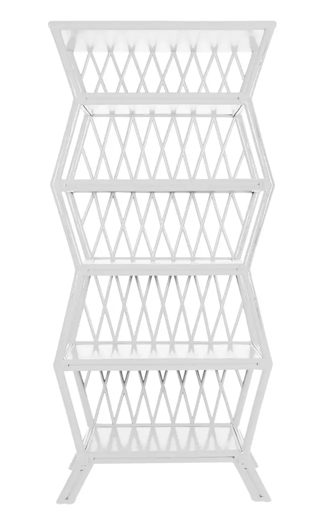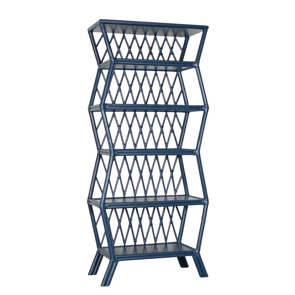 In a whimsical geometric style, this étagère features a rattan frame, rawhide bindings and five wood shelves. Each David Francis table is hand-finished and made to order, please allow time for delivery.