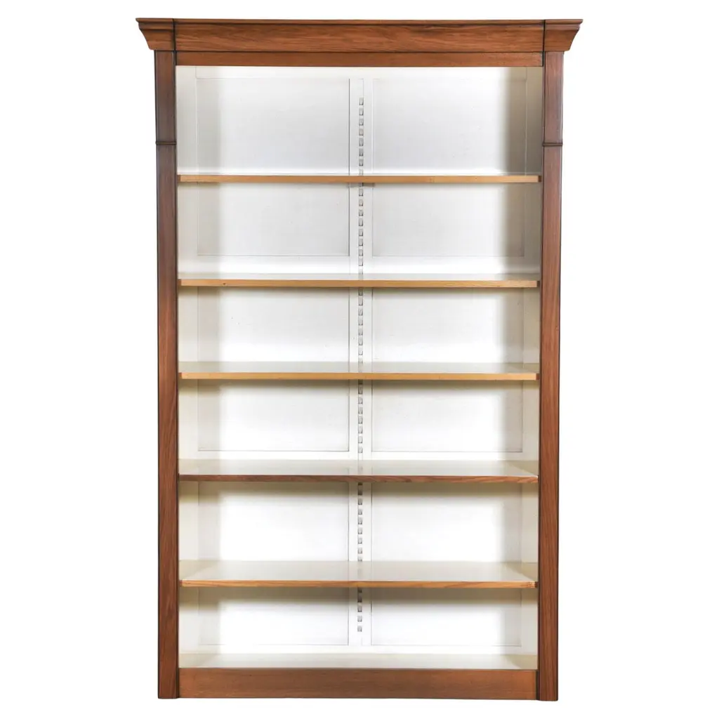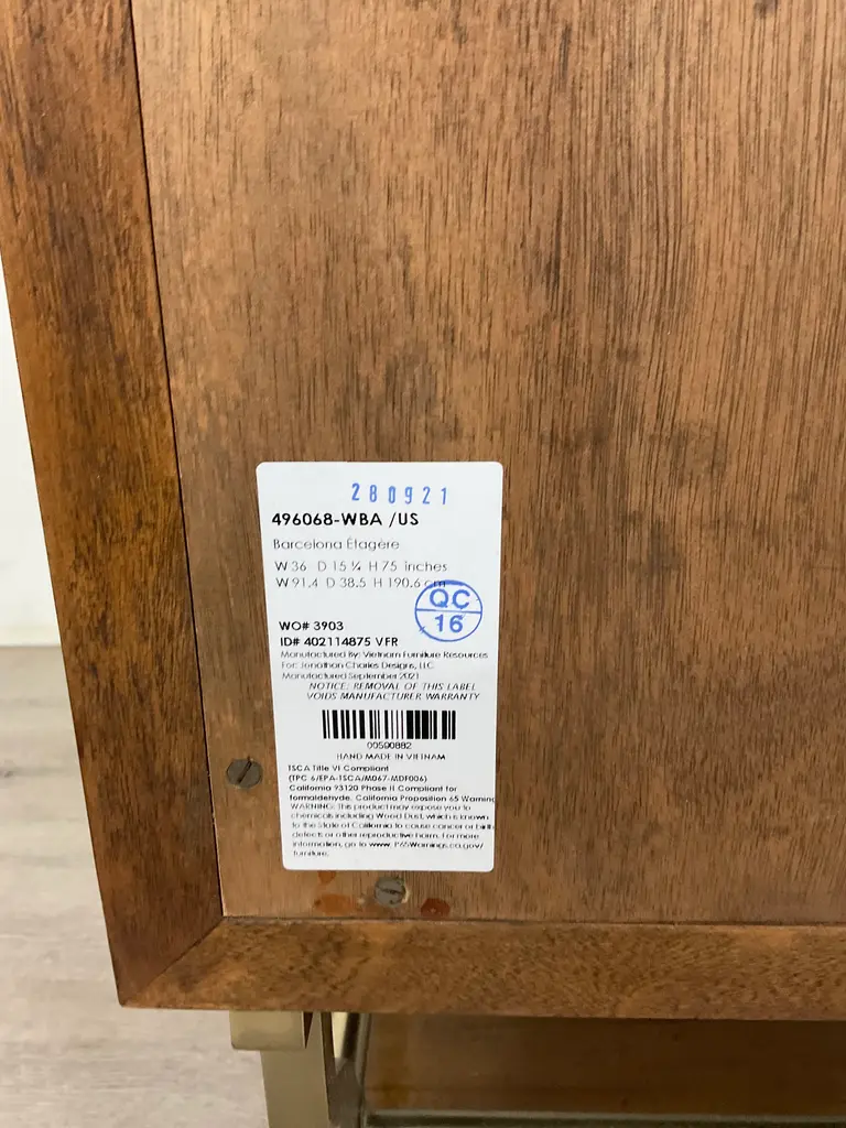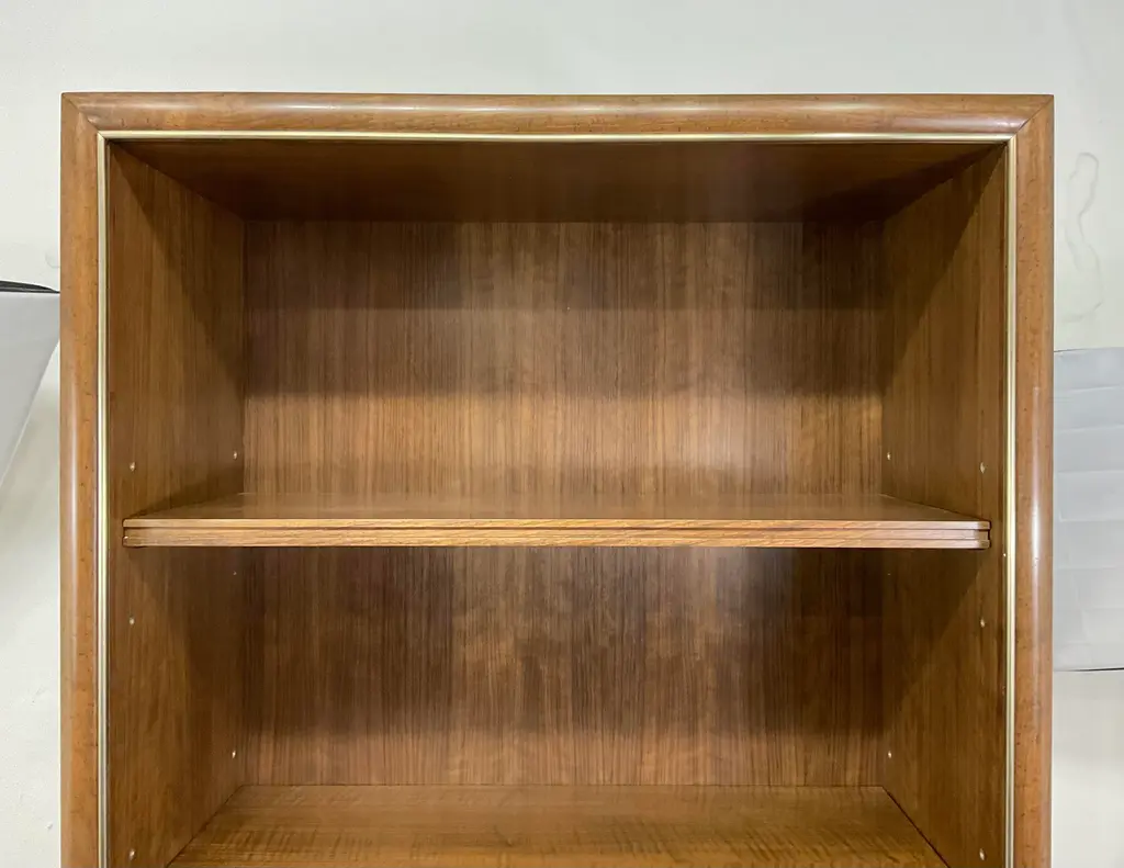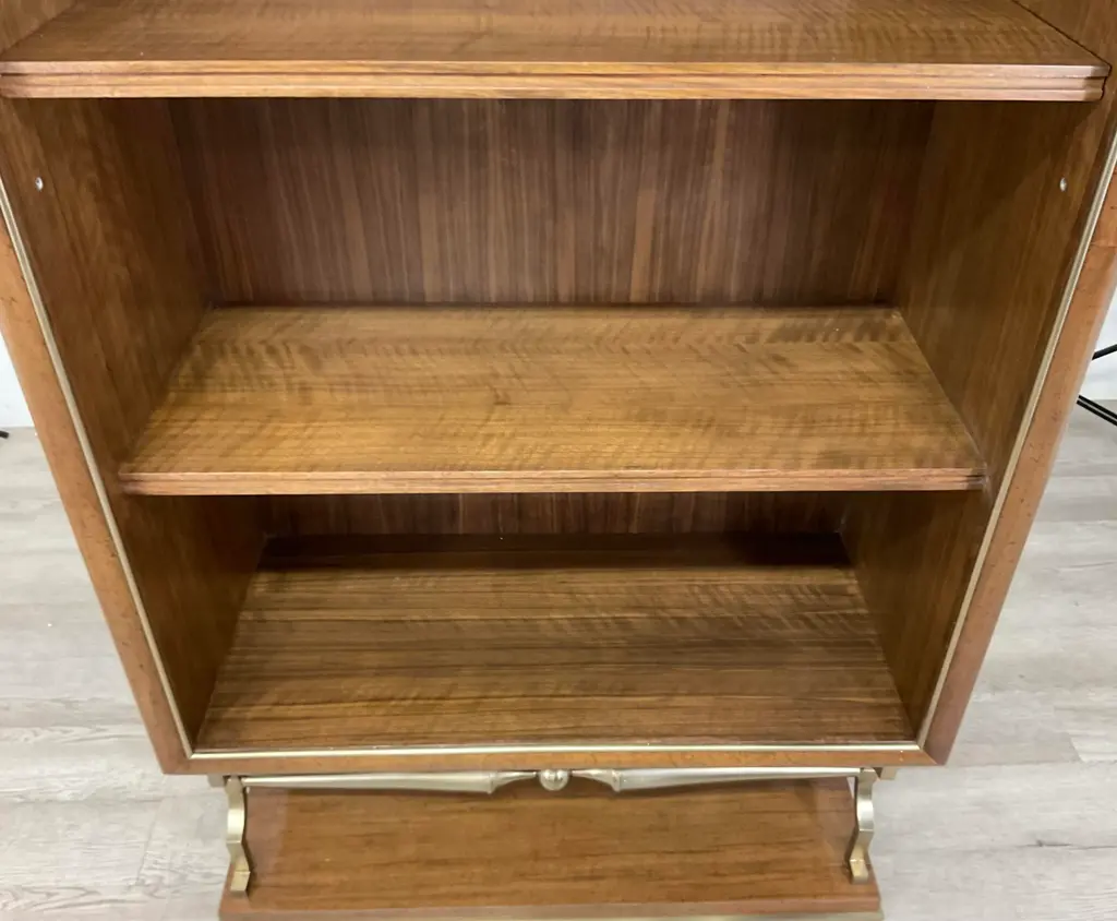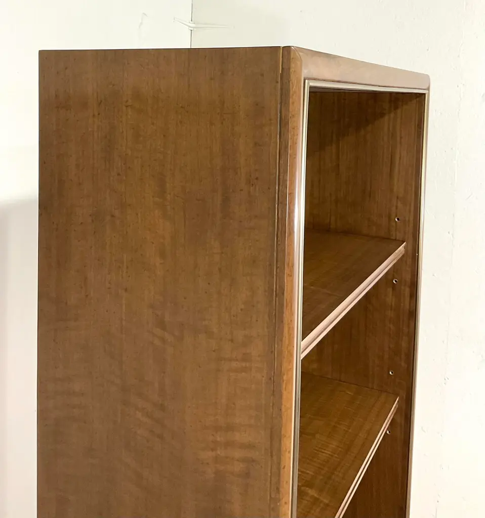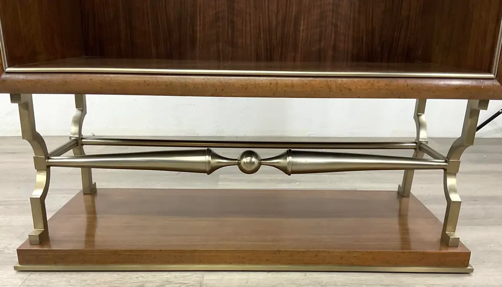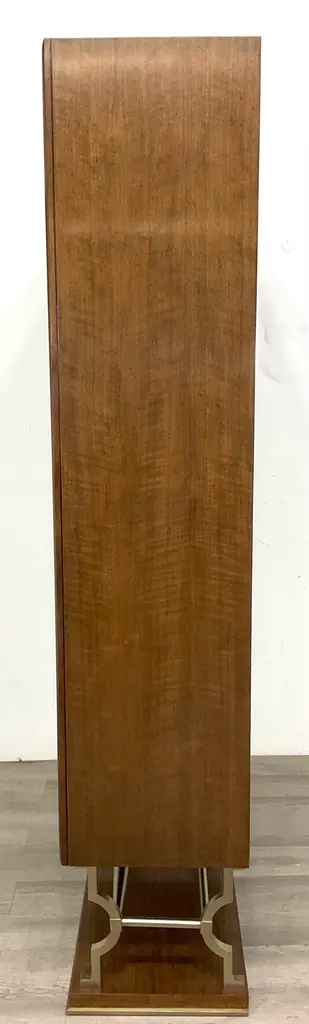 Original retail $6535, stylish Jonathan Charles Modern Barcelona Etagere, walnut finished, three adjustable shelves, champagne accents, showroom floor sample