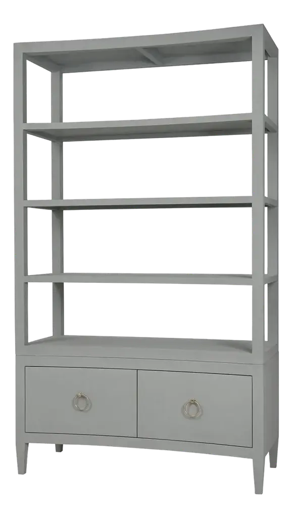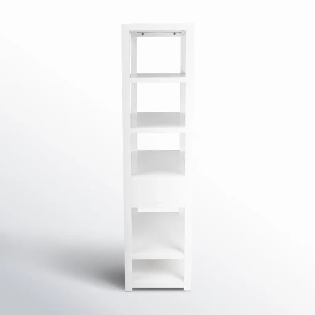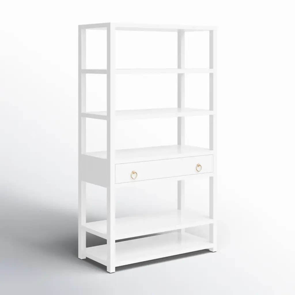 The tall bookcase is Transitional Modern with a " pop "of color and a glam of Gold Metallic hardware to enjoy in every room space. The colorway of the brushed wood veneers lend a beauty and elegance to the style. The functional 5 shelves offer fantastic storage space while the storage drawer is adorned with gleaming metallic gold statement hardware. The simplicity of this design allows storage to be prominently displayed while surrounded by color to enhance every room. The statement of color and glam is all yours with this style and the coordinating style pieces.